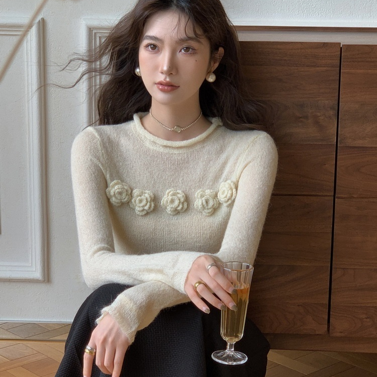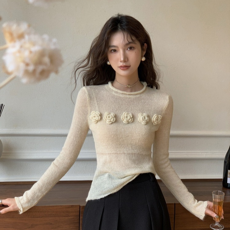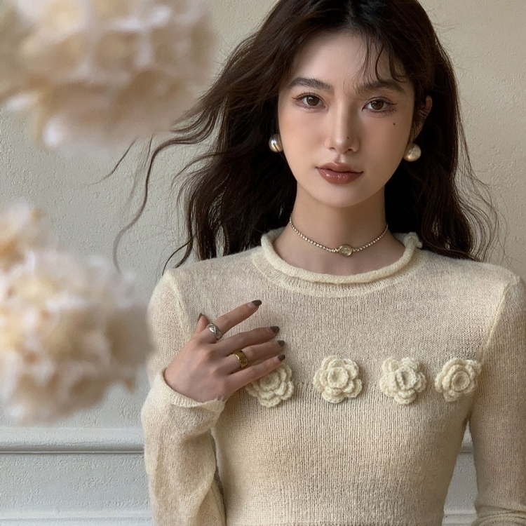Micro Transparent Flower Sweater New Korean Version Elegant Round Neck Knitted Top