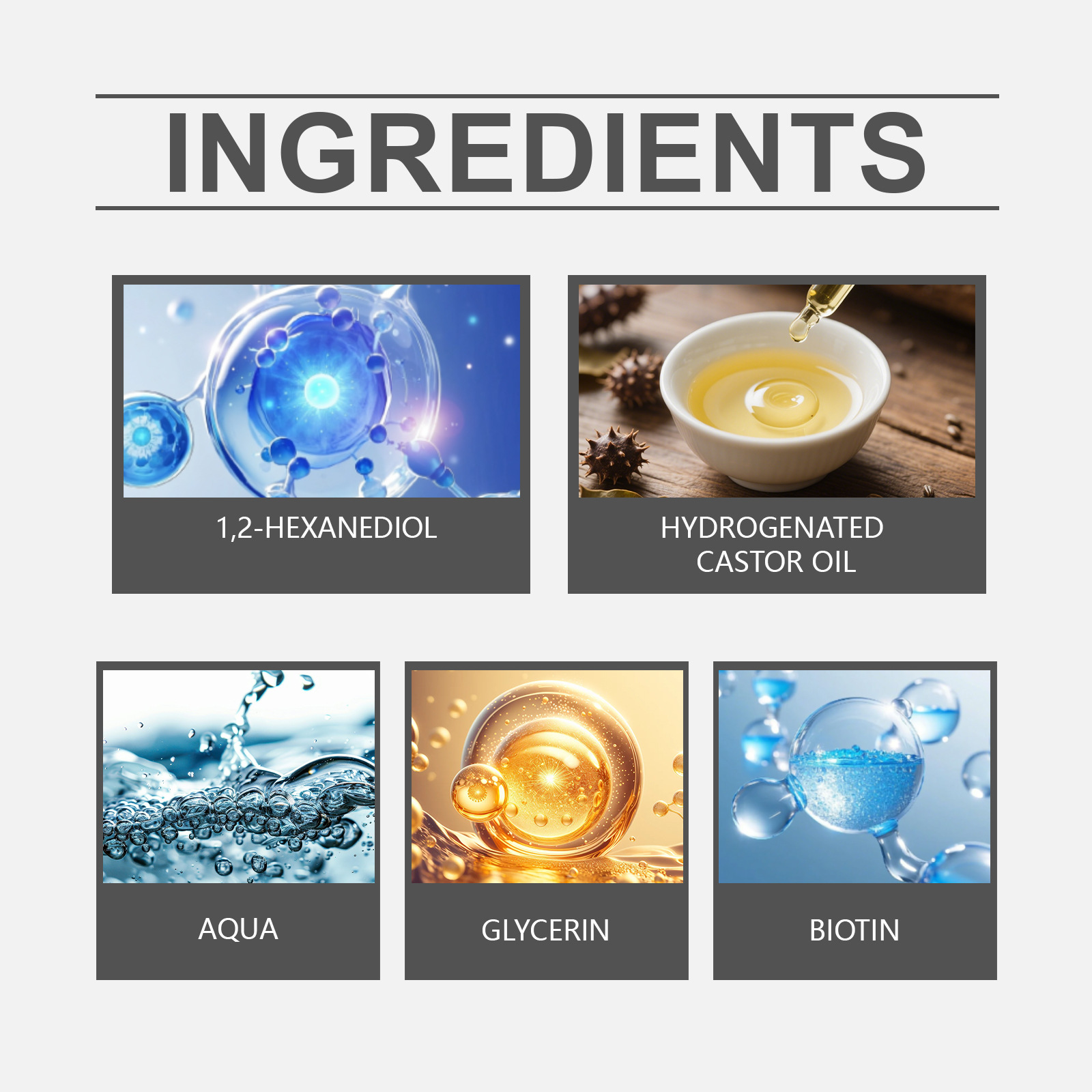 Product information:Ingredients: water, glycerin, hydrogenated castor oil, 1,2-hexanediol, biotin.