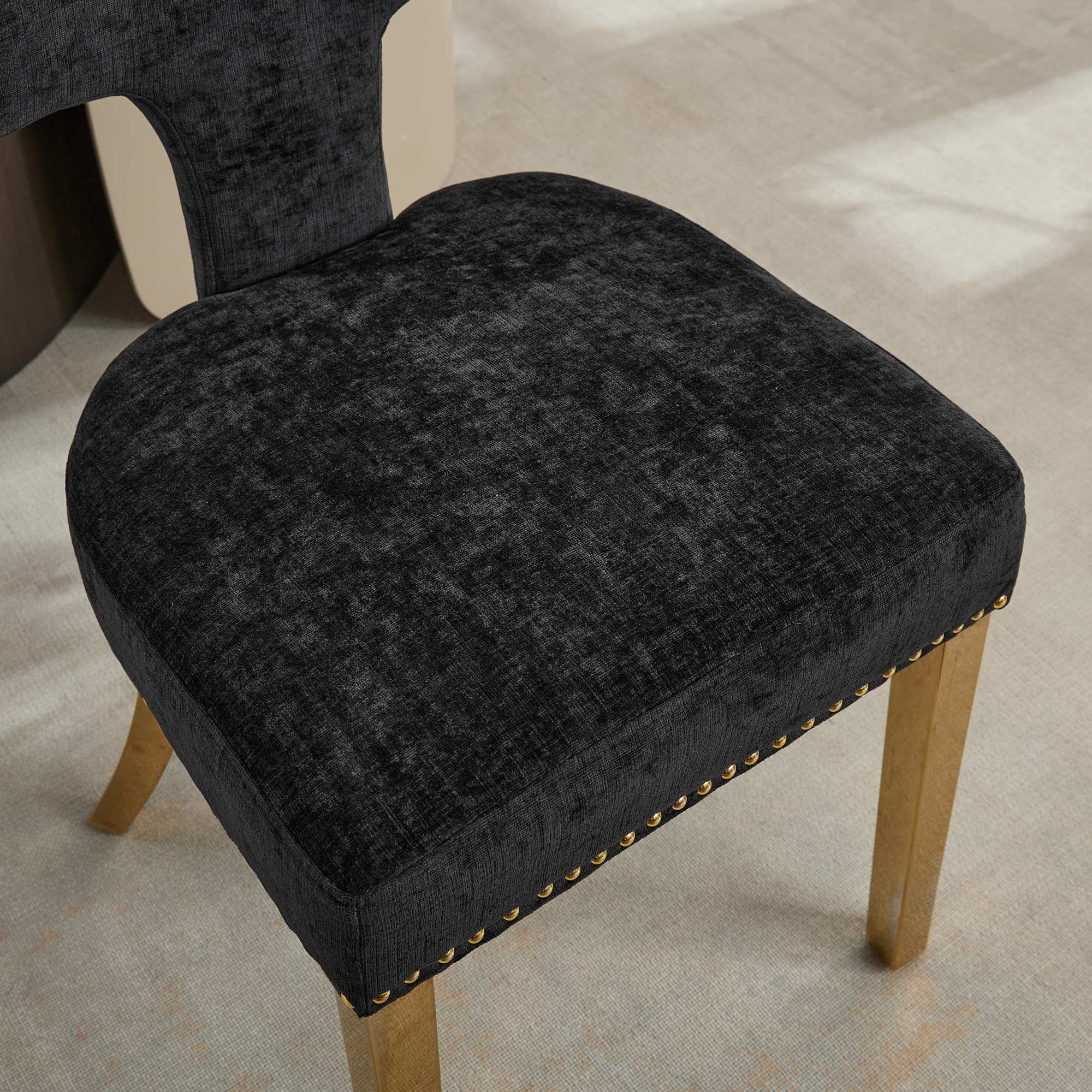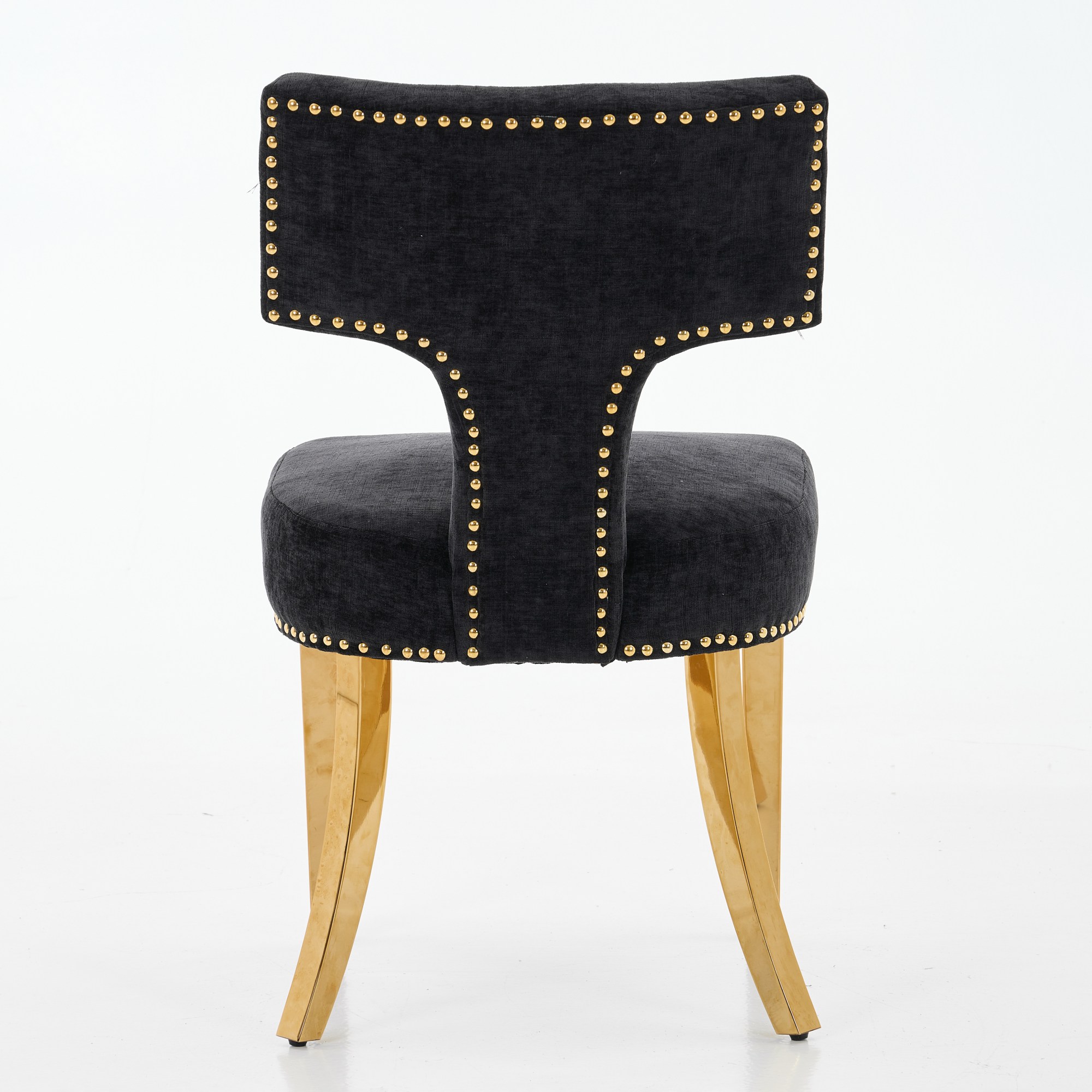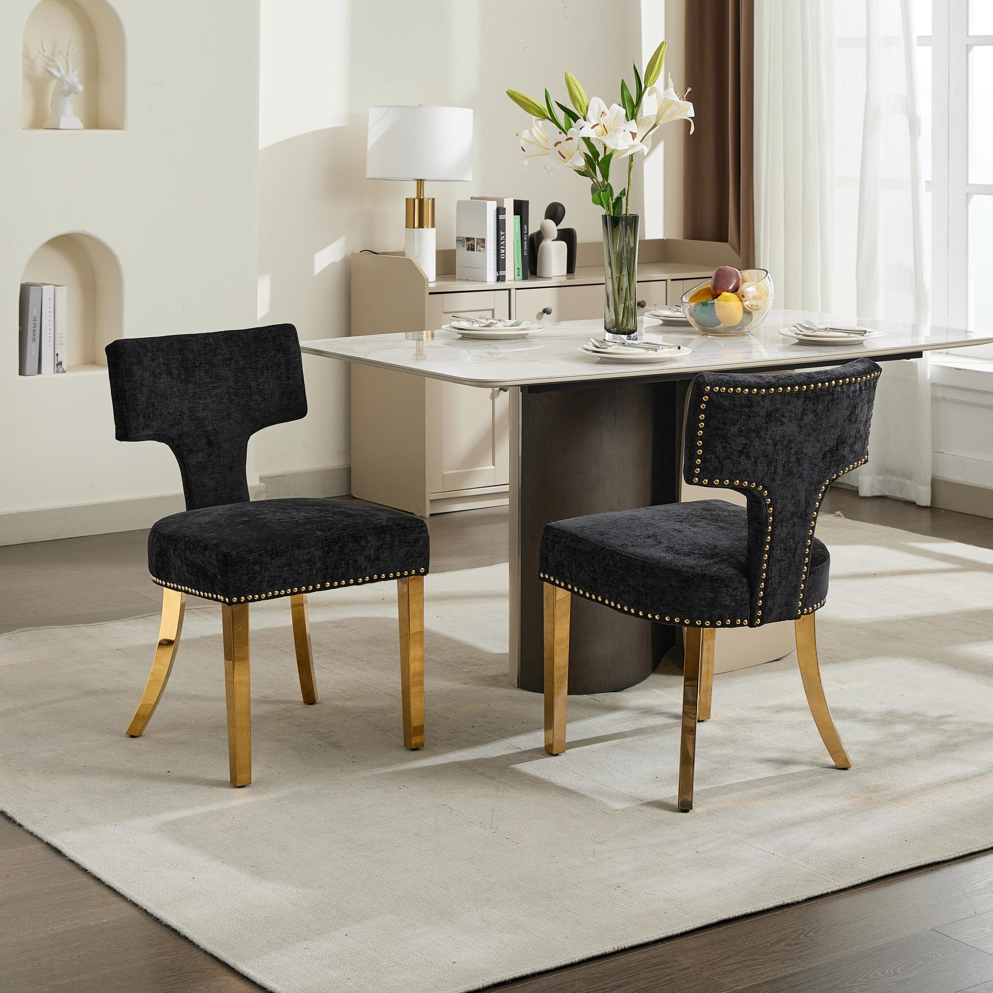 Product Name:Mid Century Modern Dining Chairs Set of 2, Farmhouse Chenille Fabric Upholstered Accent Chair Curved Backrest with Copper Nails around,Kitchen Chairs with Golden Stainless Steel Plating Legs, Black