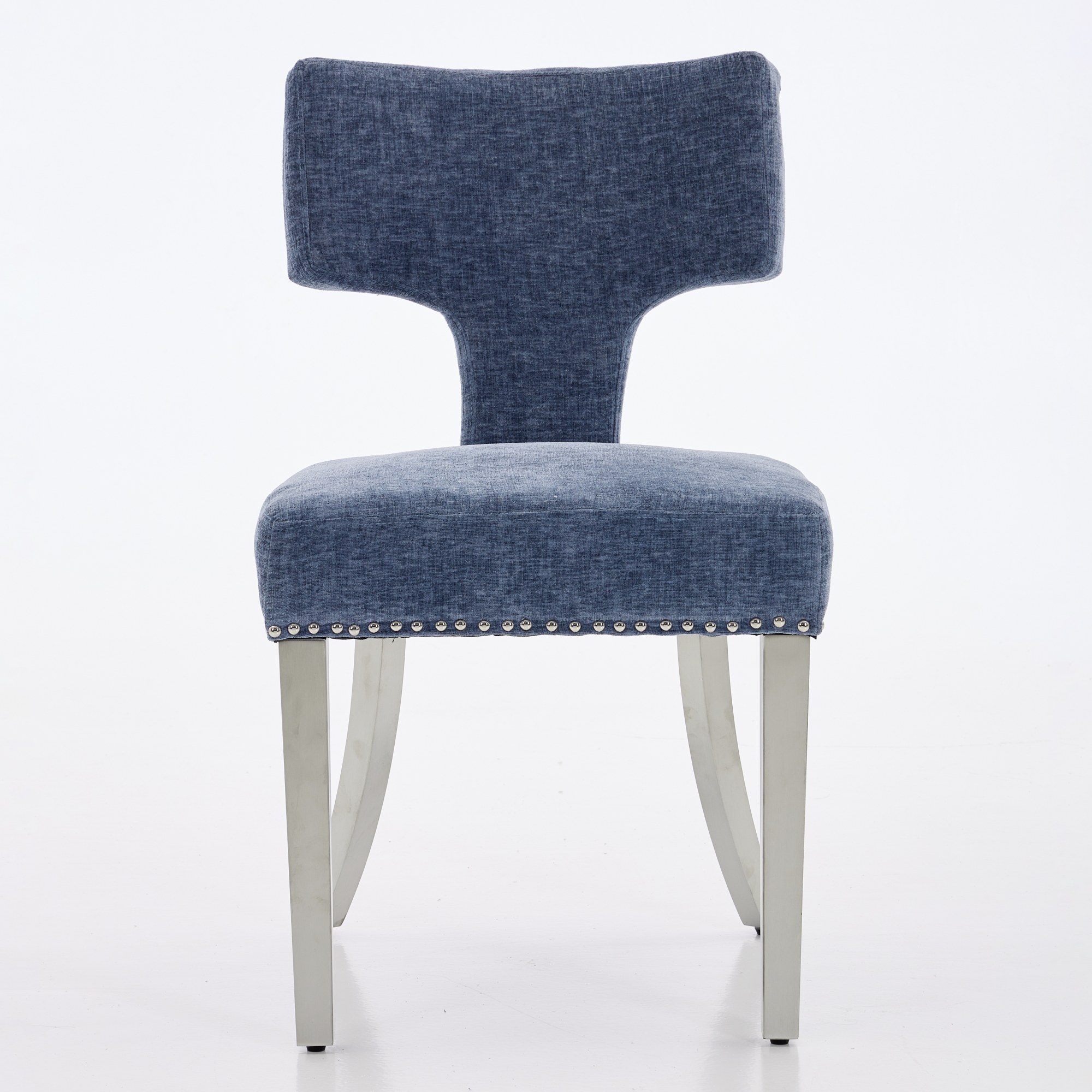 Product Name:Mid Century Modern Dining Chairs Set of 2, Farmhouse Chenille Fabric Upholstered Accent Chair Curved Backrest with Copper Nails around,Kitchen Chairs with Silver Brushed Stainless Steel Legs, Blue