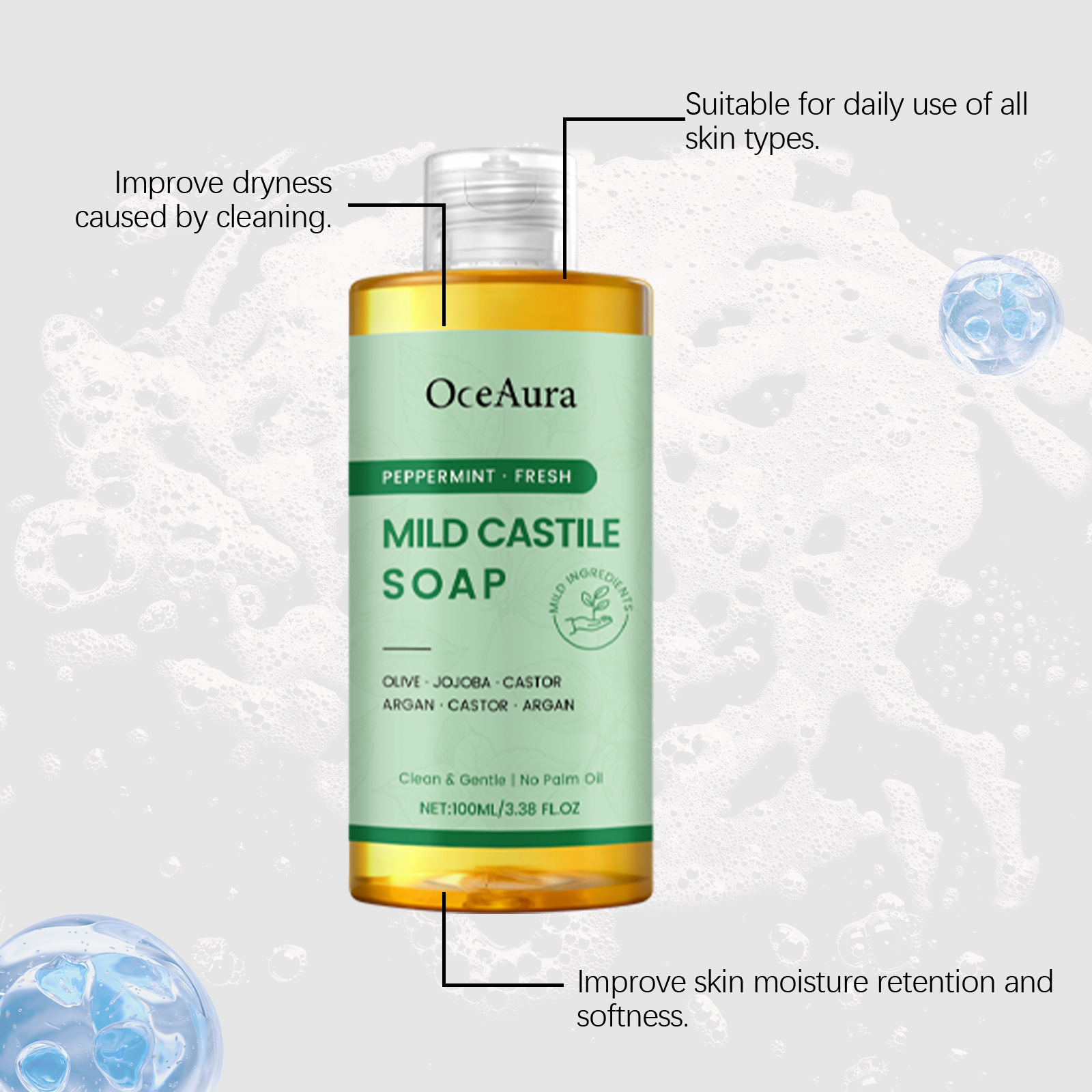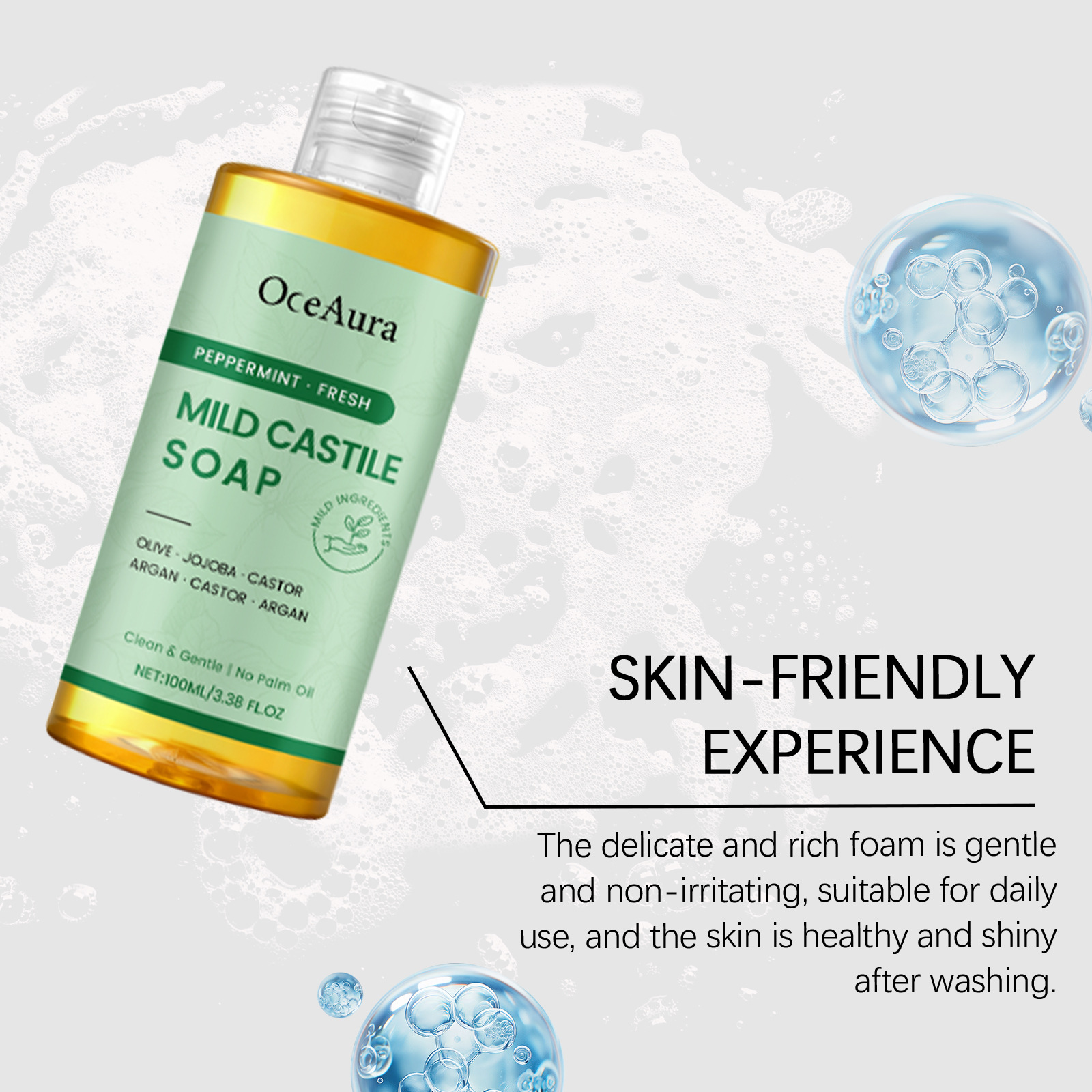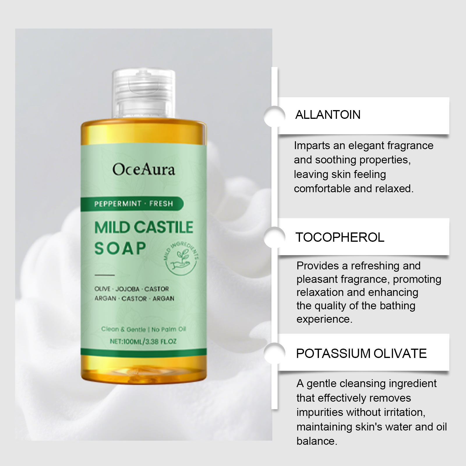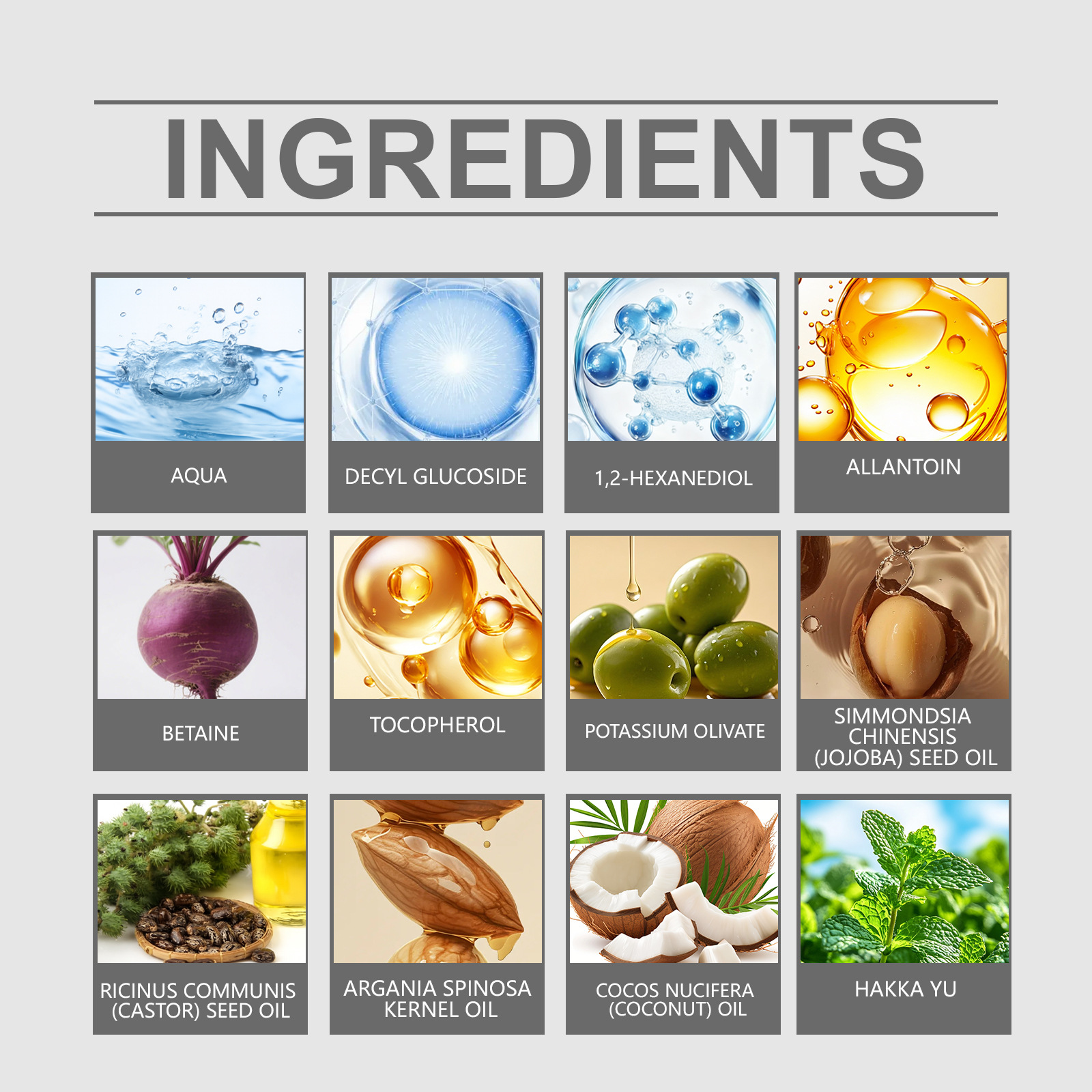 Ingredients: water, decyl glucoside, 1,2- hexanediol, allantoin, betaine, tocopherol (vitamin E), olive oil, jojoba seed oil, castor seed oil, Aralia elata kernel oil, coconut oil and mint leaf oil.