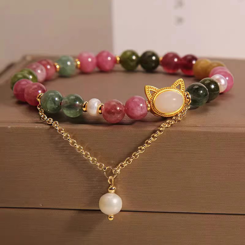 Product information:Color: Colored tourmaline + kitten headStyle: UnisexPopular elements: PearlStyle: SimpleMaterial: Natural stone