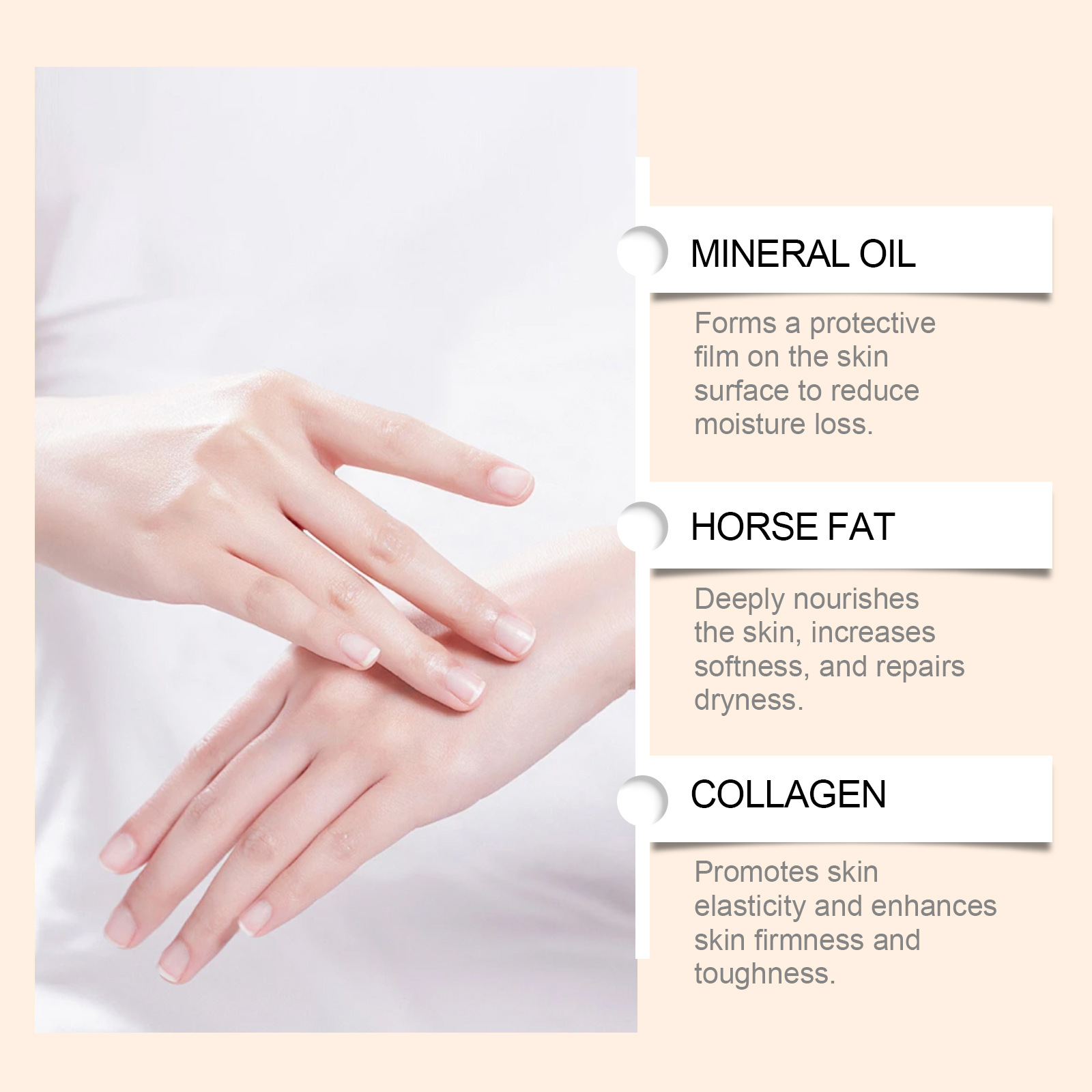 Product ingredients: water, glycerin, Glyceryl stearate, mineral oil, carbomer. Ethylhexyl glycerol, triethanolamine, horse fat, collagen