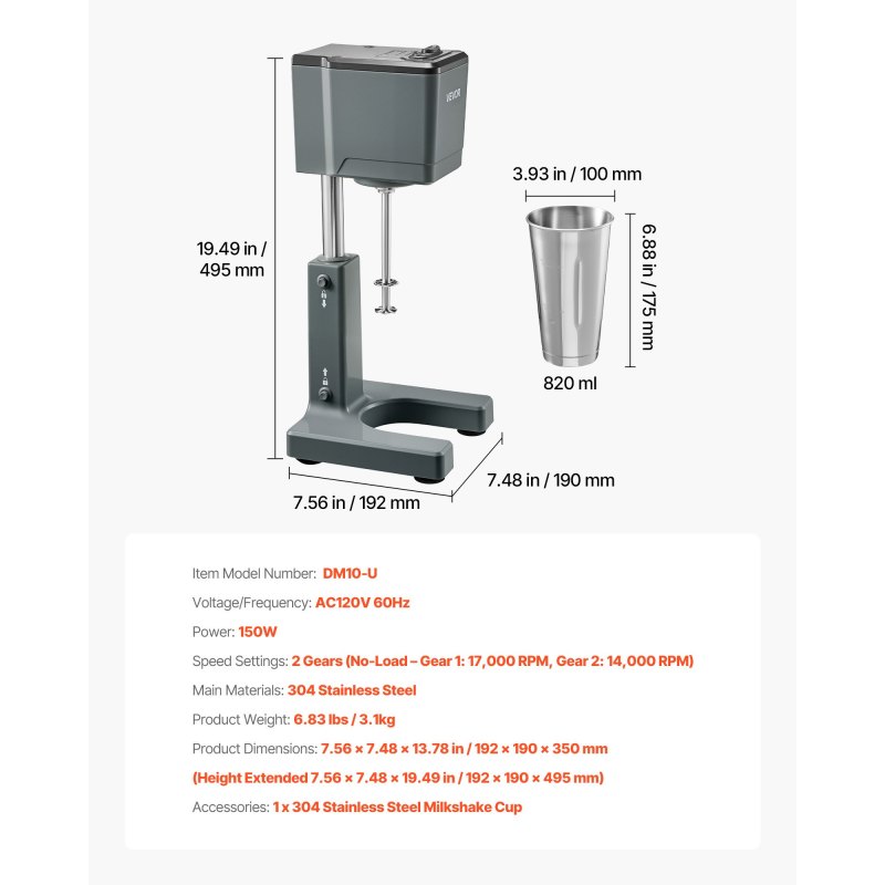 Adjustable Mixing Head: The head height can be adjusted 0–5.71 in / 0–145 mm to fit different cups. With this milk shake maker mixer, you can adjust based on ingredient volume for a more even texture, ensuring smooth results and reducing splashes