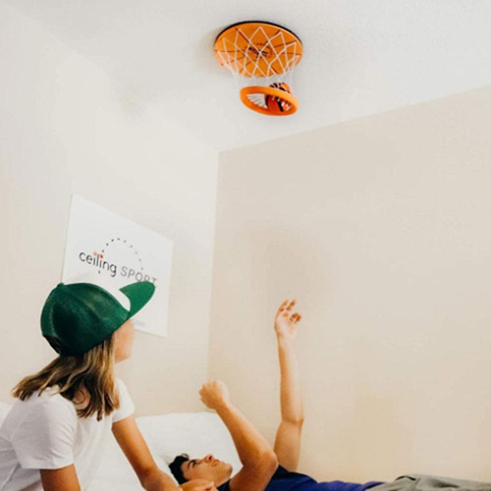Easy to play and full of fun, you can score points by shooting a soft, lightweight mini basketball or throwing it into a basketball hoop hanging from the ceiling.