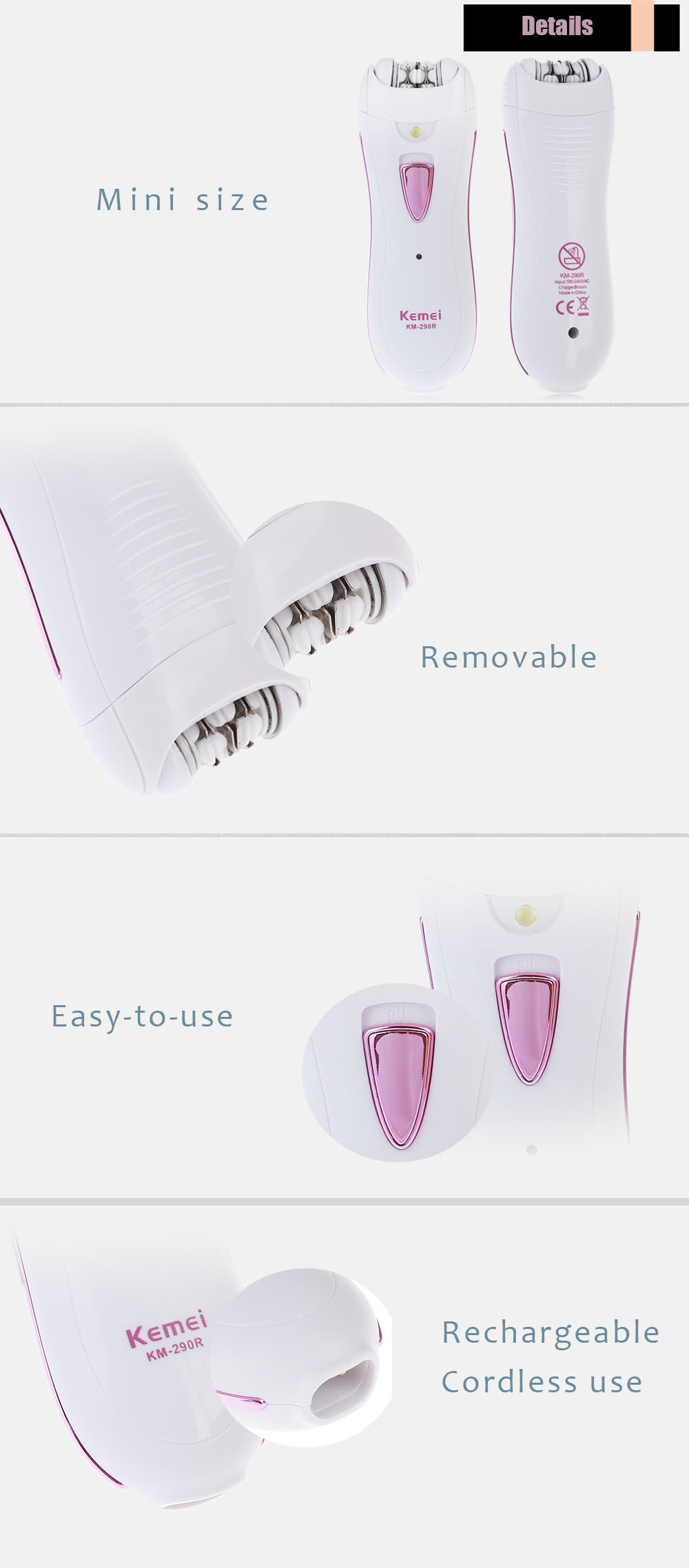 The ergonomic handle is comfortable to hold. The detachable head provides a hygienic hair removal experience. Portable size is convenient to use anywhere, even when traveling or on the go