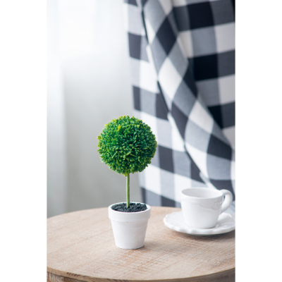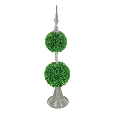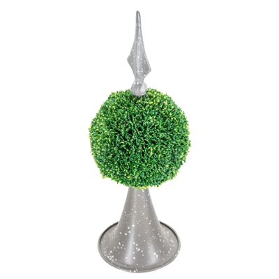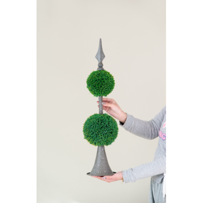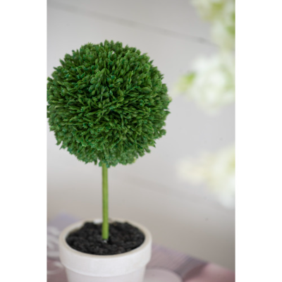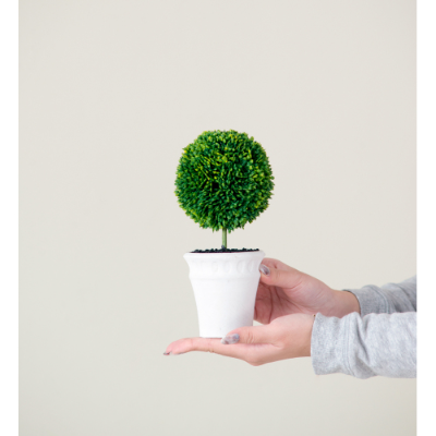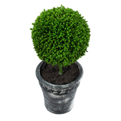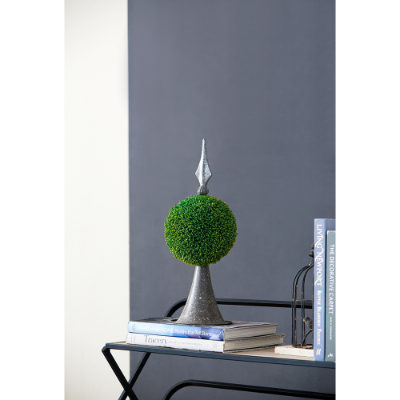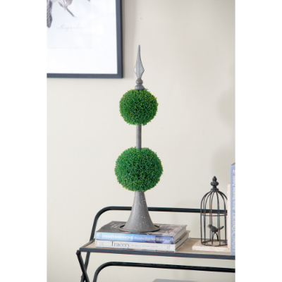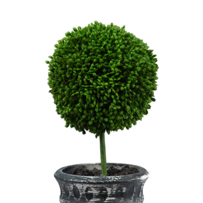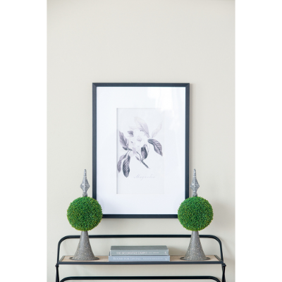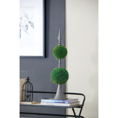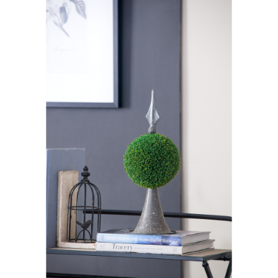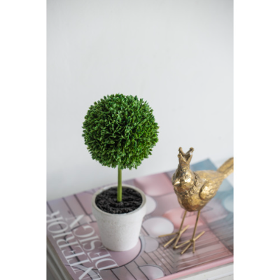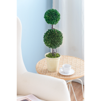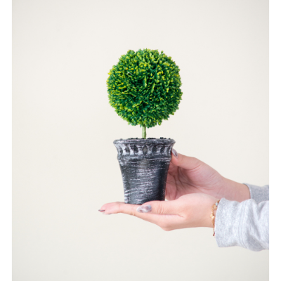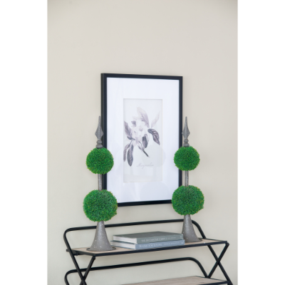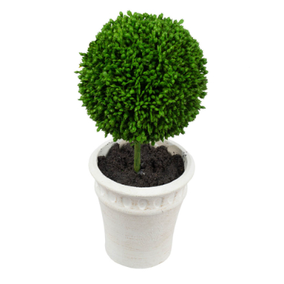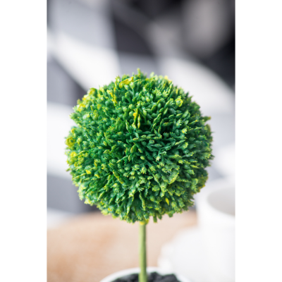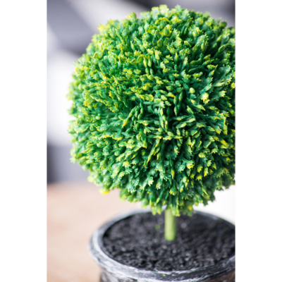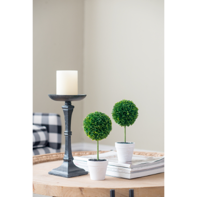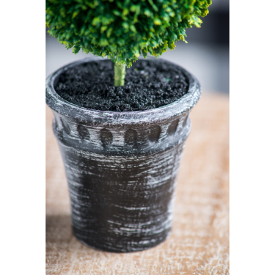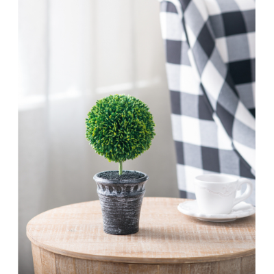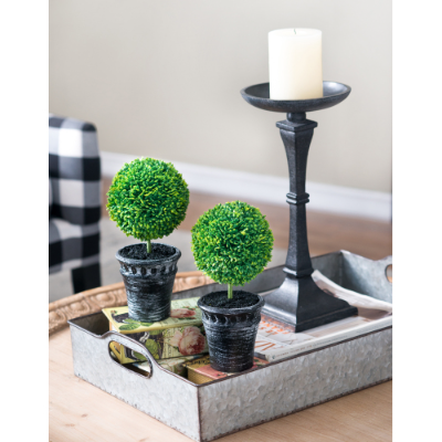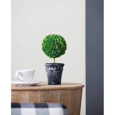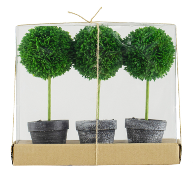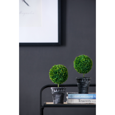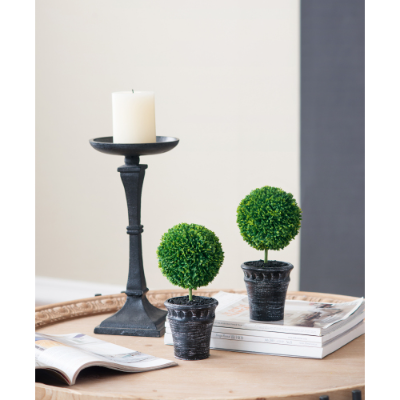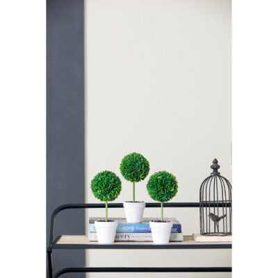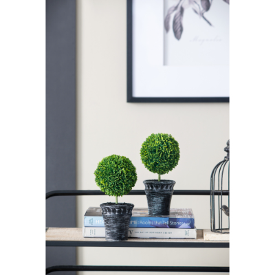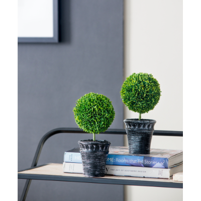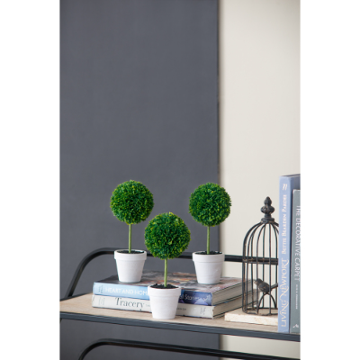 This set of three Mini Faux Potted Boxwood Topiaries in black pots offer a lush, opulent look in miniature scale. With deep green color and natural detailing, these faux topiaries make a cheerful addition to a bathroom, kitchen, or anywhere that lacks the natural light needed for real plants. These attractive topiaries offer all the beauty of nature without the hassle of real greenery.