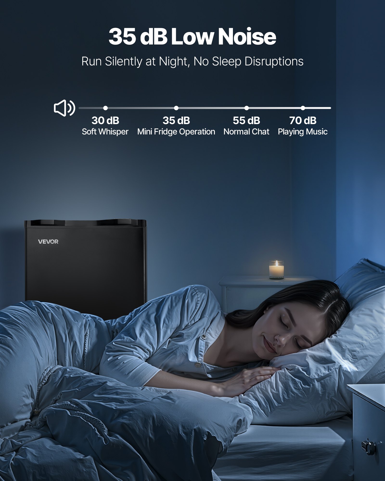 Low Noise, Low Energy: With a noise level of ≤ 35 dB, our mini refrigerator is ideal for bedrooms, study corners, or quiet offices. Plus, it is energy-efficient, keeping your food fresh with low electric cost
