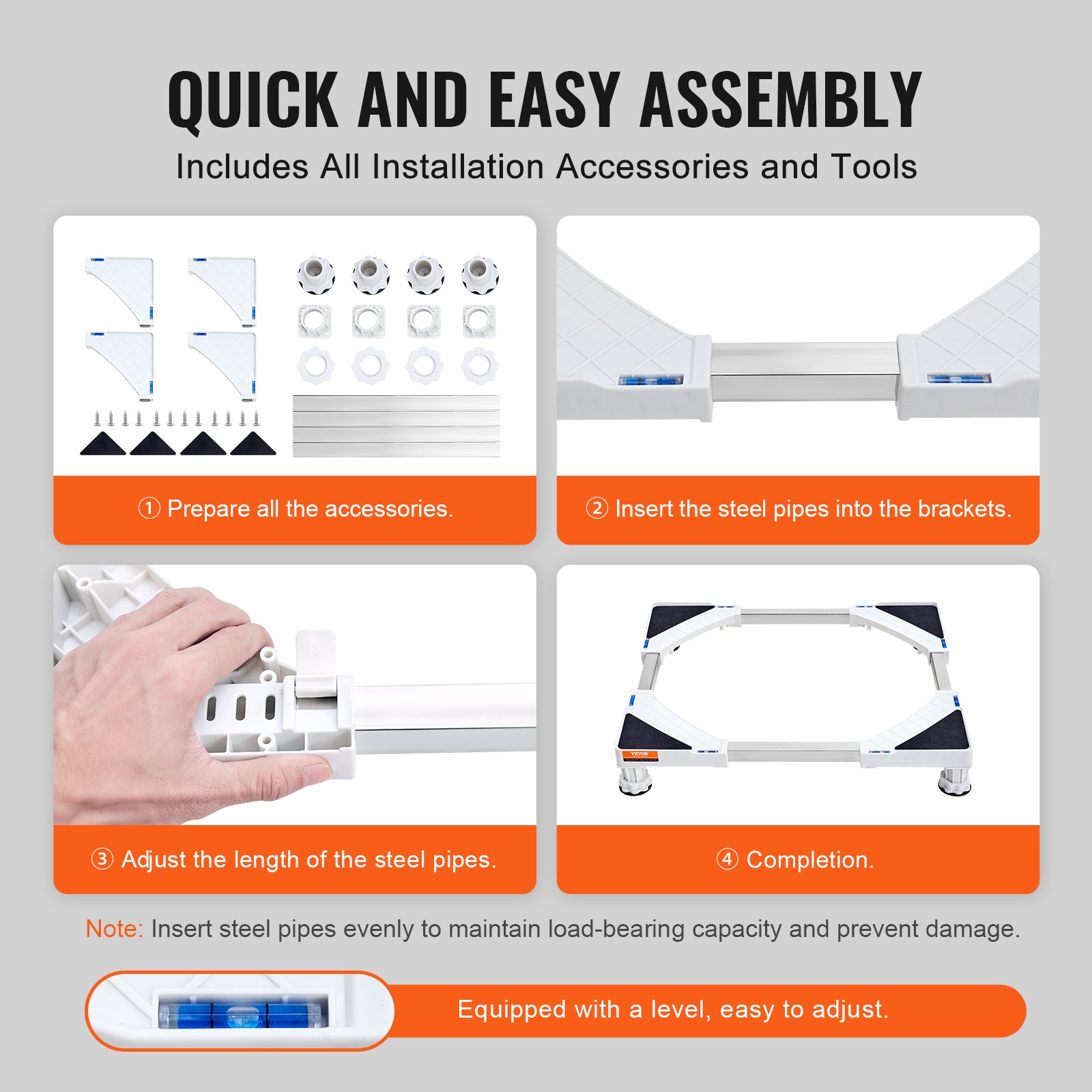 Features & Details Sturdy, Durable, and Noise-Reducing: Made from high-quality 201 stainless steel with an enlarged size of 0.98x0.98 inches (24.9x24.9mm), this pedestal can support a minimum load of 800 pounds (362.9kg) at its smallest size and a maximum load of 330 pounds (149.7kg) when extended to the recommended limit. (The load capacity varies with the size; it's highest at the smallest extended size and lowest at the recommended maximum size.) Quick and Easy Assembly: Installation takes just 10 minutes with the included simple tool wrench. It can be easily assembled by one person. Adjusting the extension only requires following the instructions, ensuring that all depth measurements are consistent to prevent damage to the base. Universal Compatibility with Most Models: The intuitive design is suitable for all standard machines, including Samsung, LG, Whirlpool, General Electric, Miele, Electrolux, Bosch, and more. You can confidently elevate washing machines and dryers, among other appliances. Adjustable Height Legs: Equipped with raised support legs, the height can be adjusted within the range of 3.81 inches (96.8mm) to 4.76 inches (120.9mm), allowing for convenient height adjustments to facilitate cleaning in different environments. Built-in Spirit Level for Balance: Prevent appliances from tipping over with the included 8-level bubble level, ensuring that uneven floors do not cause balancing issues or potential damage to the appliance or pose a risk to children.