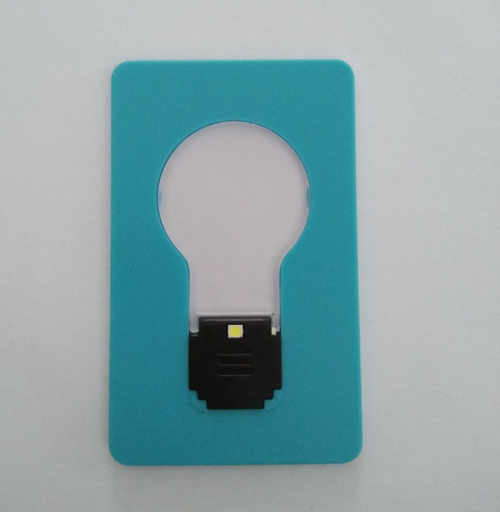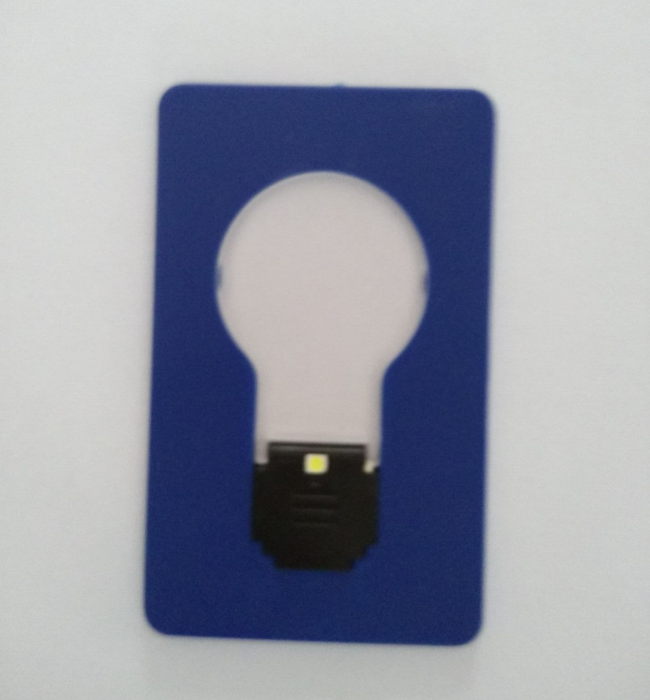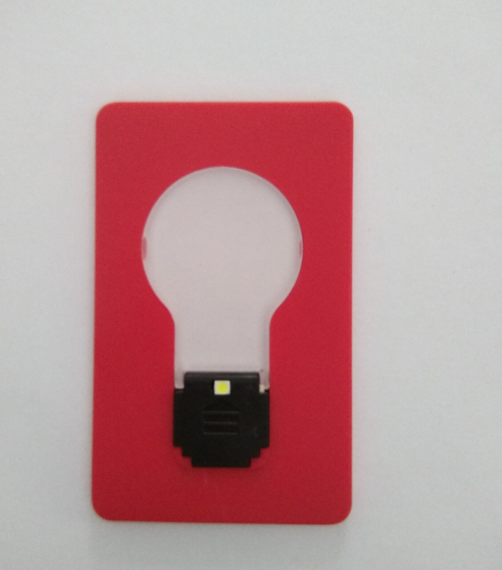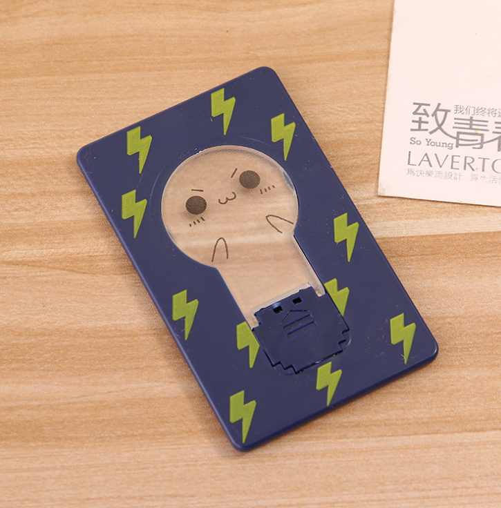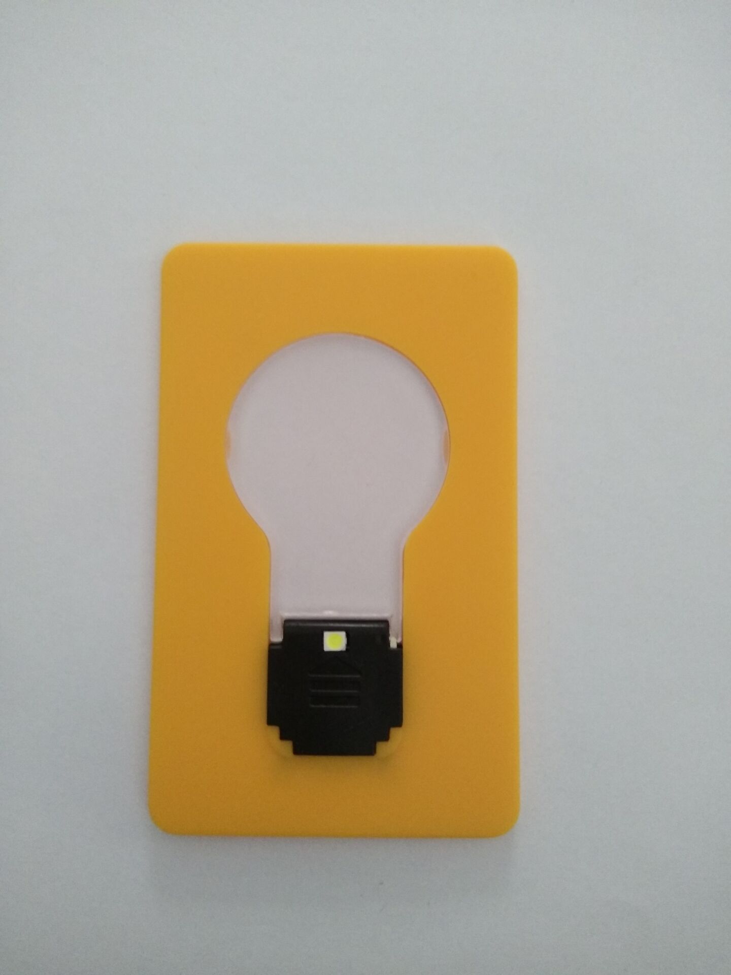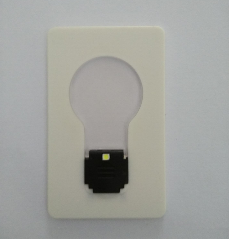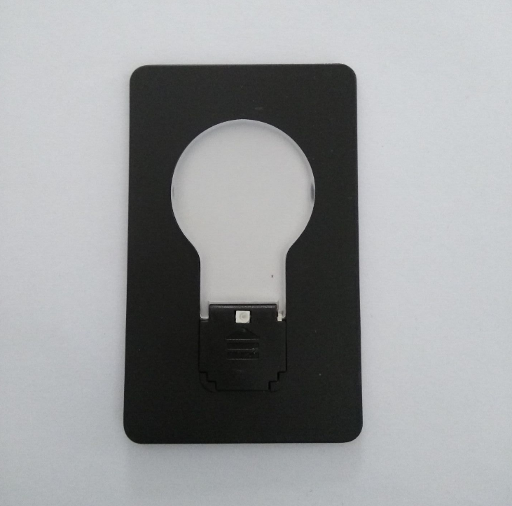 The size same as credit card and no wire needs. It is very convenient because it can place inside the wallet. A such small card may use for illumination, design is so funny. The interior has a LED light bulb, when you need to illuminate, you just fold "Light Bulb" up then the light turns on. If put " light Bulb" down, then the light turns off. You can use it anytime and anywhere!!!