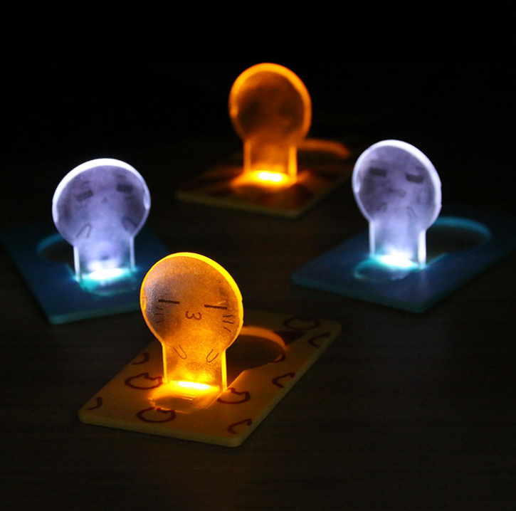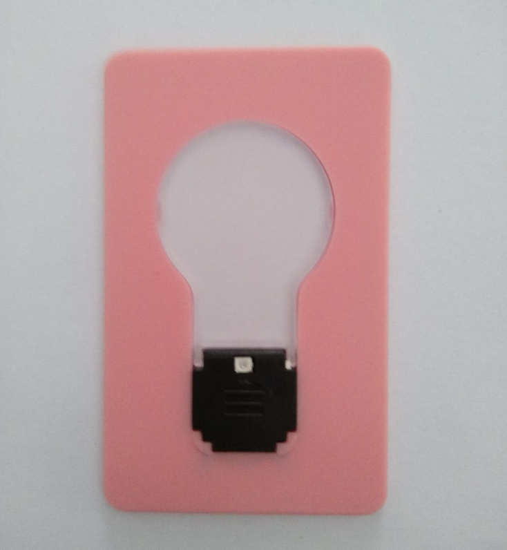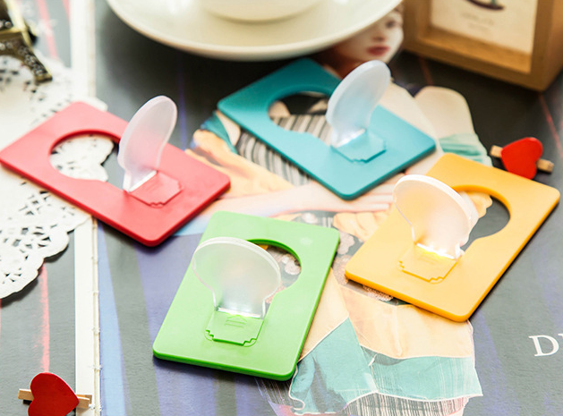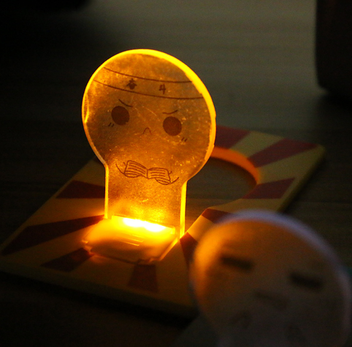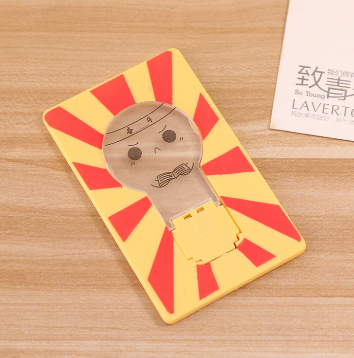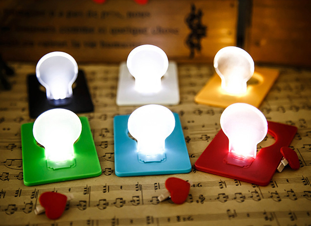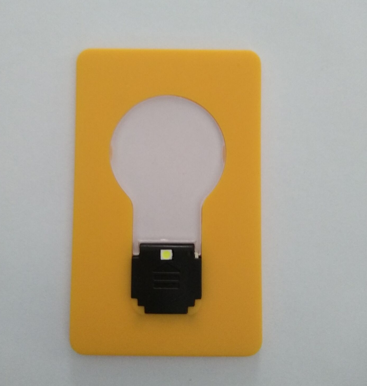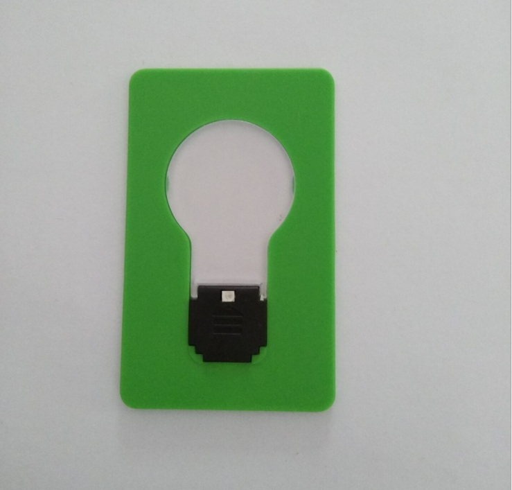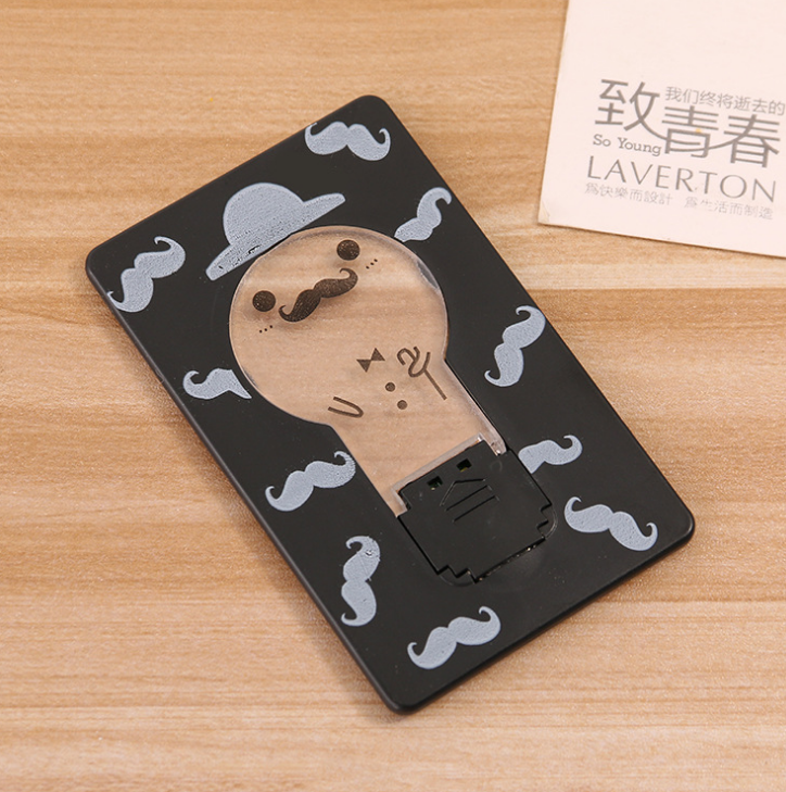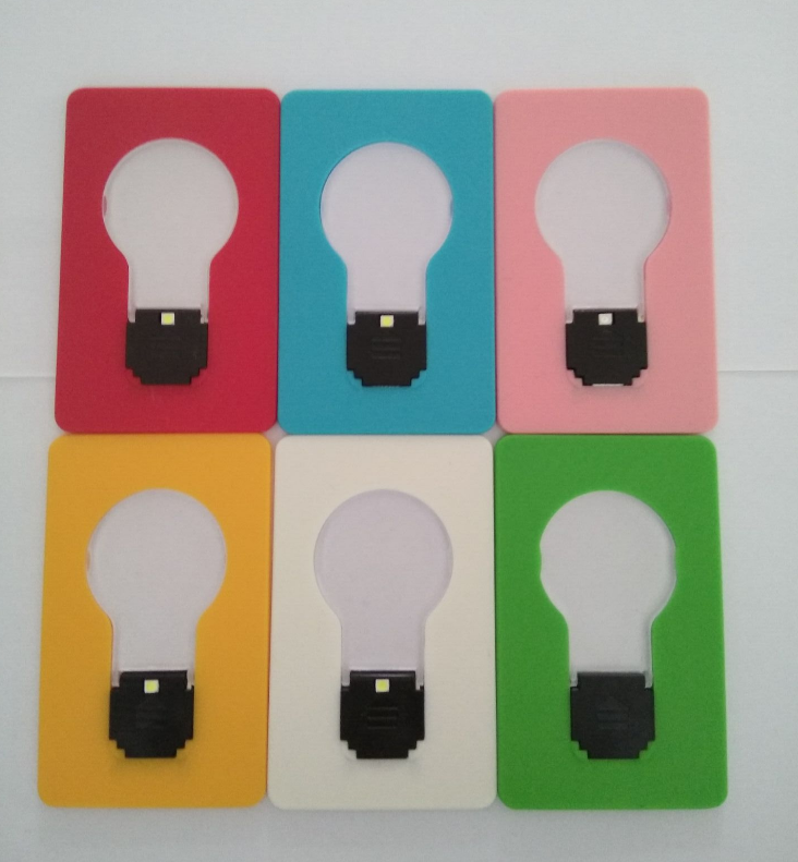 The size same as credit card and no wire needs. It is very convenient because it can place inside the wallet. A such small card may use for illumination, design is so funny. The interior has a LED light bulb, when you need to illuminate, you just fold "Light Bulb" up then the light turns on. If put " light Bulb" down, then the light turns off. You can use it anytime and anywhere!!!