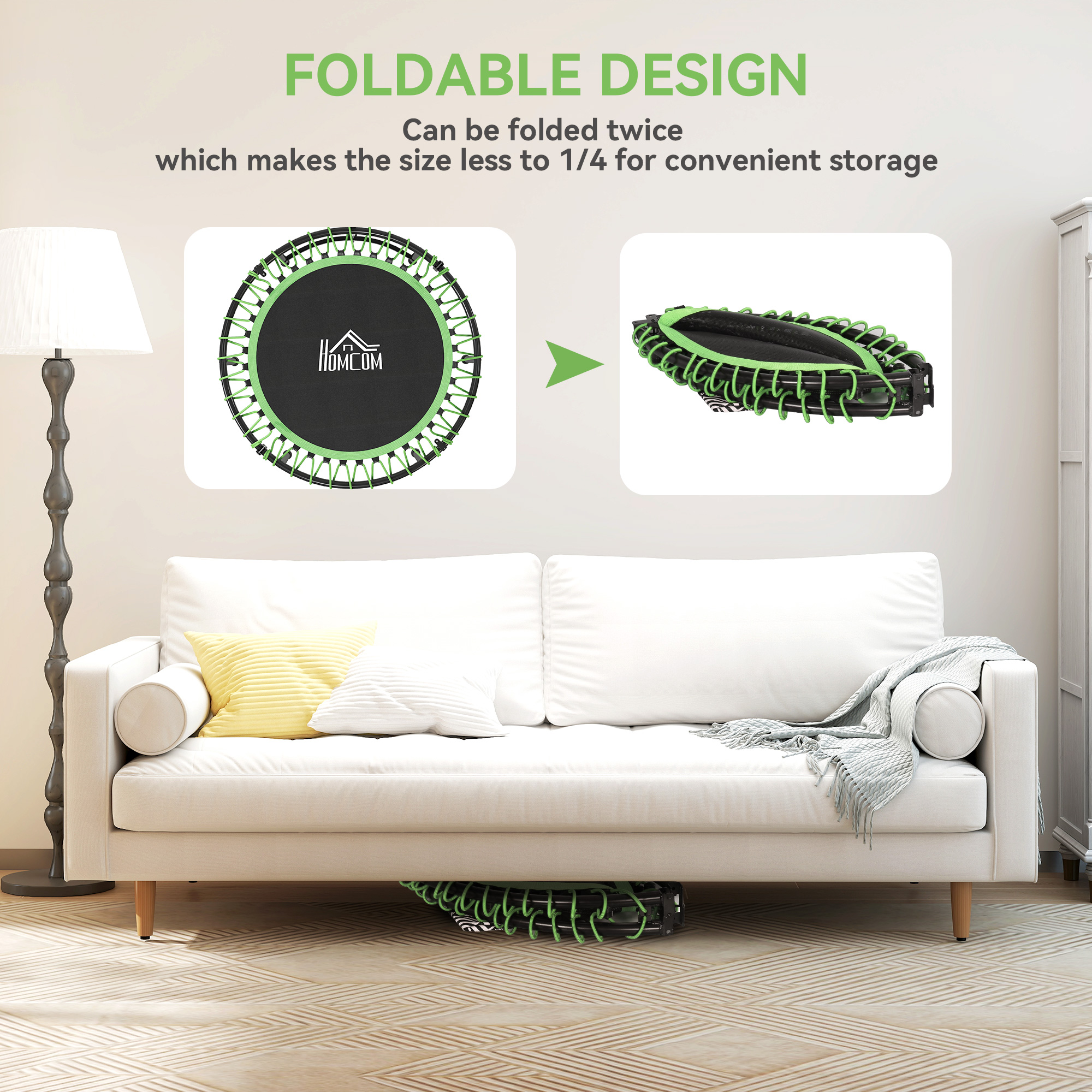 Whether you're looking to exercise inside, outside, or during your lunch break in the office, then this mini foldable trampoline from is great for helping you improve your fitness. Made from steel to support up to 150 kg, with a three-level adjustable T-bar for you to hold on to whilst you work out. It is made with steel legs for balance and stability, whilst the rubber hats help protect your floor beneath from any scratching and damage.