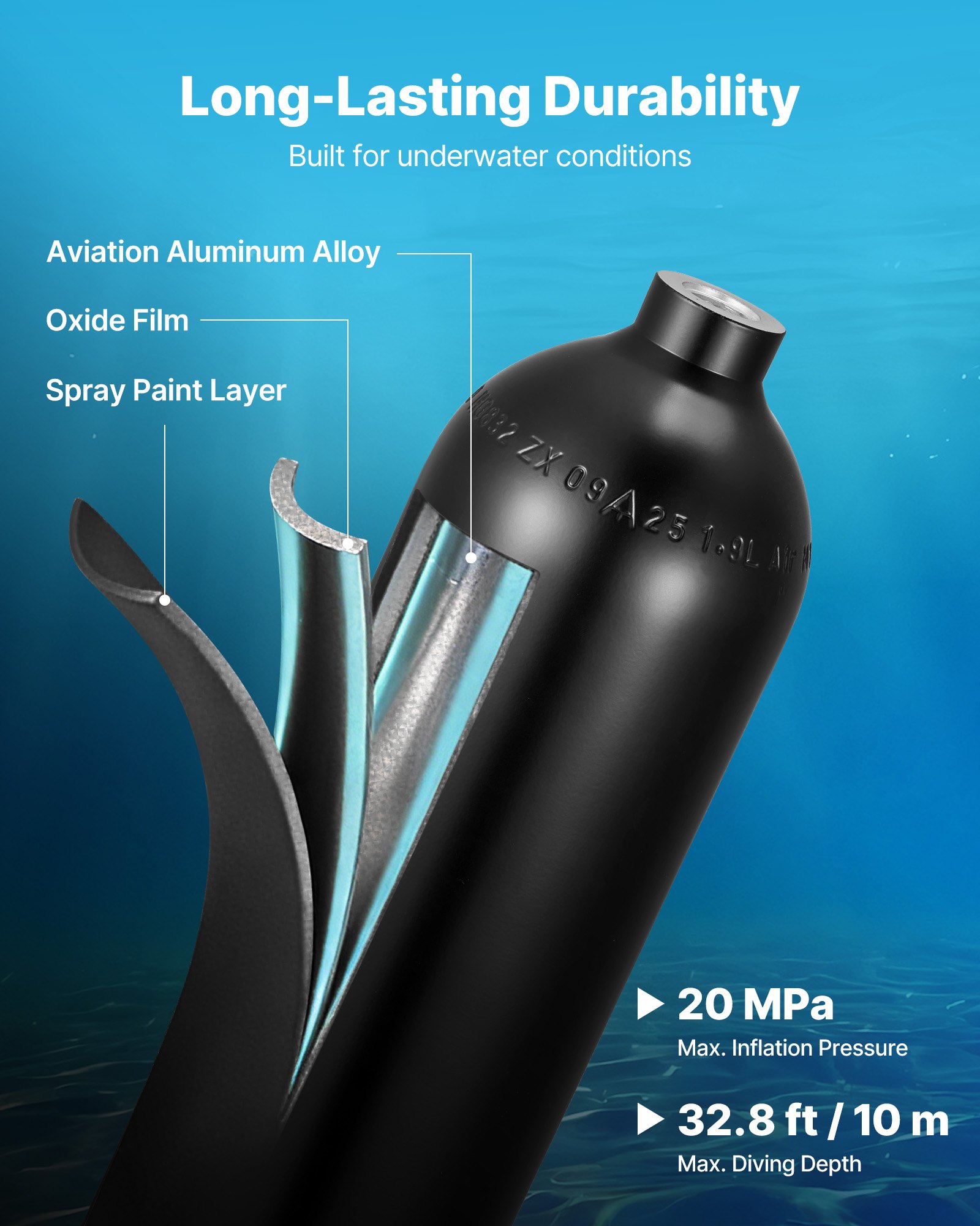 Reinforced Tank: Made from aviation-grade aluminum for high strength and corrosion resistance, this scuba diving tank withstands 20 MPa