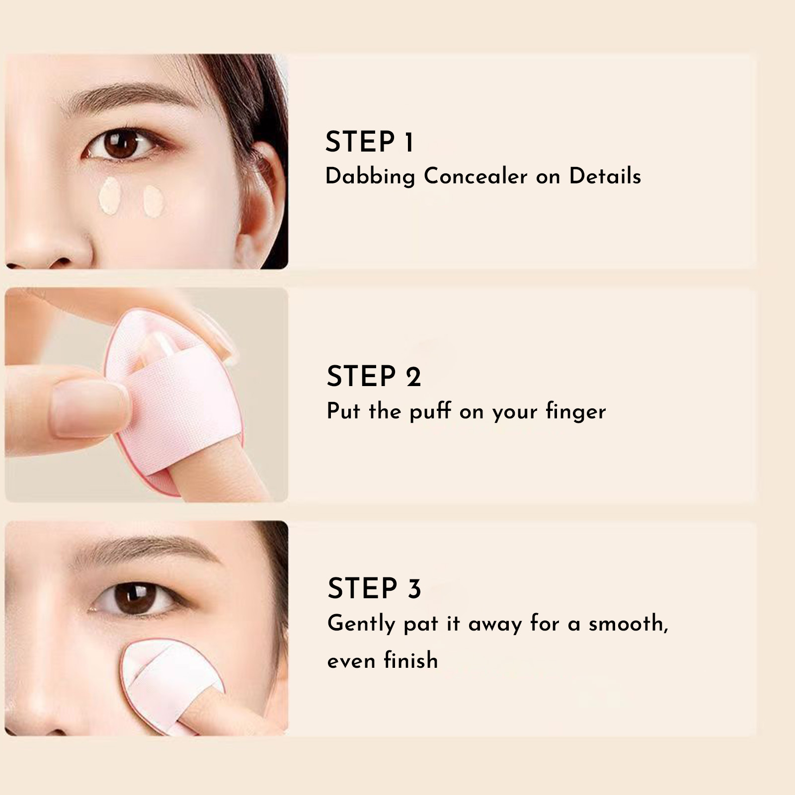 【Practical Design】: Finger powder puff, Perfect fit on fingertips, making concealment and detail application as flexible as using fingers, great for corners of the eyes and nose.puff is soft and delicate, and the ribbon on the back of the puff, allows you to hold the powder puff firmly and not easy to fall off, easy to use.