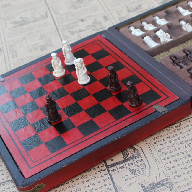 Miniature Three-dimensional Qing Bing Pieces Antique Leather Box Set Chess