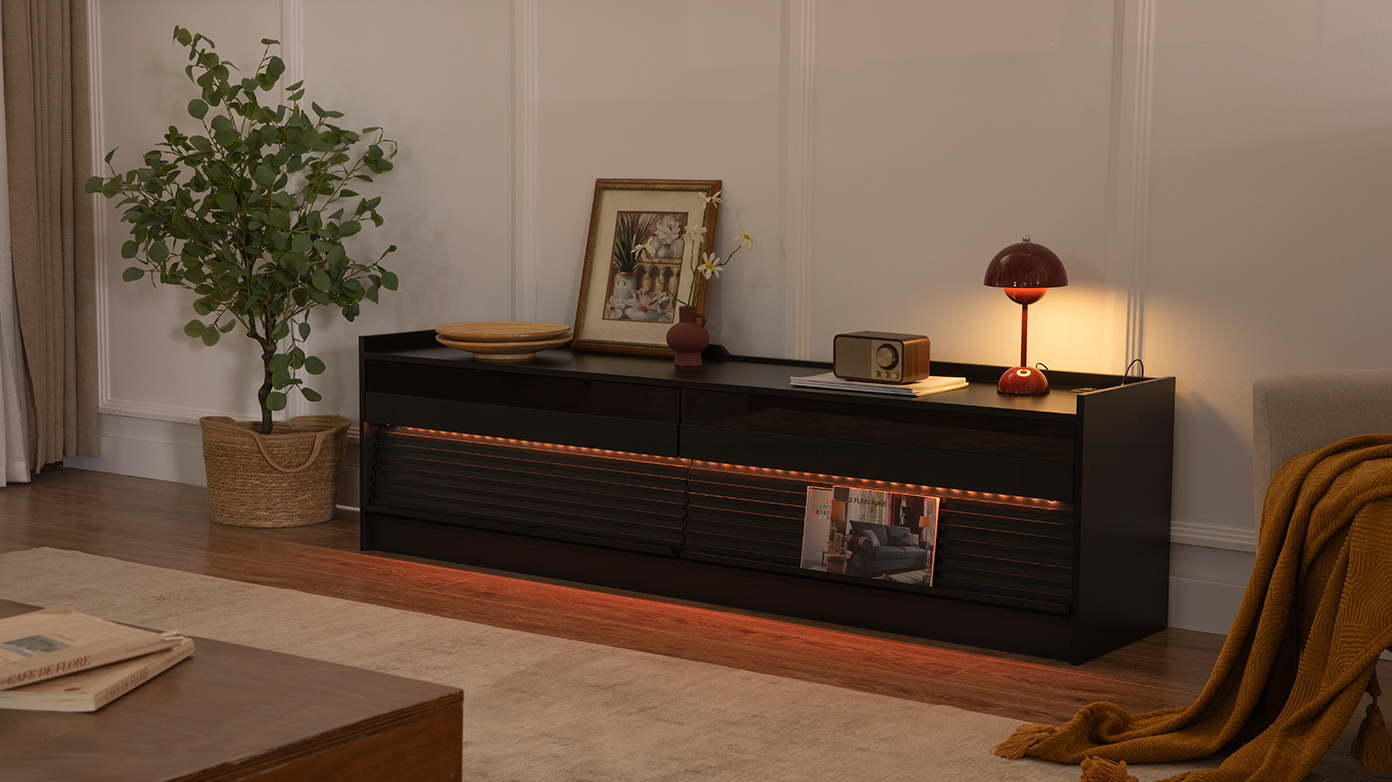 Product Name:Mirod Modern TV Stand with Ample Storage,4 Drawer Design with Tempered Glass ,Built-in Charging Ports and Ambient LED Lighting ,Versatile for Any Decor Style