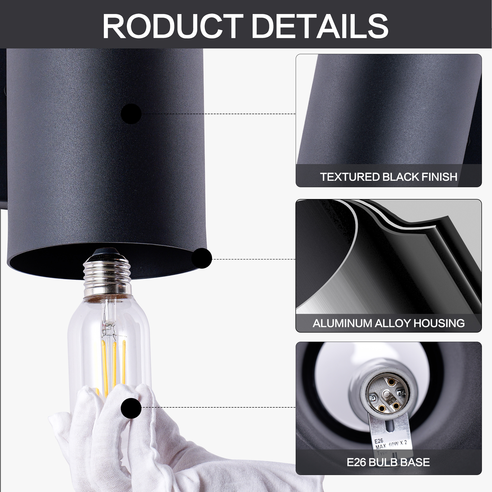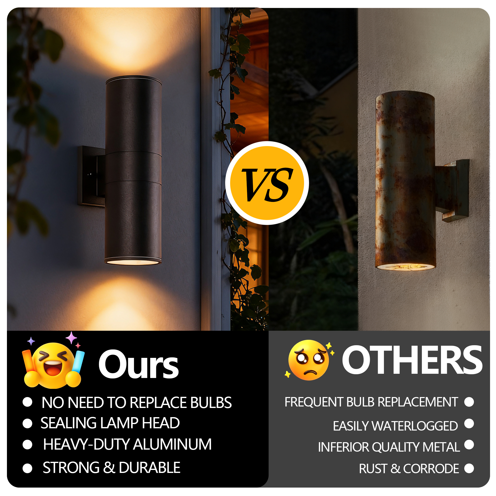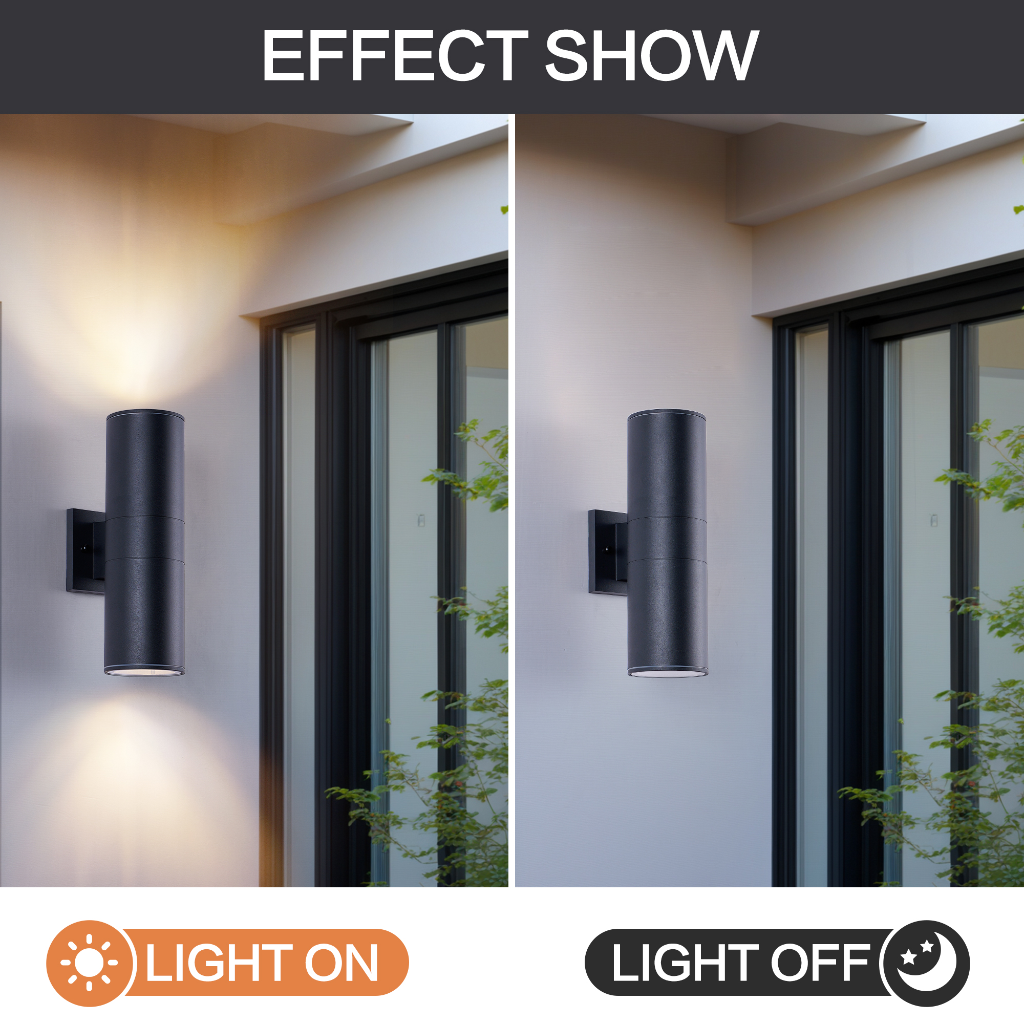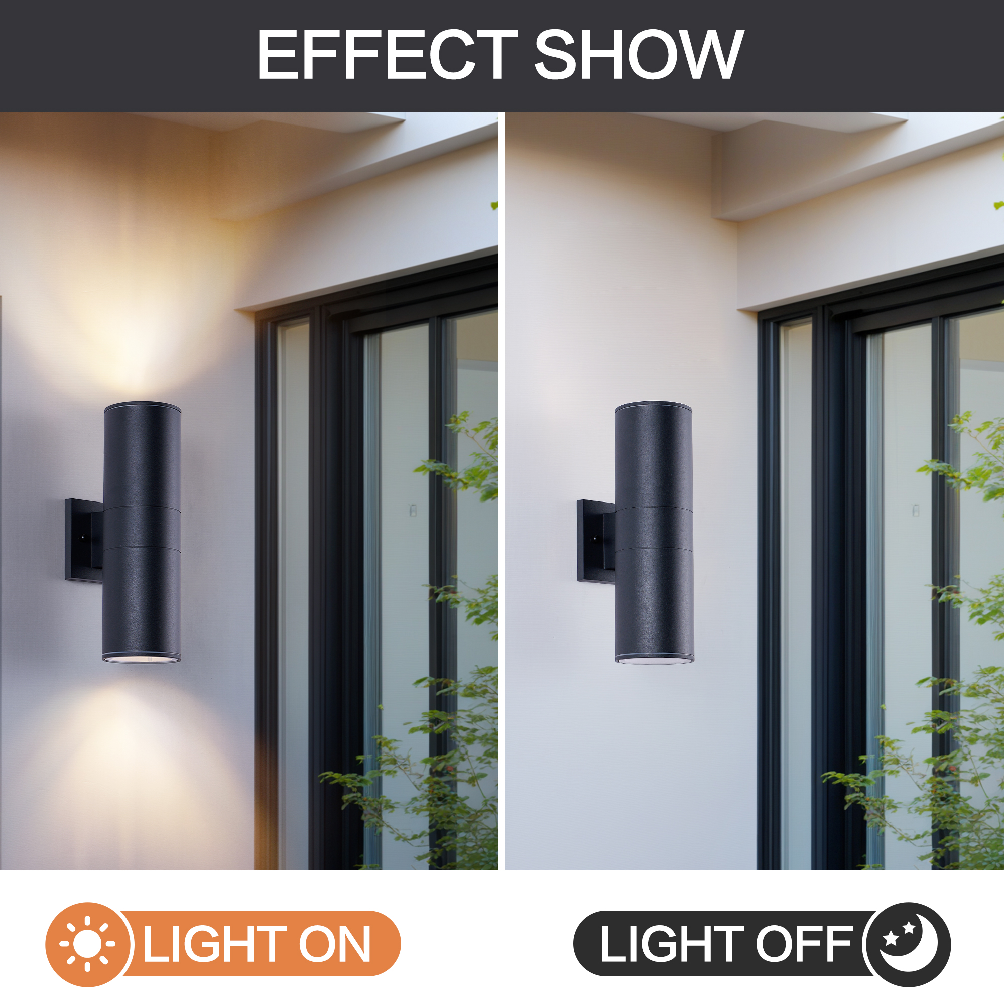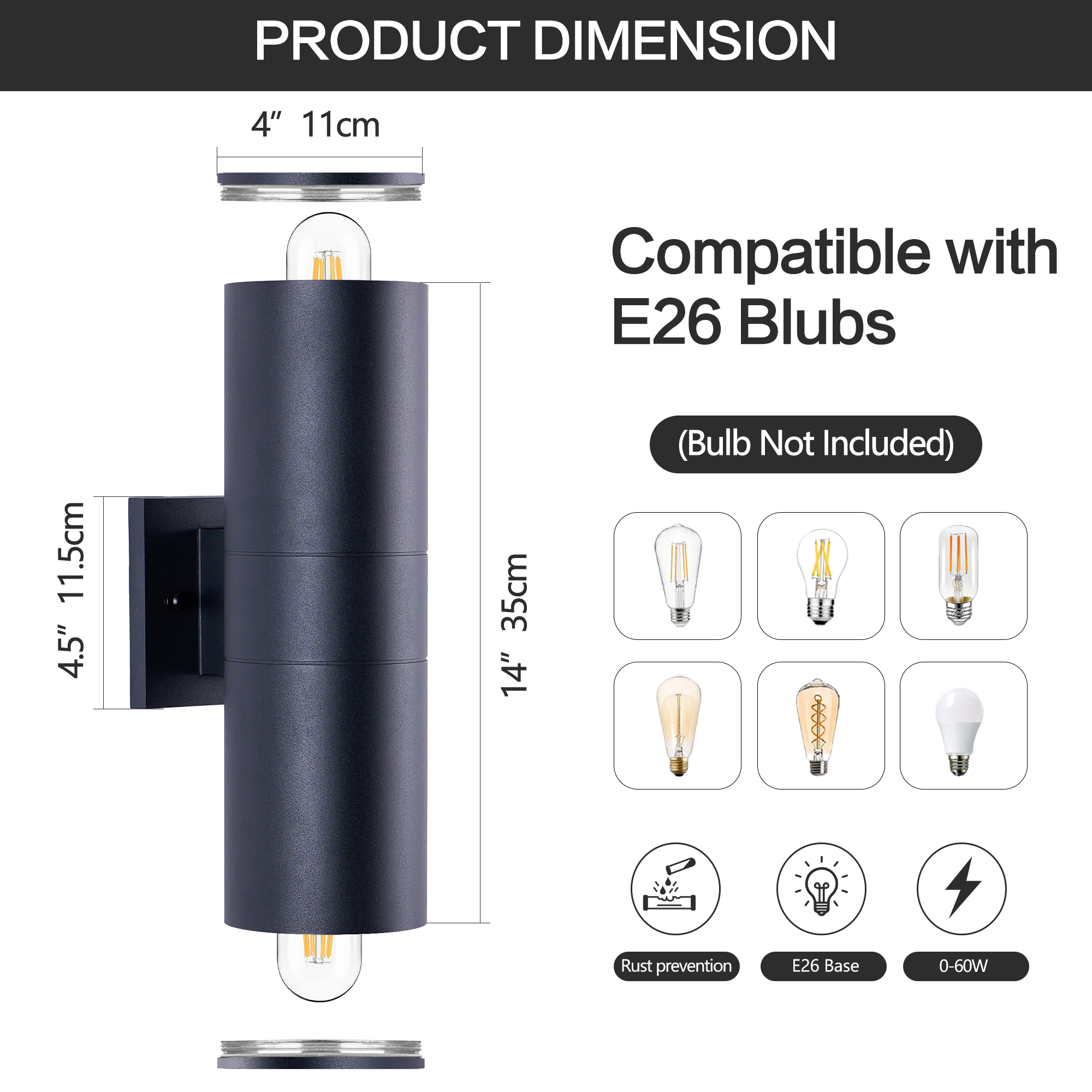 IP65 rated outdoor wall sconce, rust-resistant with aluminum cylinder body, bulbs NOT included.ETL listed, patented waterproof design with cap shape upper cover and plug shape lower cover.Easy to install with 2-piece rotatable mounting bracket and fixing nuts on wall plate front side. .Pay ATTENTION to the UPSIDE direction on the backside of the wall plate.Please check product size before ordering, one year warranty from order placed