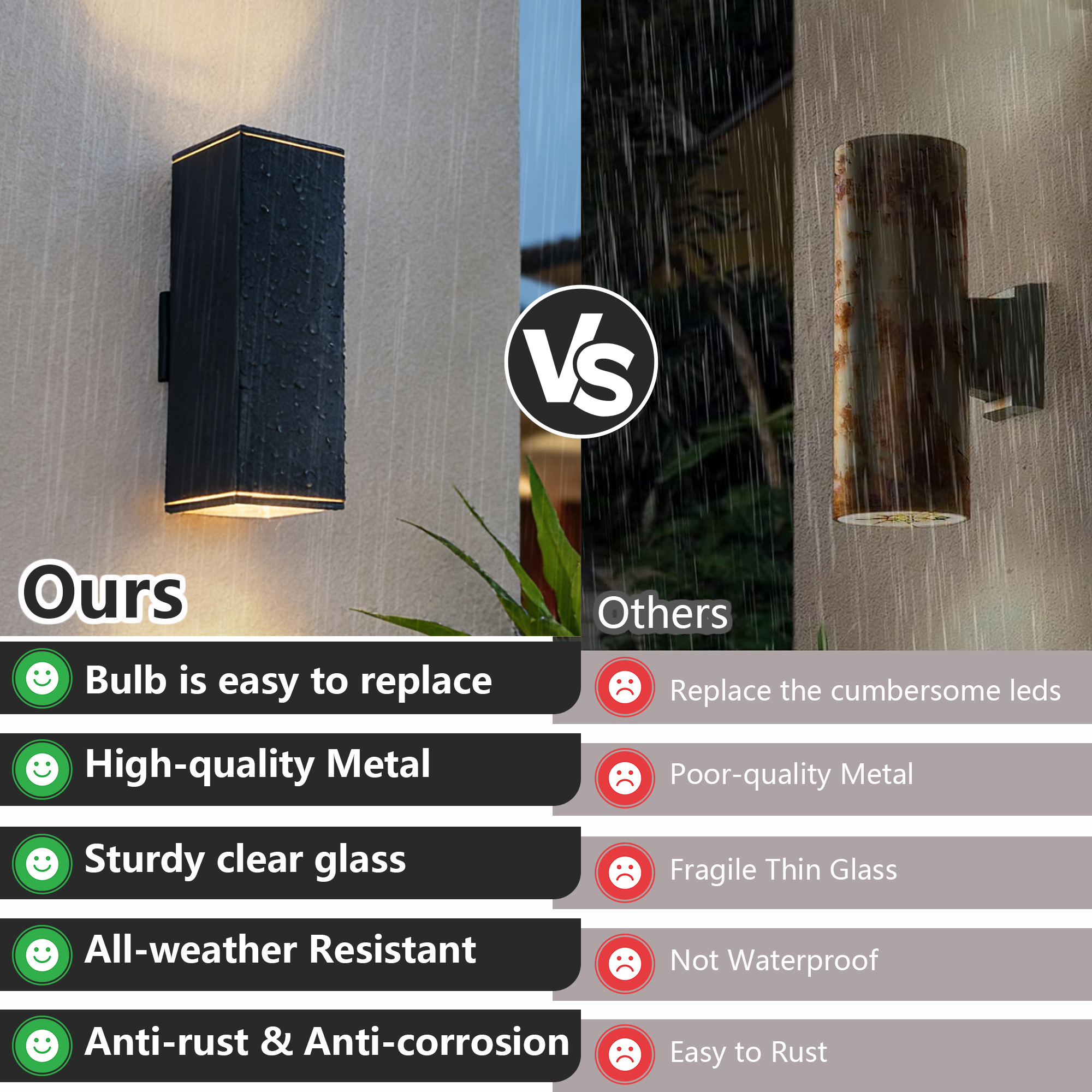 IP65 rated outdoor wall sconce, rust-resistant with aluminum cylinder body, bulbs NOT included.ETL listed, patented waterproof design with cap shape upper cover and plug shape lower cover.Easy to install with 2-piece rotatable mounting bracket and fixing nuts on wall plate front side. .Pay ATTENTION to the UPSIDE direction on the backside of the wall plate.Please check product size before ordering, one year warranty from order placed