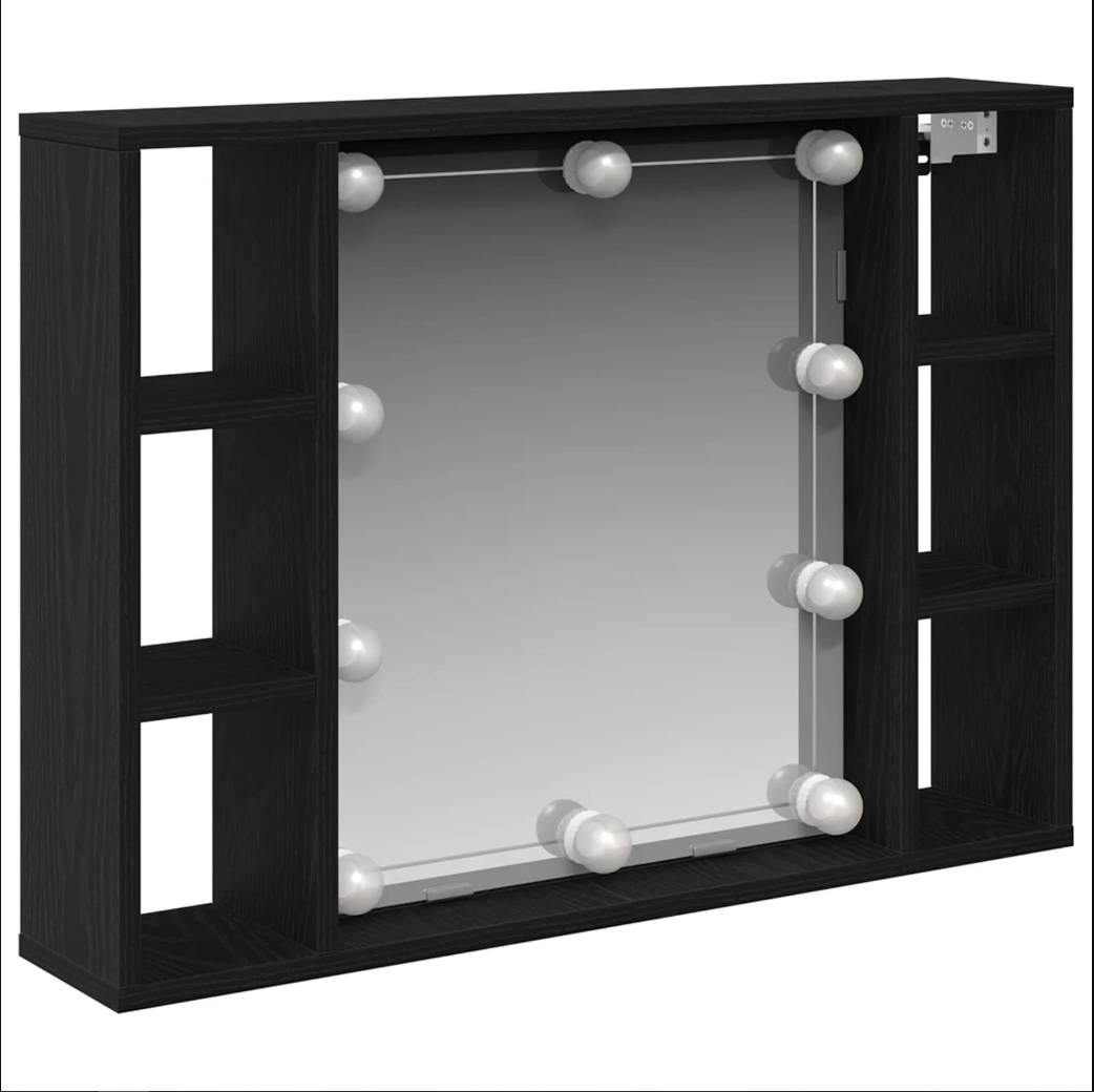 Description: This trendy mirrored cabinet with LED lighting lets you keep your makeup neatly organized and within easy reach! Durable material: Engineered wood is a high-quality material with a smooth surface, characterized by its strength, stability, and moisture resistance. Note: Each product comes with assembly instructions in the packaging for easy assembly. Screws and wall anchors are not included. If you are unsure, seek professional help. Read and follow each step of the instructions carefully. Do not use the product if any parts are damaged, cracked, or missing. It requires a DC 5V power supply; however, a suitable certified 5V USB power adapter is not included. Ample storage space: This mirrored cabinet features six compartments, providing plenty of room to neatly store your belongings. Wall mounting: This LED bathroom cabinet can be mounted on the wall. Suitable mounting hardware must be purchased separately. Materials: The cabinet's sturdy structure is made of engineered wood. This ensures durability even with regular use and prevents everyday wear and tear. The matte finish enhances the modern look and complements various interior design styles, while requiring minimal maintenance. Care & Maintenance: Regularly clean the cabinet with a dry cloth. Ensure all electrical components remain dry to prevent damage and ensure smooth operation. Properties: