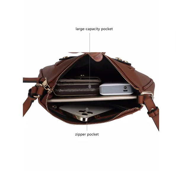 Designed for everywhere life takes you; the Essie Crossbody is a timeless style with modern details. Crafted from soft pebble high-quality vegan leather and accented with gold-tone hardware; this crossbody is the perfect go-anywhere bag. Unzips it to reveal a fully lined interior with a wall zippered pocket.  The Essie Crossbody has our plate emblem on the front; gold-press-studs; a decorative zippered front pocket and a convenient front slip pocket to keep your small belongings. You will love to wear this hands-free style.