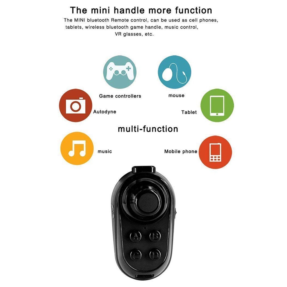 Functions: The mini Bluetooth remote control can be used for cell phone, tablet, wireless Bluetooth game handle, music control, selfie, self-timer, VR glasses, etc.