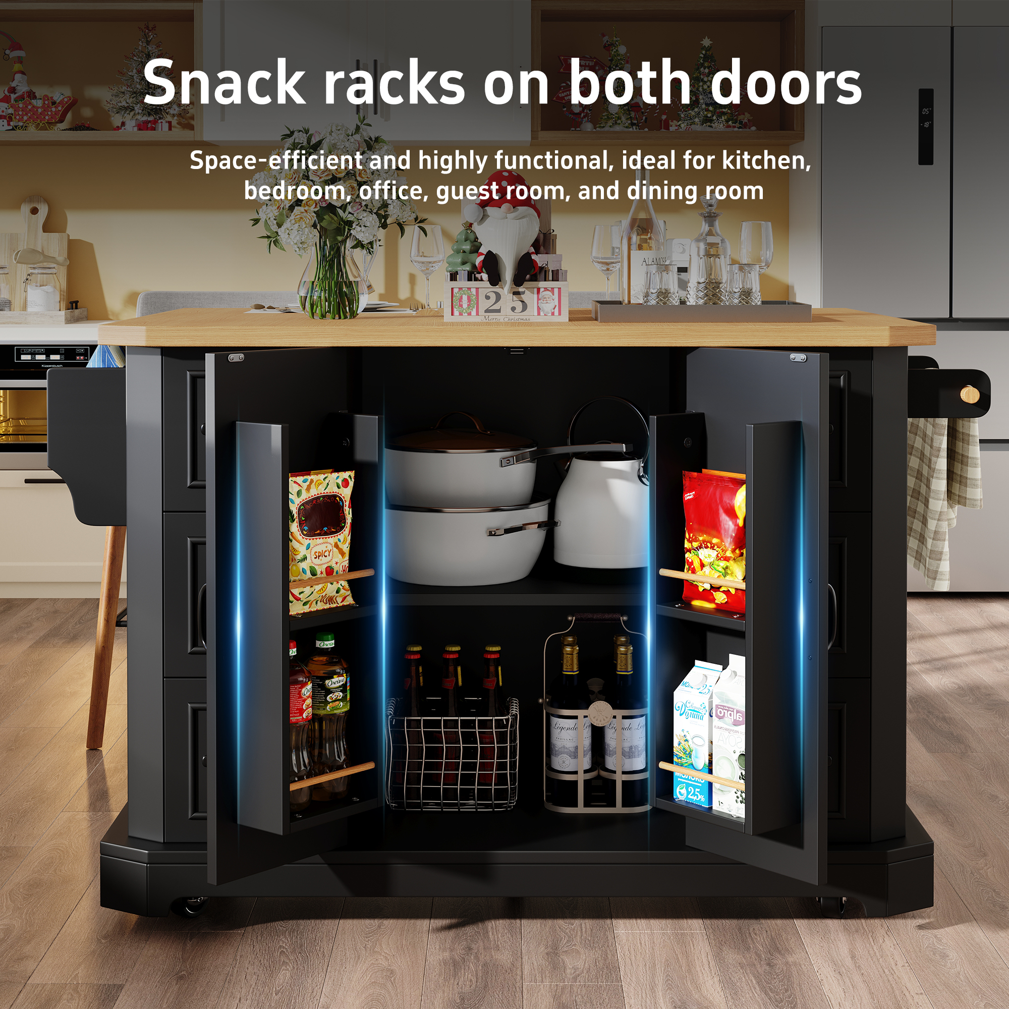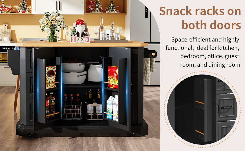 The door handles and drawer knobs are made of high-quality metal that is rust-resistant and attractively designed. The entire kitchen cart is constructed from high-quality MDF panels that are stable, durable, and easy to clean. Five 360-degree casters, two of which have locking brakes, enable effortless transportation and secure placement for various usage scenarios.