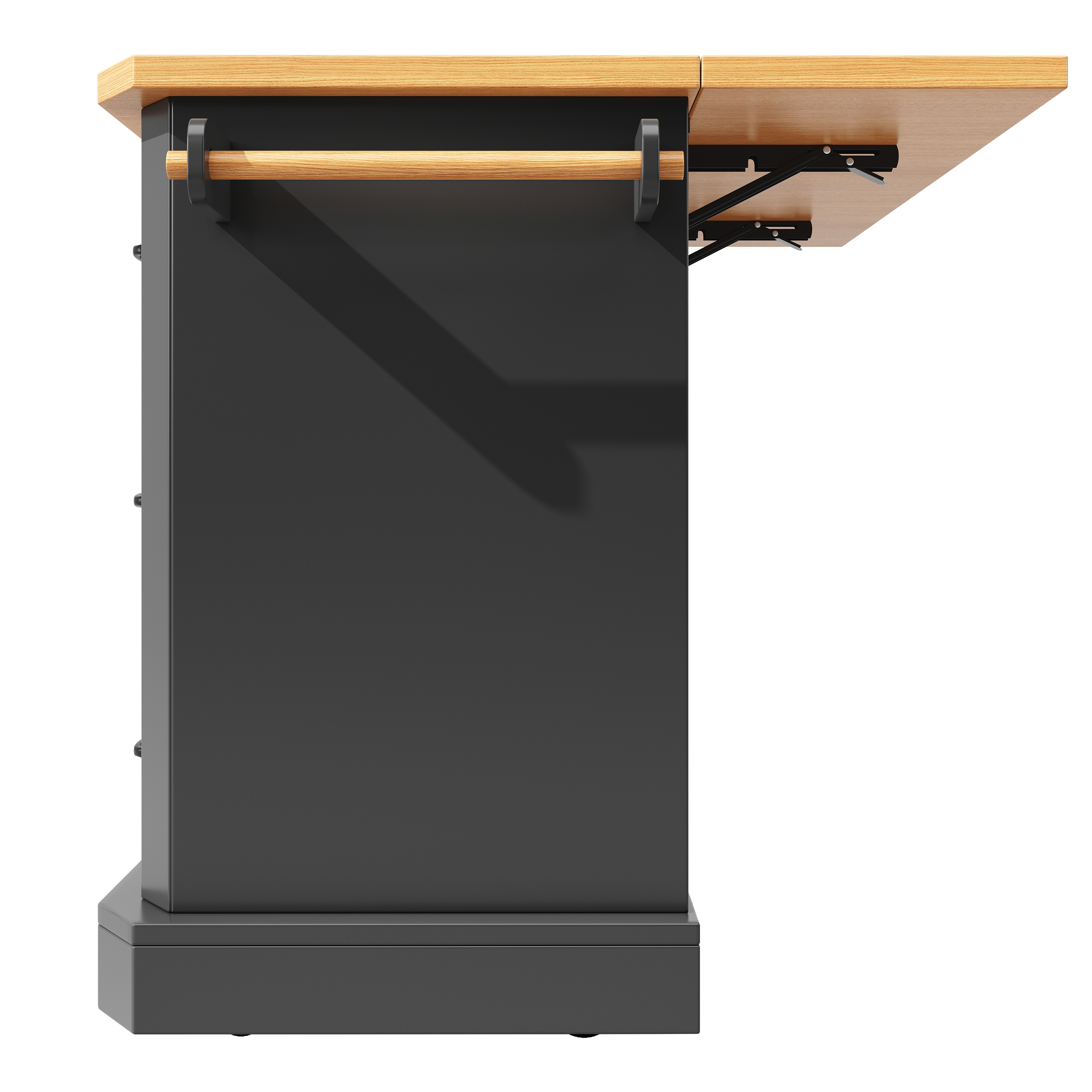 The furniture piece is available in the timeless colors White or Black and impresses with a simple, elegant appearance. The solid worktop with a wood-look finish complements it perfectly, making this mobile island a versatile companion that ideally fits into country-style kitchens, balconies, living rooms, or dining areas.