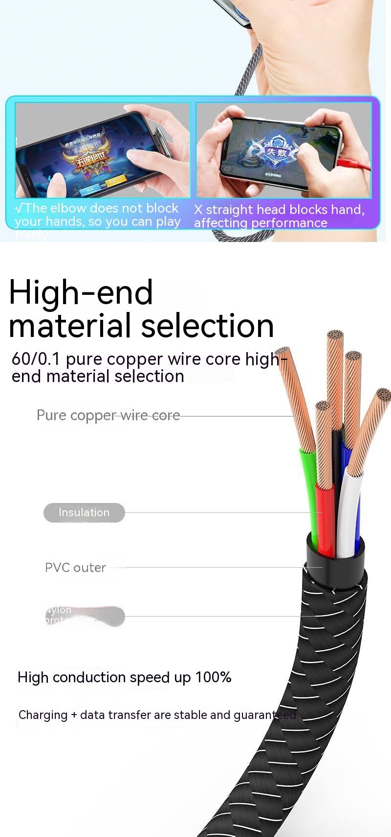 Parameters: The interface adopts internal and external molds, dual mold molding, and uses tin plated copper wire cores with 5 thick wire cores. It has stronger antioxidant and conductive transmission capabilities, and can support 66W charging at the end. It is also compatible with fast charging of 66W, 60W, 40W, 18W, and other types.