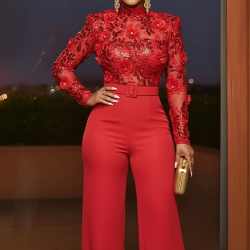 Mock Neck 3D Flower Lace Patchwork Wide-Leg Jumpsuit-Blue