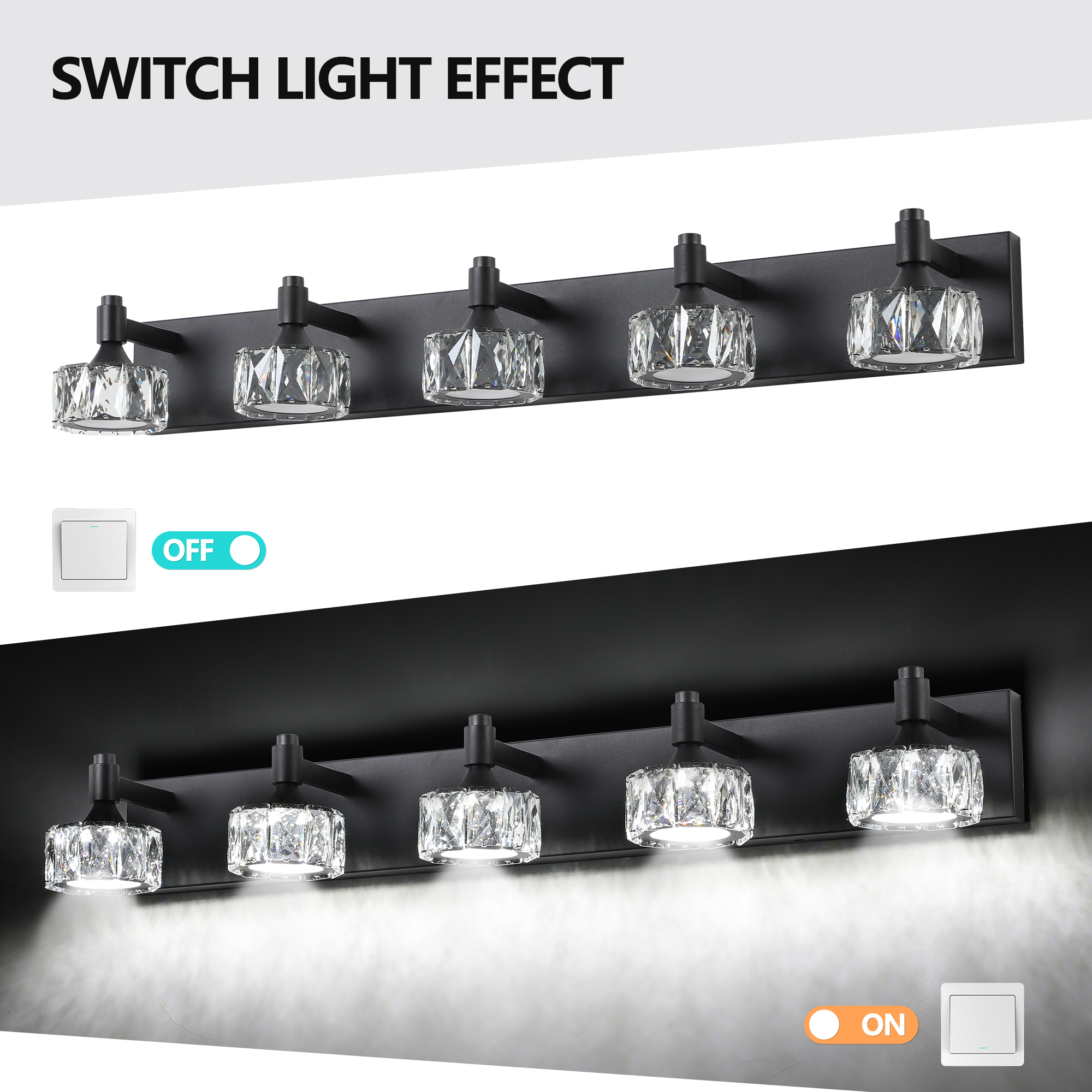 High quality crystal glass lamp shade: The use of exquisite crystal glass lamp shade, strong light transmission, to create a bright light and shadow effect, enhance the luxury of spaceFashionable matte black design: Matte black light body design, simple atmosphere, suitable for modern home decoration style, bathroom, powder room and other Spaces add a sense of fashion.Multi-functional applicability: suitable for bathroom, vanity, dressing room and other scenes, to enhance the overall atmosphere and practicality of the room.Durable rust-proof material: The main body of the lamp is made of high-quality rust-proof material, which is suitable for humid environment to ensure long service life, especially for bathroom use.Easy installation: With all the necessary installation accessories, the user can easily and quickly complete the installation.