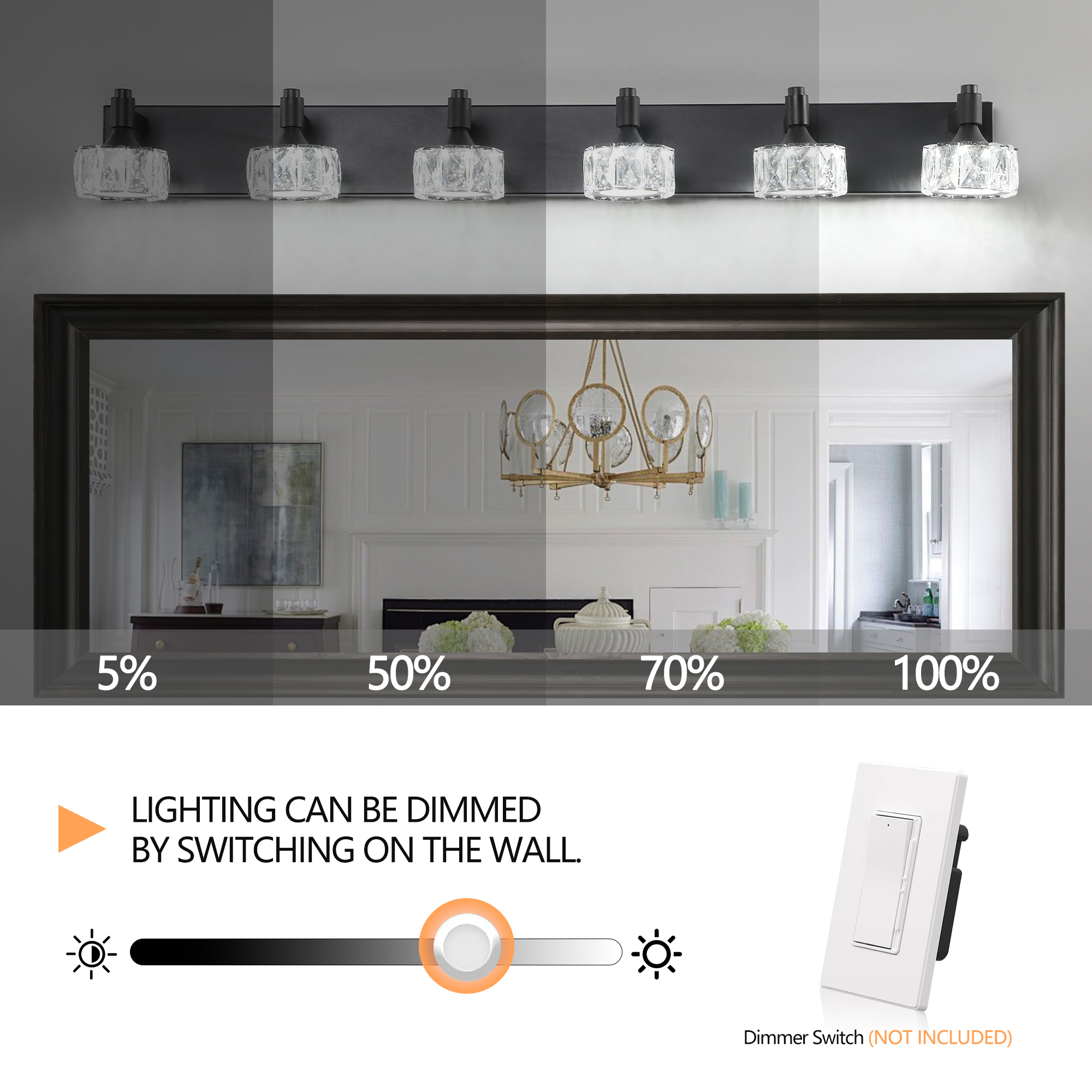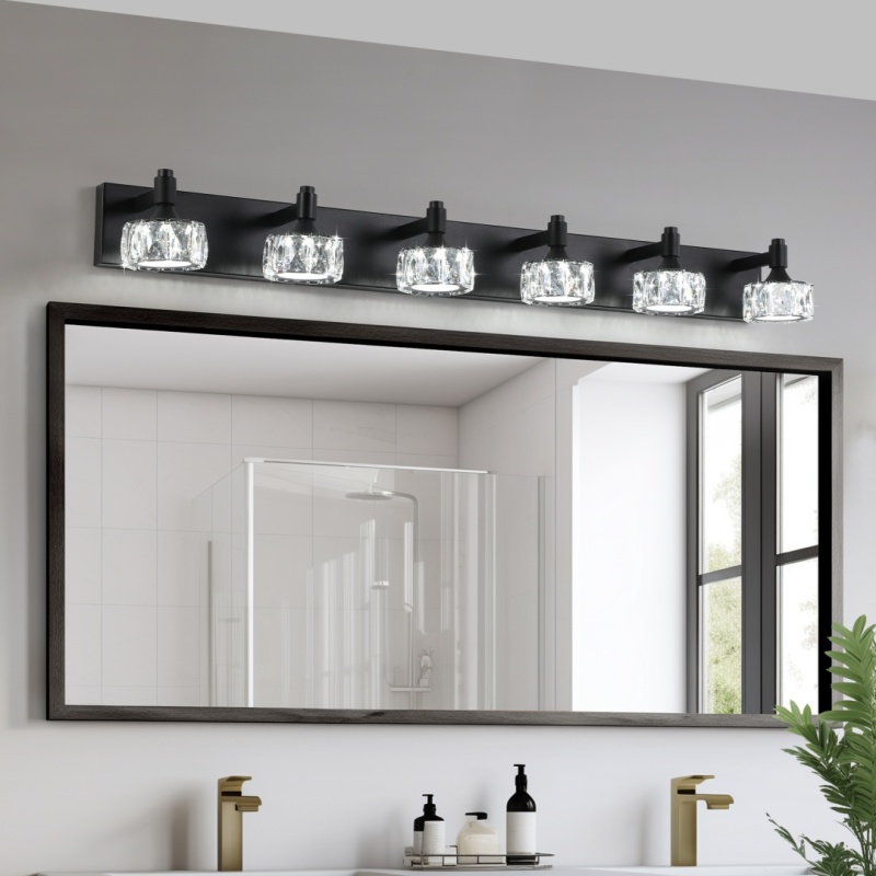 High quality crystal glass lamp shade: The use of exquisite crystal glass lamp shade, strong light transmission, to create a bright light and shadow effect, enhance the luxury of spaceFashionable matte black design: Matte black light body design, simple atmosphere, suitable for modern home decoration style, bathroom, powder room and other Spaces add a sense of fashion.Multi-functional applicability: suitable for bathroom, vanity, dressing room and other scenes, to enhance the overall atmosphere and practicality of the room.Durable rust-proof material: The main body of the lamp is made of high-quality rust-proof material, which is suitable for humid environment to ensure long service life, especially for bathroom use.Easy installation: With all the necessary installation accessories, the user can easily and quickly complete the installation.