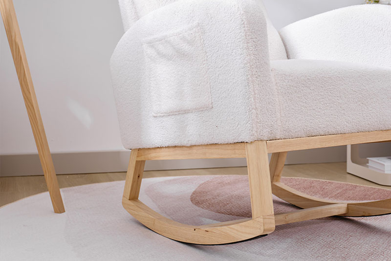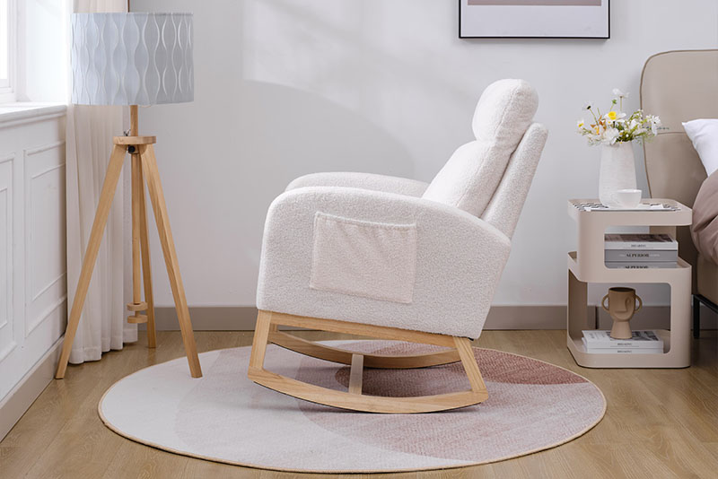 [Soft Fabric & Practical Side Pocket] Covered with high quality polyester fabric, the surface is breathable and easy to maintain. The simple color and smooth lines make this kids rocking chair very stylish and chic. What's more, there is a pocket on the side of the armrest, which is convenient for you to put magazines and TV controller.