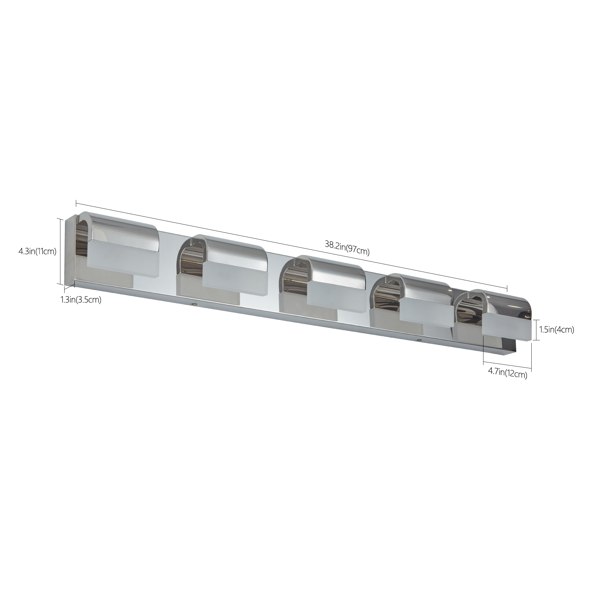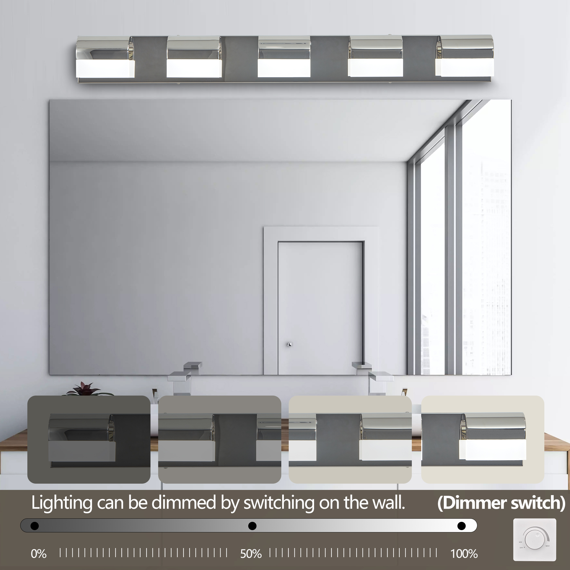 [Vanity Wall Sconce Features]: Modern and minimalist luxury LED vanity mirror lights. Creative 5 vanity wall sconce. The high-transmittance acrylic lampshade has a uniform and soft light, high quality stainless steel bathroom mirror front lamp. Simple and beautiful design, warm and comfortable, and stylish and elegant decoration.[Detailed Information]: Length: 87cm/34.3inch; Width: 9cm/3.5inch; Height: 11cm/4.3inch. Built-in LED light source, light source power: 25W, Color temperature: 6000K(cool white).Energy Efficiency: Utilizes LED technology that can save up to 80% electricity compared to conventional light bulbs and has a long lifespan of up to 50,000 hours.Dimming Feature: Supports dimming (though a dimmer needs to be self-equipped), allowing for customized lighting levels.Easy Installation: It's hardwired with no switch or plug on the fixture itself, making the installation process straightforward.
