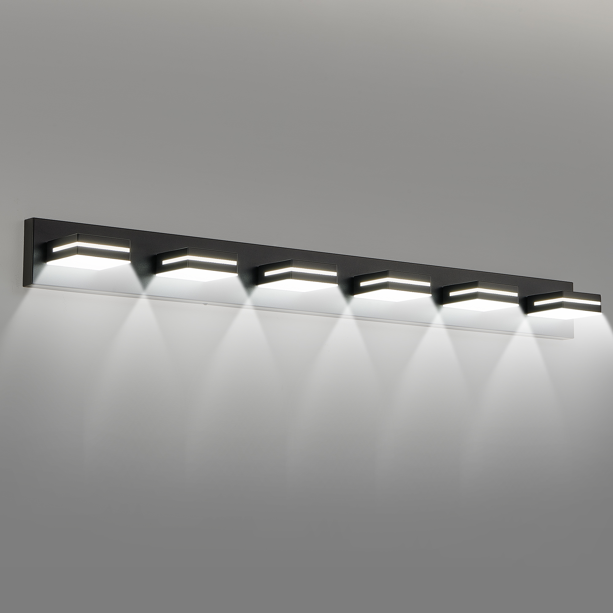 Modern minimalist design:The black body paired with geometric lamp heads is stylish and atmospheric, suitable for various modern decoration styles.Efficient LED lighting:Built in high brightness LED light source, providing sufficient and soft lighting, energy-saving and environmentally friendly, with a long service life.Multi head layout, uniform lighting:6 lamp head designs ensure even distribution of light, making it perfect for lighting needs in bathroom mirrors or makeup areas.Durable material:Made of high-quality metal material, rust and corrosion resistant, durable and suitable for use in high humidity environments such as bathrooms or toilets.Easy to install:Equipped with simple installation accessories, it is convenient and fast to complete the installation without complex operations.