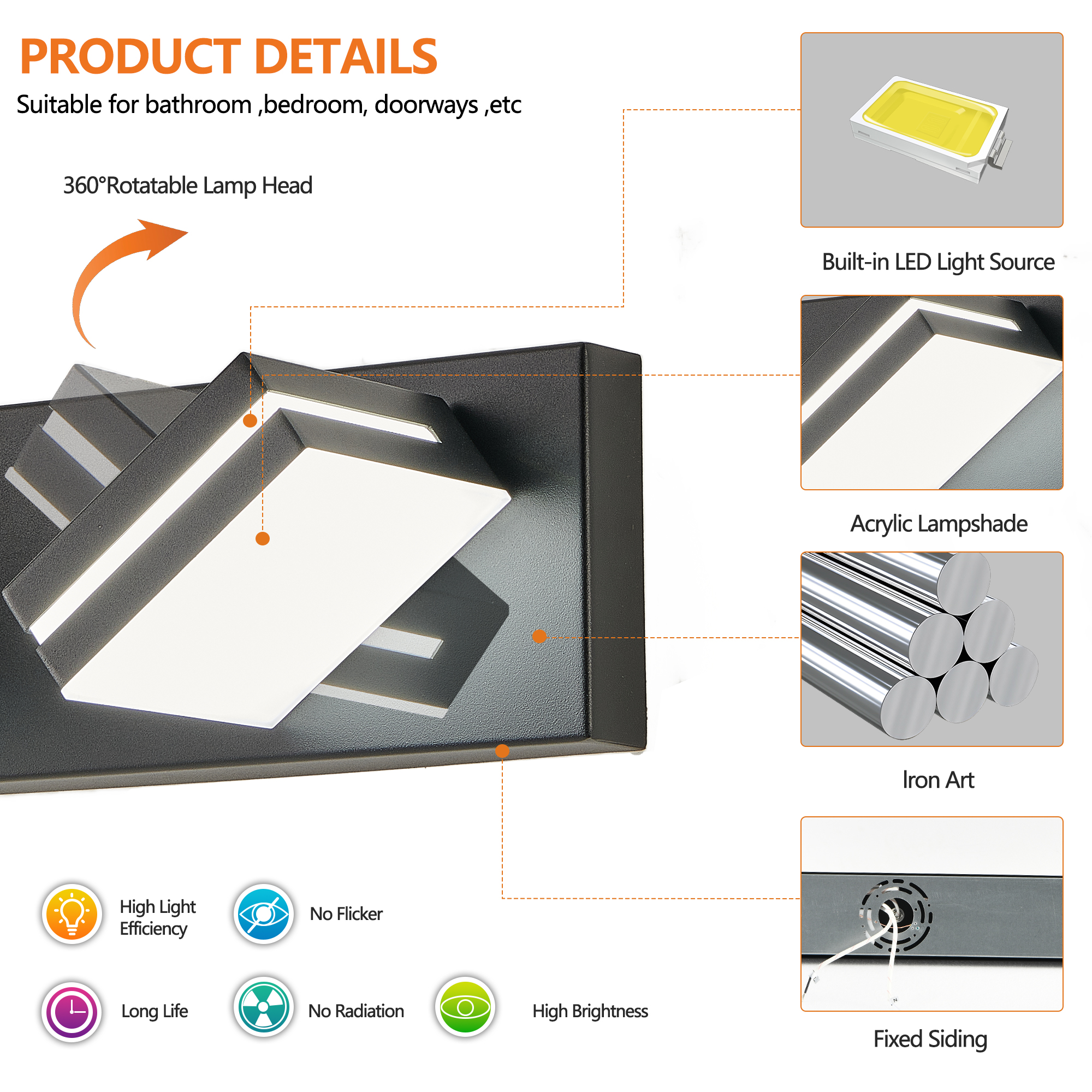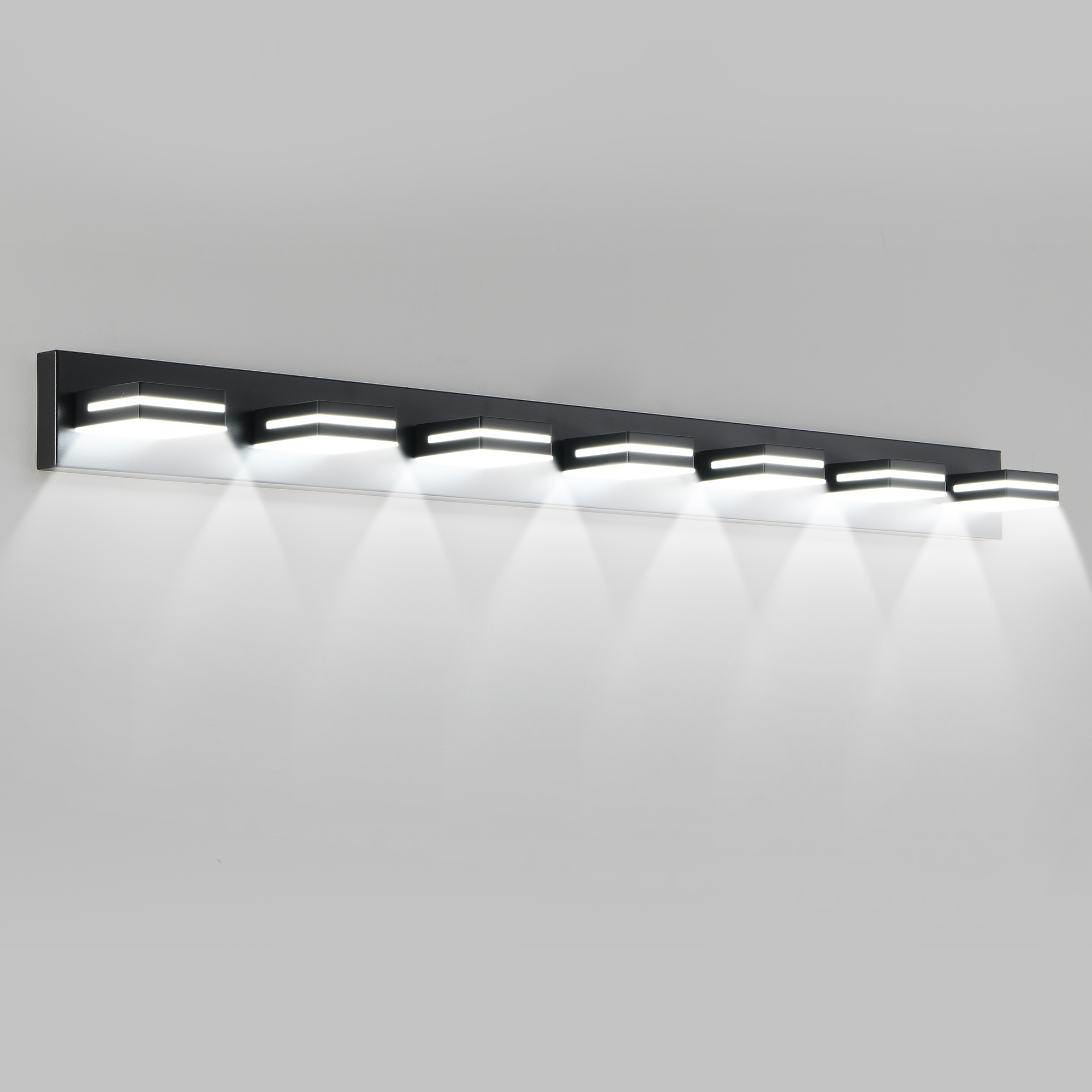 Modern minimalist design:The black body paired with geometric lamp heads is stylish and atmospheric, suitable for various modern decoration styles.Efficient LED lighting:Built in high brightness LED light source, providing sufficient and soft lighting, energy-saving and environmentally friendly, with a long service life.Multi head layout, uniform lighting:7 lamp head designs ensure even distribution of light, making it perfect for lighting needs in bathroom mirrors or makeup areas.Durable material:Made of high-quality metal material, rust and corrosion resistant, durable and suitable for use in high humidity environments such as bathrooms or toilets.Easy to install:Equipped with simple installation accessories, it is convenient and fast to complete the installation without complex operations.