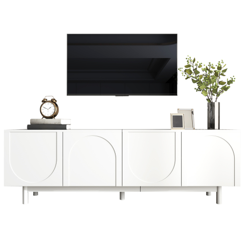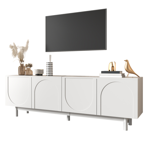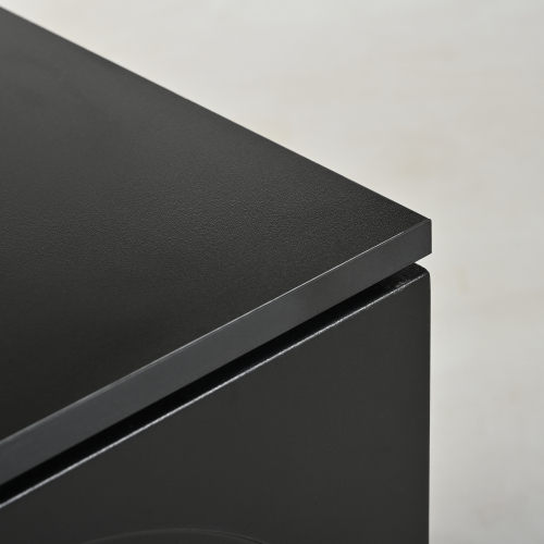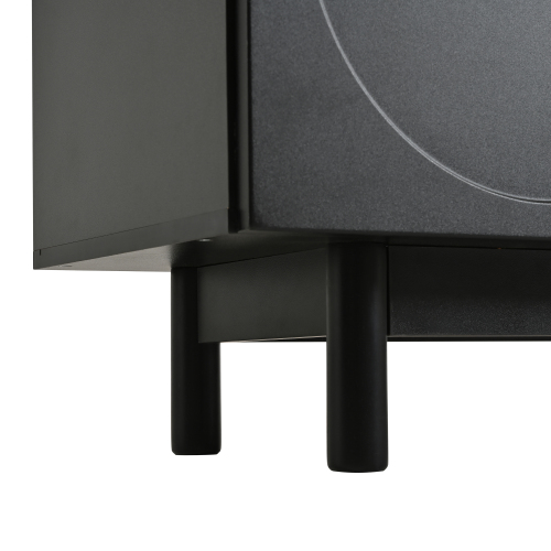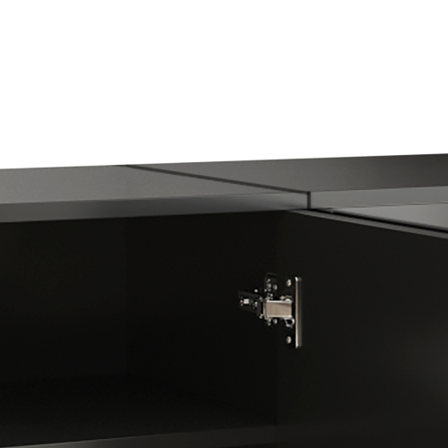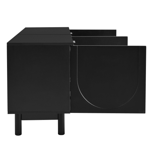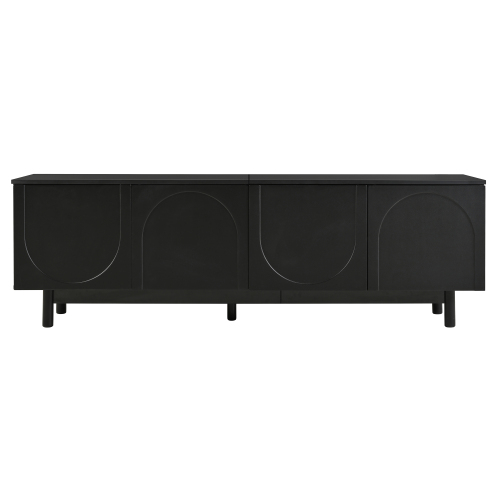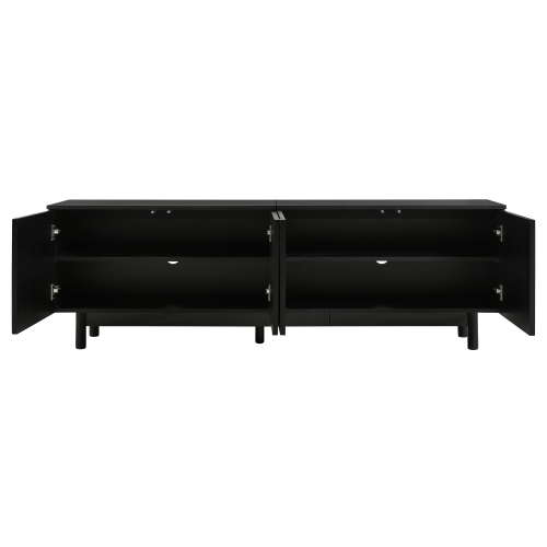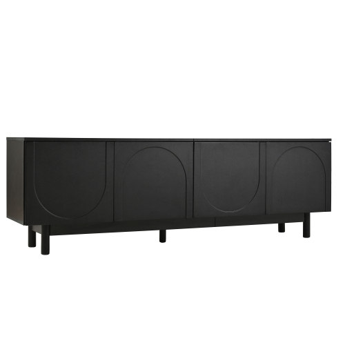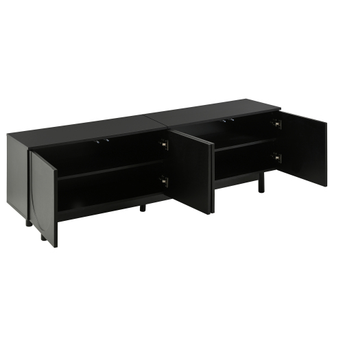 This elegant black TV cabinet impresses with an outstanding combination of modern design and practical functionality. Measuring 175 cm x 38 cm x 56 cm, it offers a generous storage solution for multimedia devices, books, and other items. The four uniquely textured doors, which open without handles using the push-to-open mechanism, emphasize the minimalist and luxurious appearance. Behind each door is a storage space with an adjustable shelf that can be flexibly adapted to your needs. This ensures neat organization and makes the TV cabinet a versatile choice for modern living spaces. The sturdy black wooden legs provide stability and harmonize perfectly with the rest of the design. Made of high-quality wood and equipped with premium fittings, this TV cabinet offers durability and stability. The thoughtful design not only allows for a tidy look but also adds a touch of elegance to your living room. The black finish makes it a timeless piece of furniture that blends seamlessly into any interior. An absolute must-have for anyone who wants to combine style, functionality, and quality in one piece of furniture.