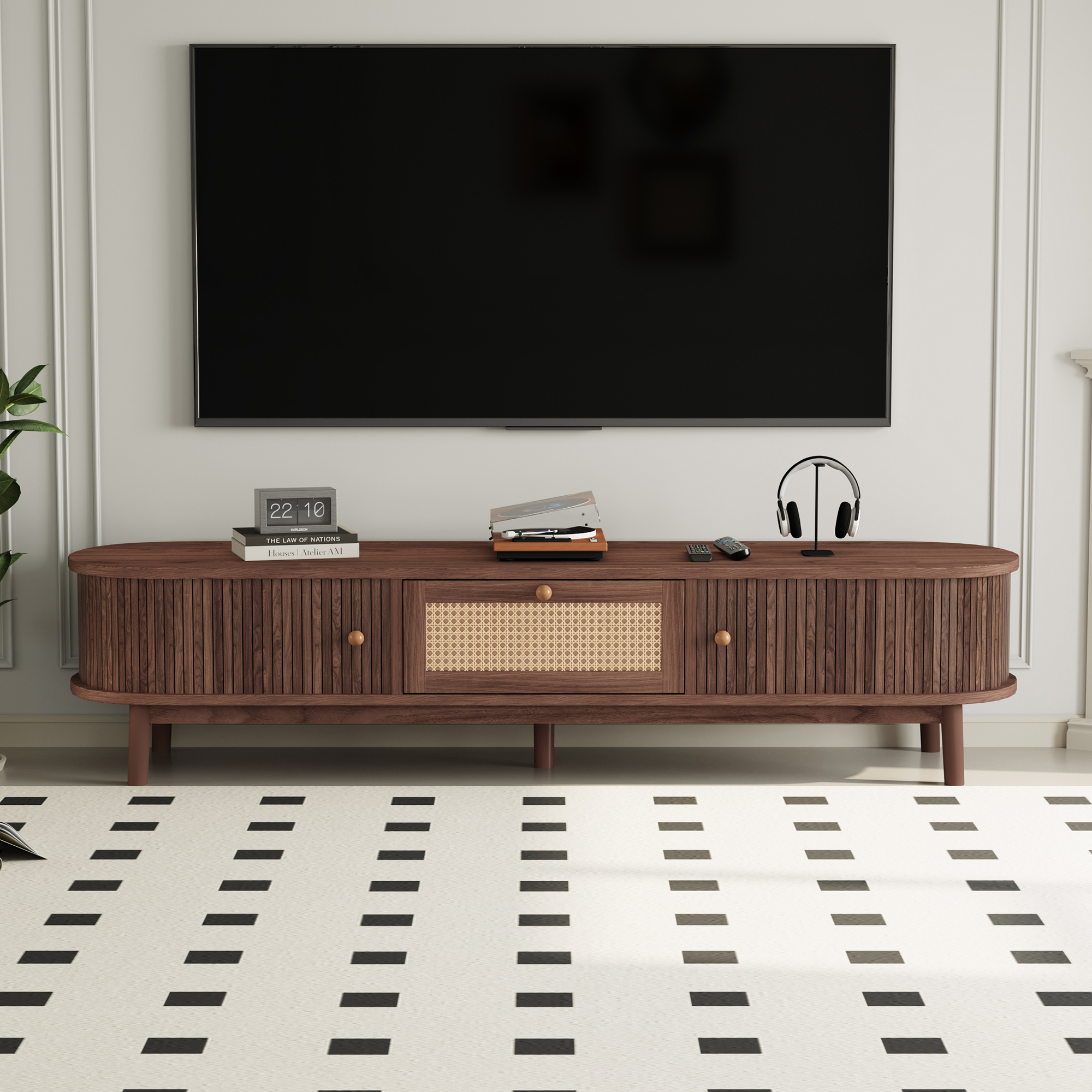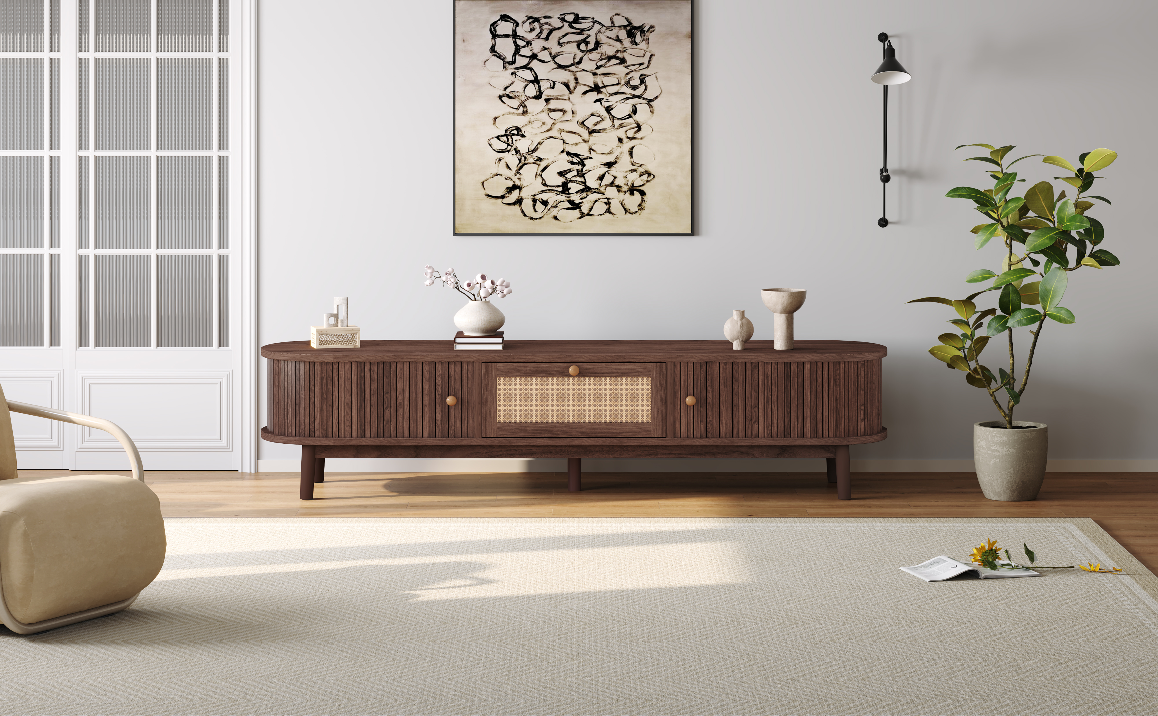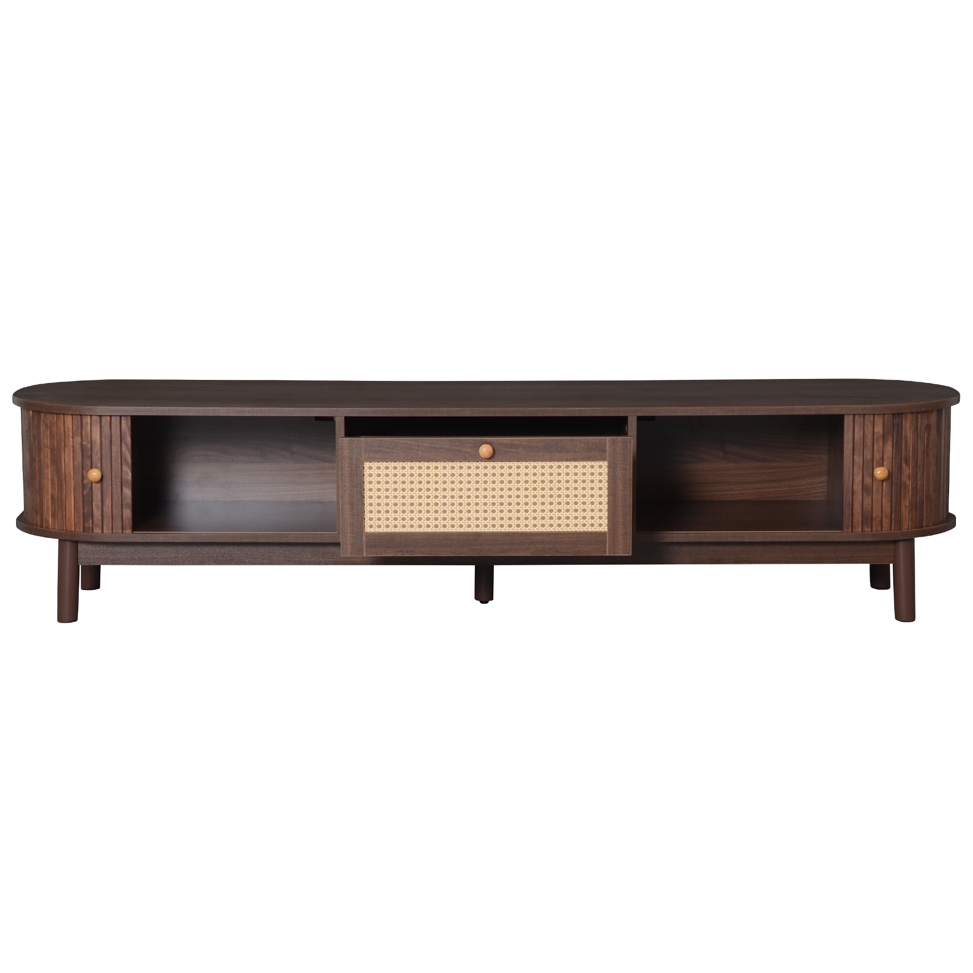 Elevate your living space with this stylish and functional TV stand, featuring interwoven rattan drawers and exquisite handles for a timeless look that suits any design. Built with solid wood legs and a smooth, waterproof surface, it combines durability with effortless maintenance. The smart sliding doors and multifunctional storage provide convenient, space-saving organization for your media essentials.