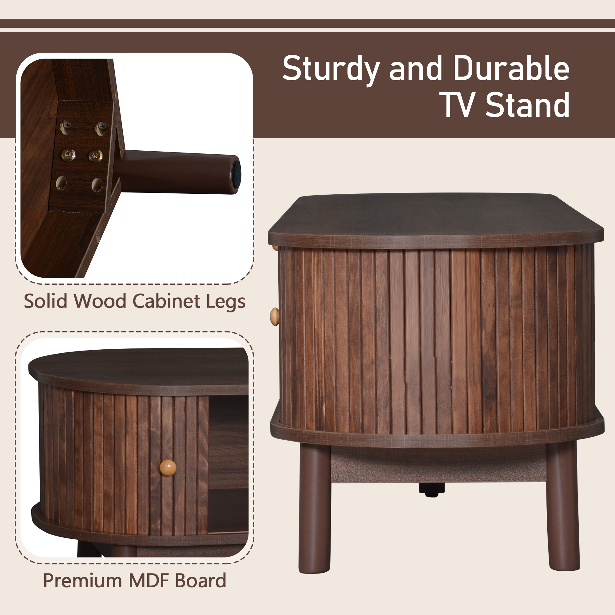 This TV stand ensures lasting durability while premium MDF board and solid wood cabinet legs.