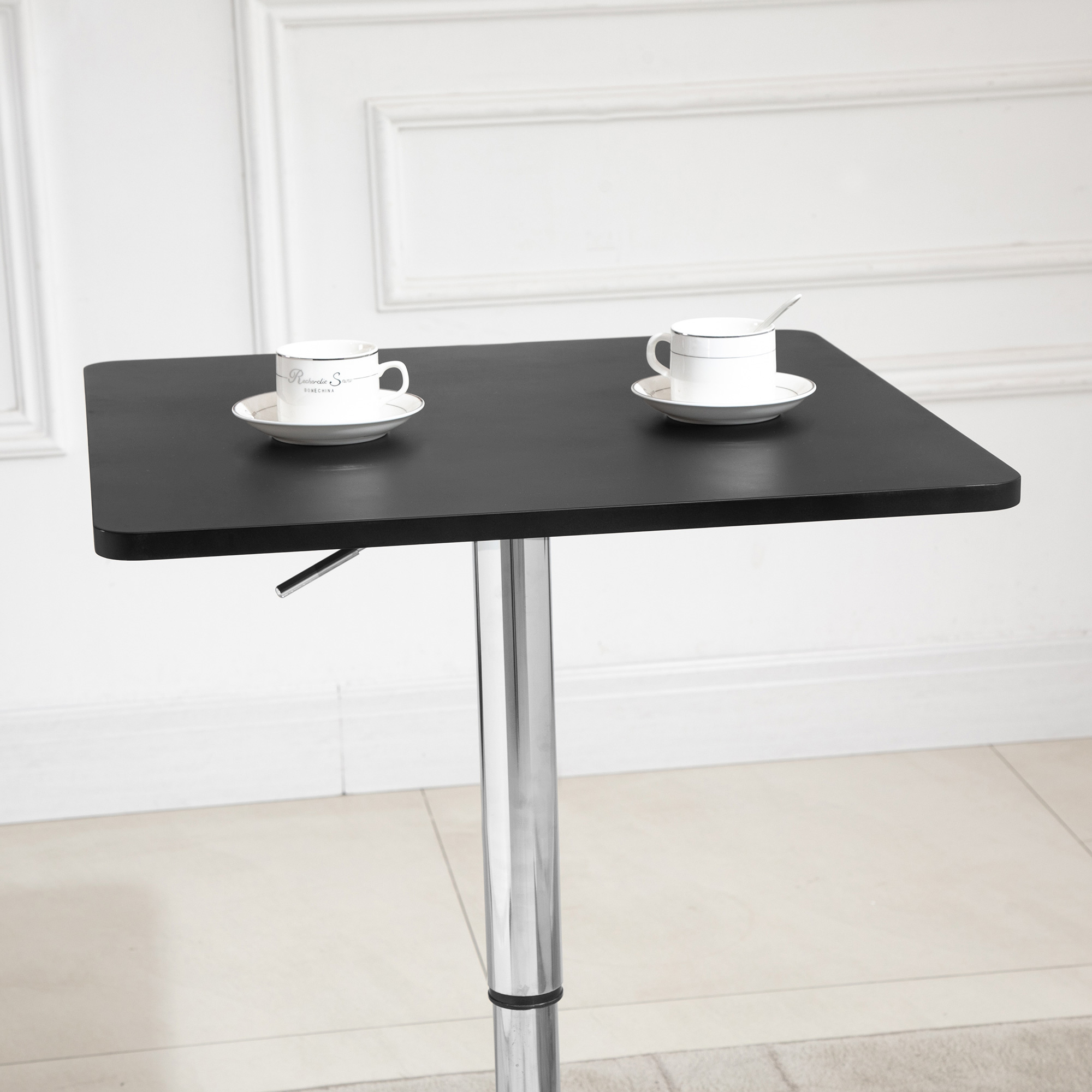 Stylish dining, at any height, doesn't come much easier than this. Look to this adjustable bar table from for the perfect place to eat, drink and relax - at any time of day. It uses polished steel for the frame with a large round base, which not only ensures it keeps steady and balanced, but gives it an overall beautiful and sleek look. The frame is adjustable so you can set to a level which is most comfortable. It comes complete with the square table top for a flat surface to use.