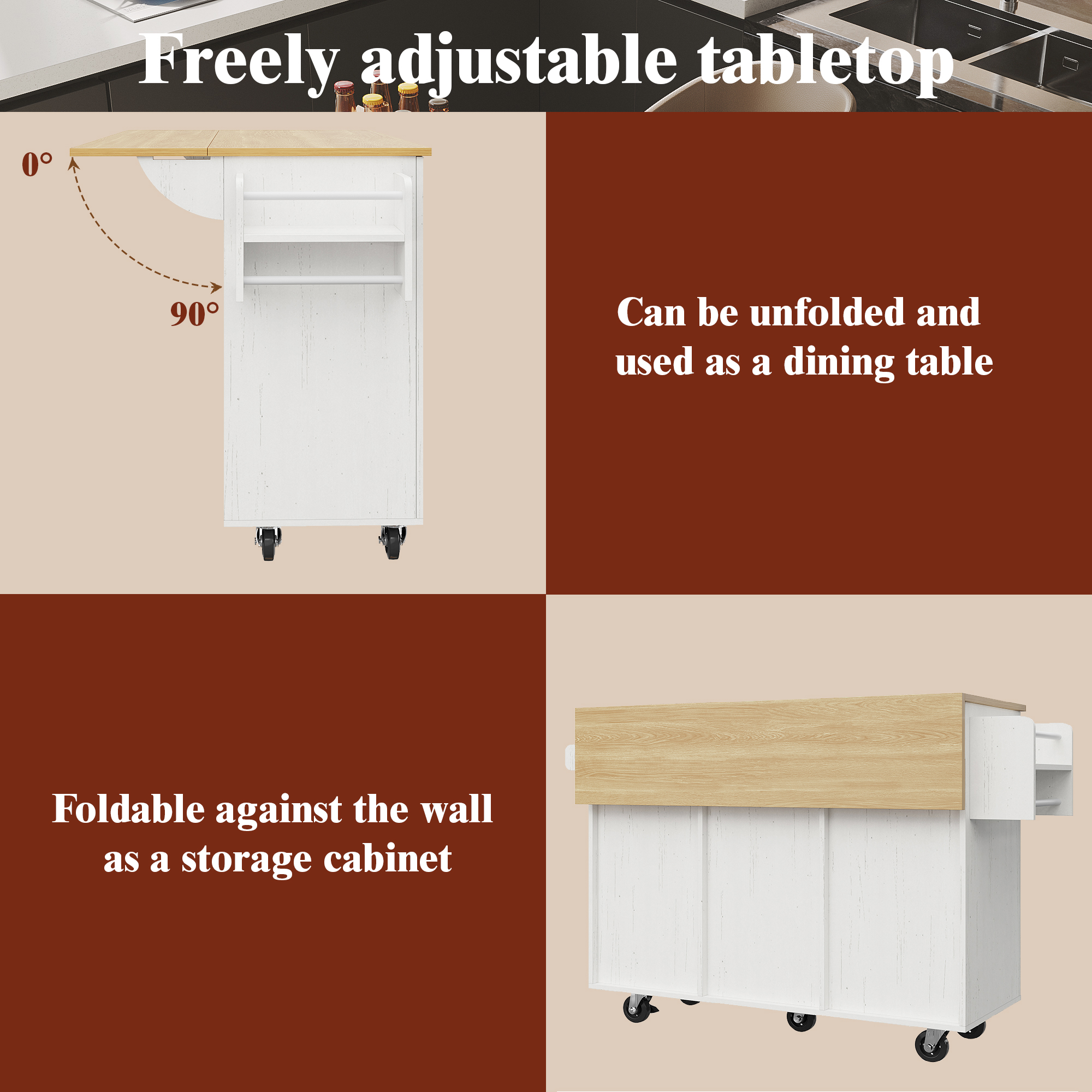 The dining cart's tabletop folds in and out, allowing it to be used as a dining table or folded against the wall as a storage cabinet, saving space and being multi-functional. The base is equipped with fixed wheels, making it easy to move and secure, and suitable for use in a variety of scenarios. This multi-functional, beautiful, and practical kitchen cart is perfect for improving the efficiency and aesthetics of your kitchen.