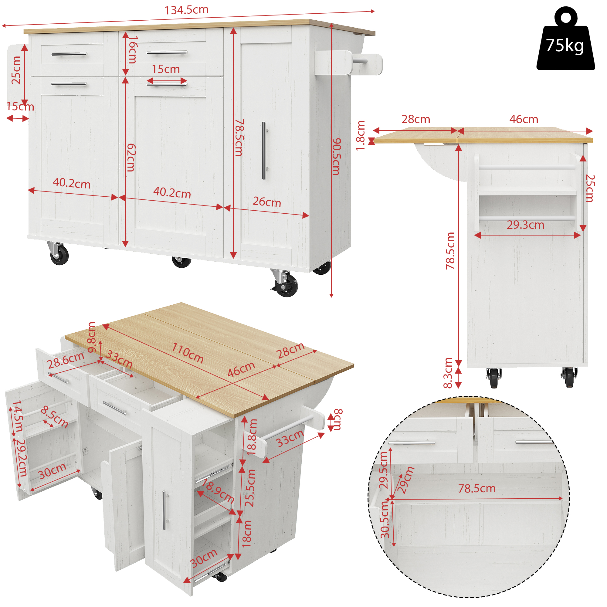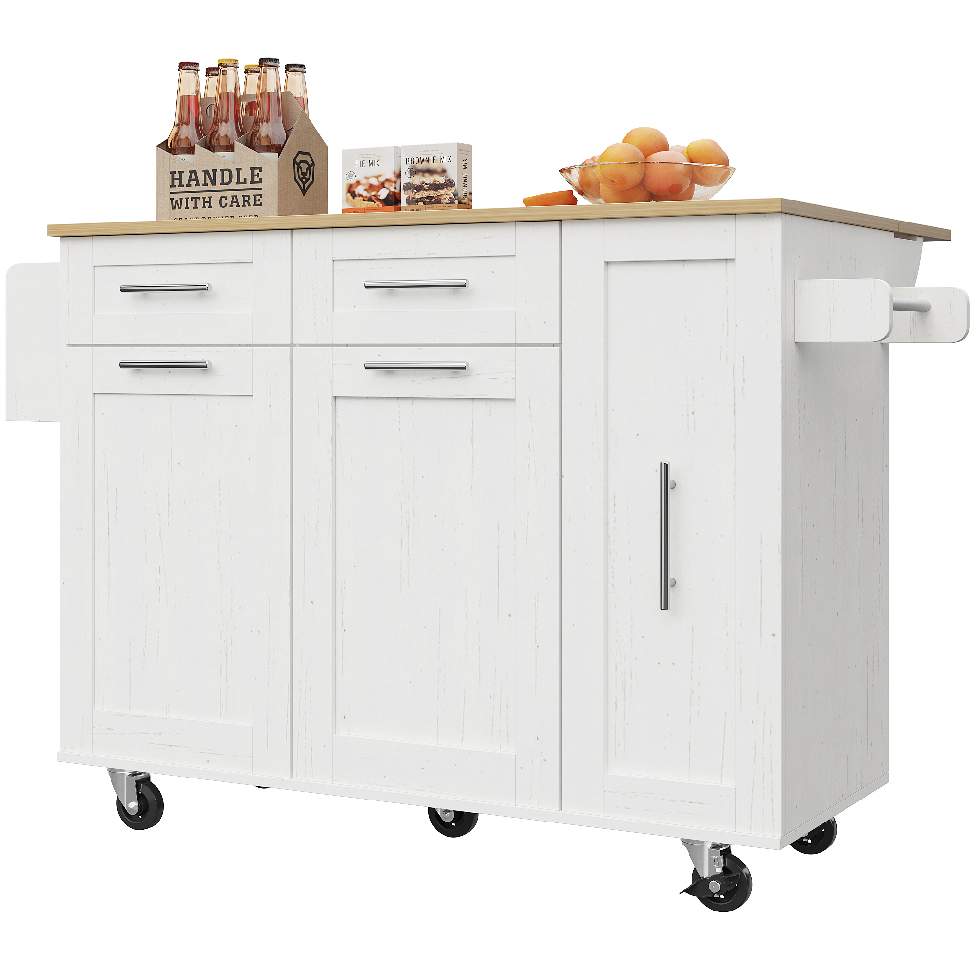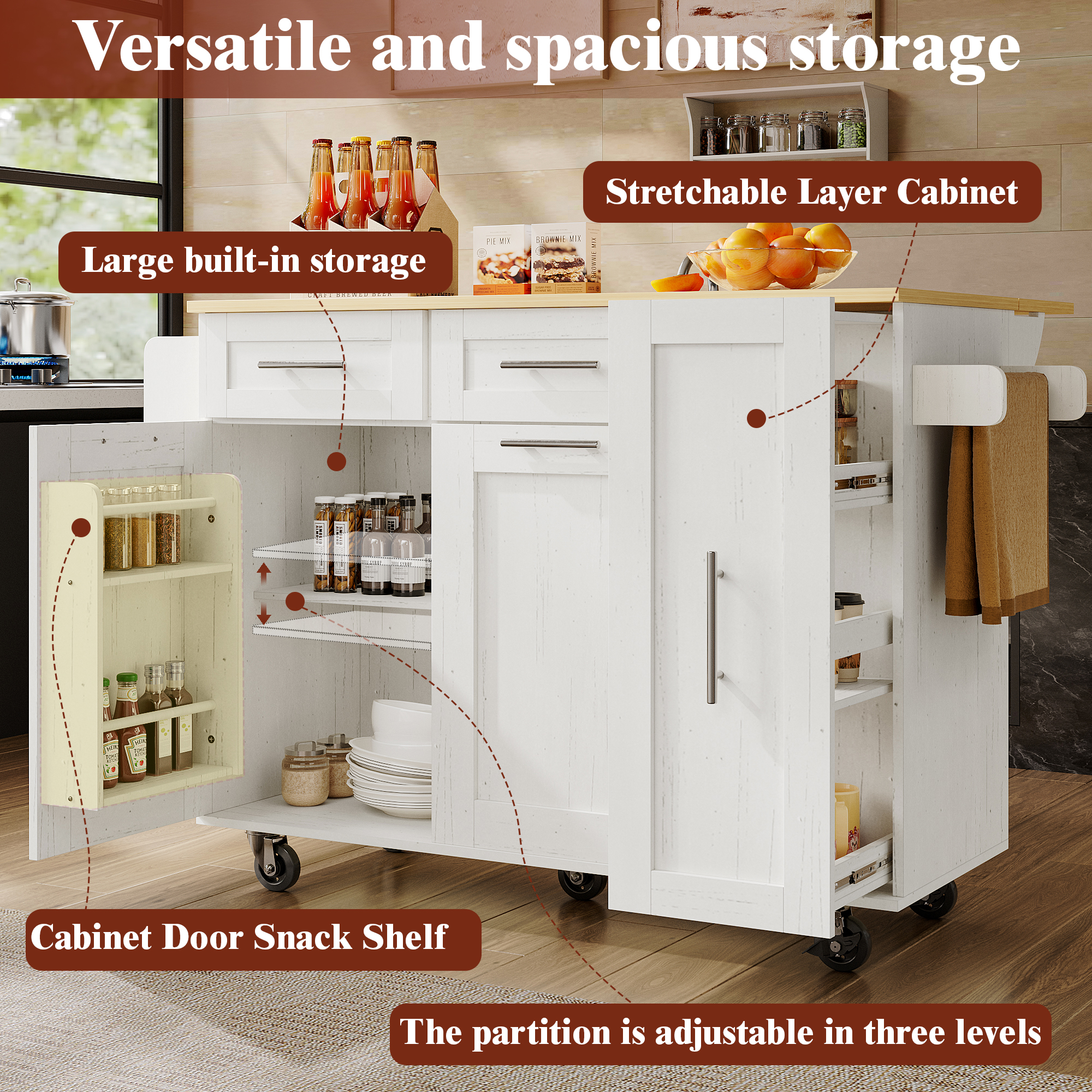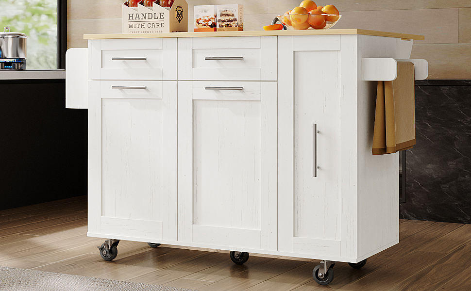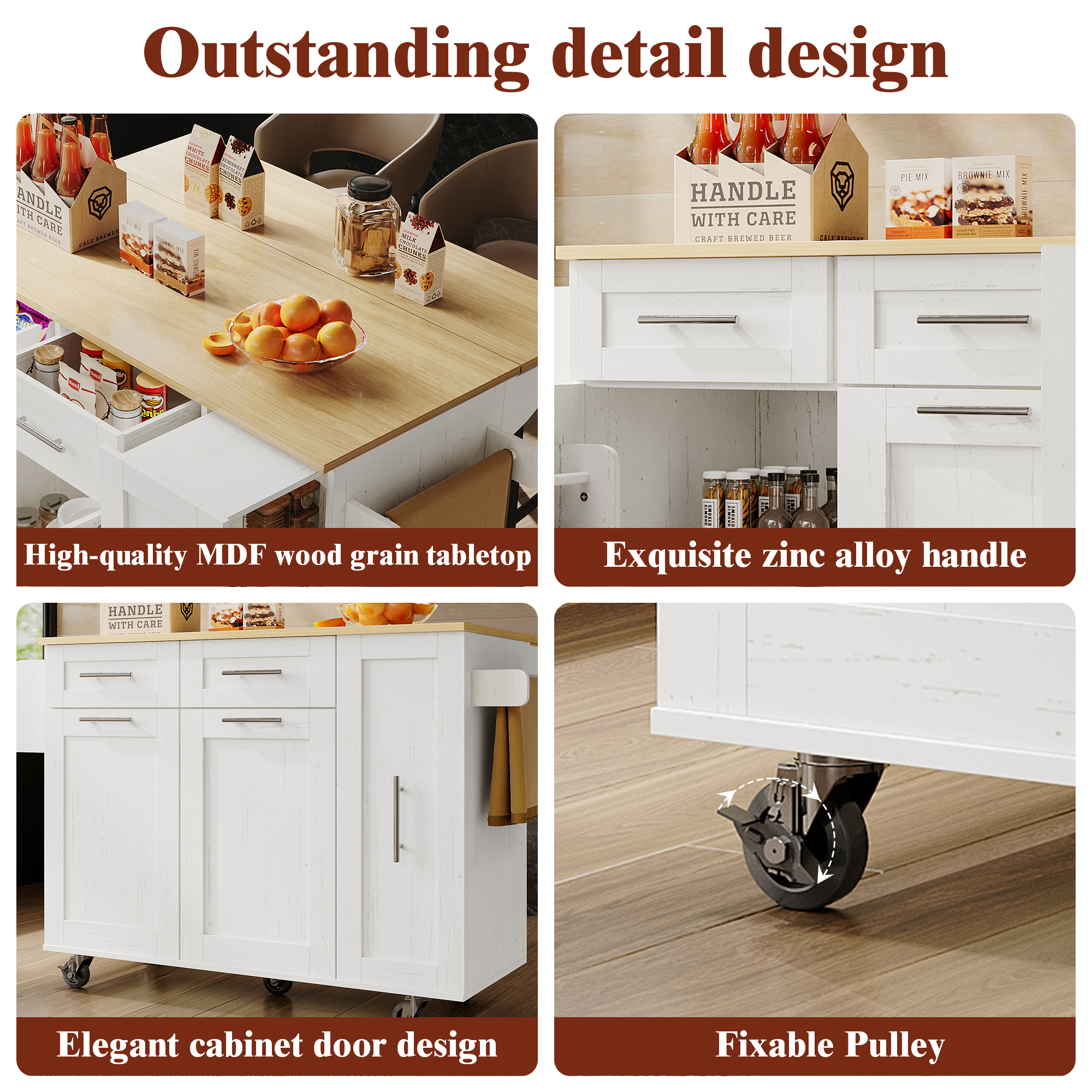 Product Name:Modern kitchen island, kitchen cabinet, buffet cabinet, dining cart with wood grain, dining table with storage space, dining cart with snack shelves and stretch function cabinets, white