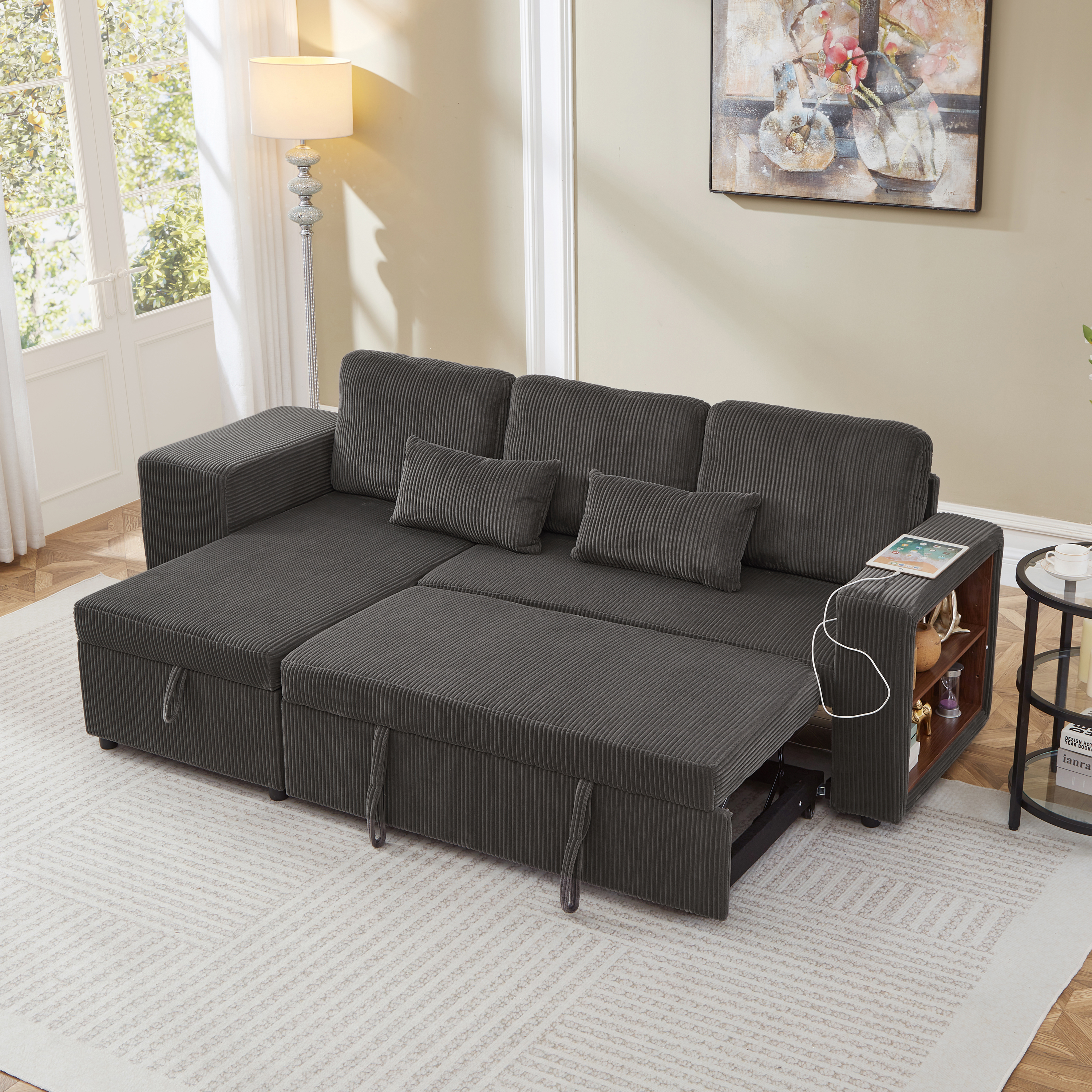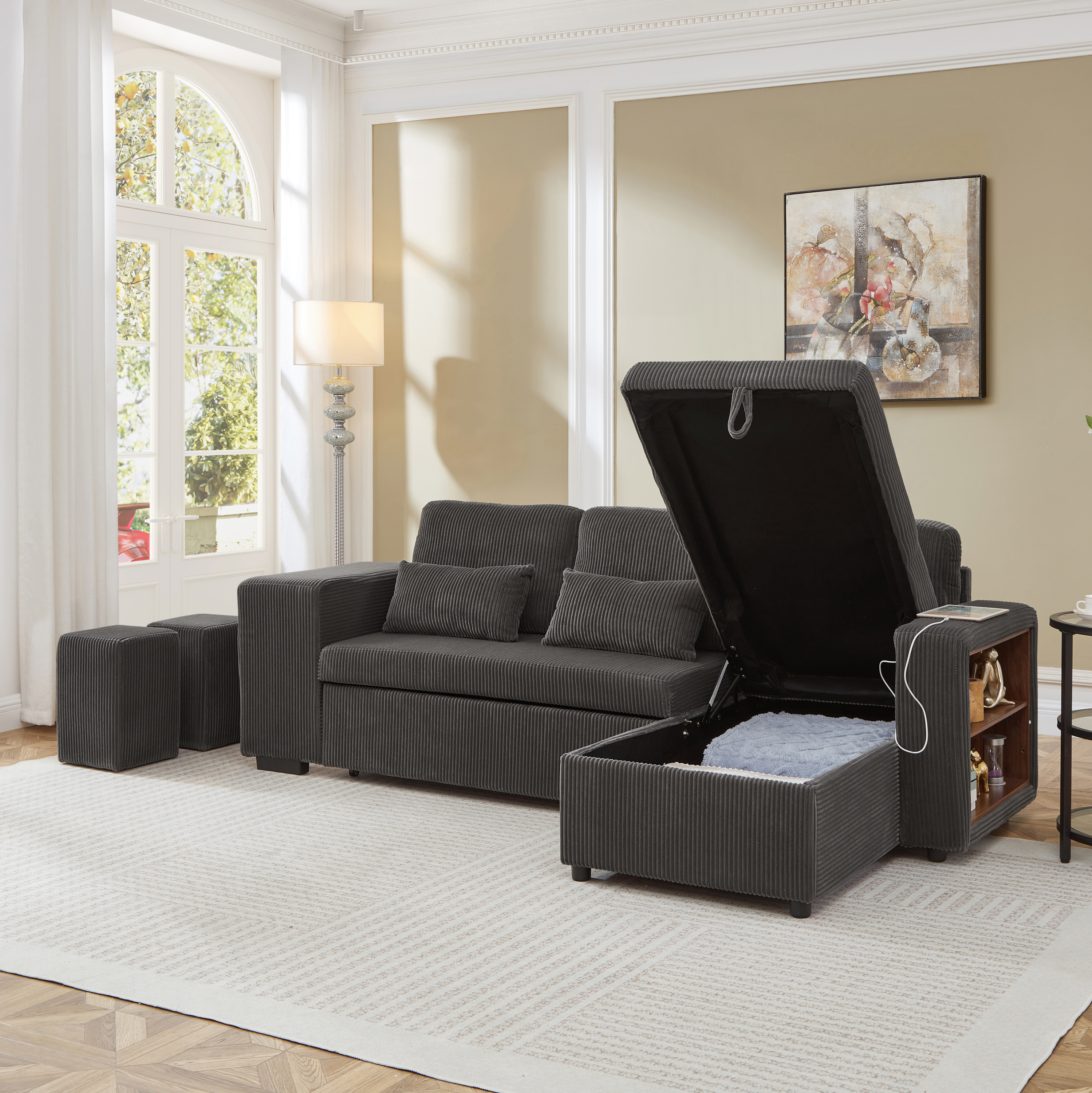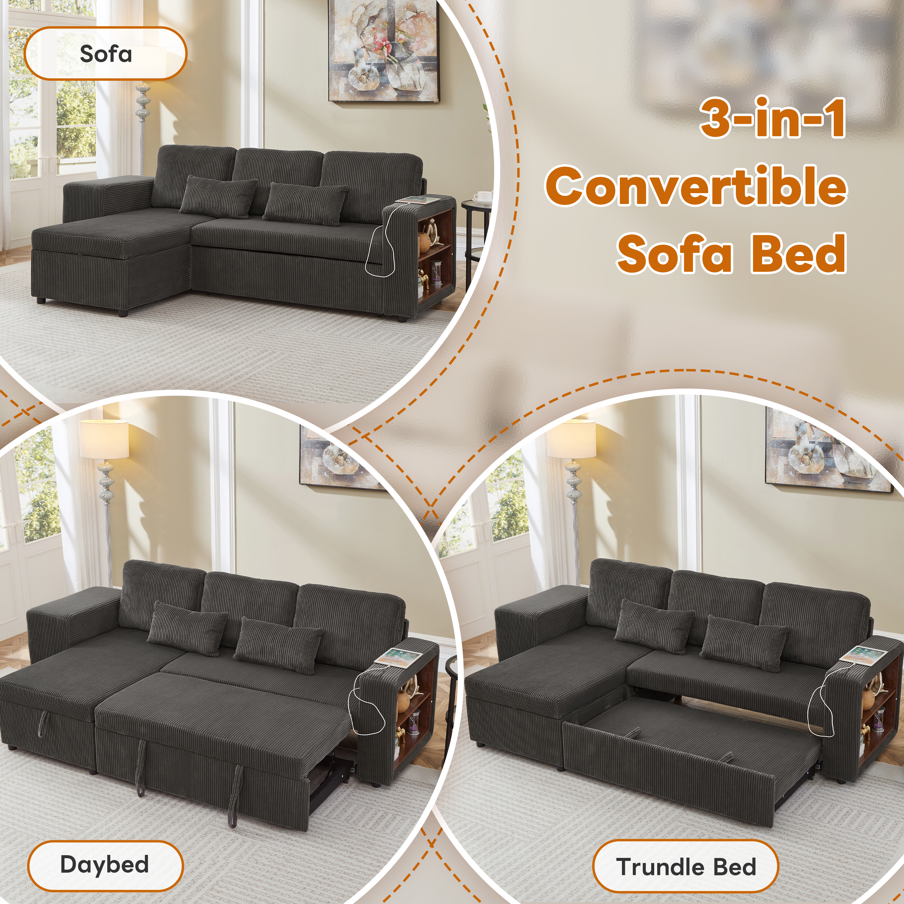 Experience the perfect blend of luxury and utility with this L-shaped sectional. Wrapped in premium corduroy, this 3-in-1 sofa bed transitions effortlessly from a chic settee to a cosy daybed or guest sleeper. Designed for maximum efficiency, it features a reversible configuration for two installation options and a spacious internal storage chaise to maintain a clutter-free home. With an integrated charging station and side shelving adjustable by 6cm, your essential is within reach. This is more than furniture; it is a complete hub for relaxation and modern convenience. Special Features - Three convertible forms: sofa, trundle bed and daybed - Reversible chaise: two ways installation - Chaise with internal storage - Smart charging station - Space-saving nesting footstools - Adjustable armrest storage - Soft corduroy fabric and high-density foam - Appearance design suitable for various home styles