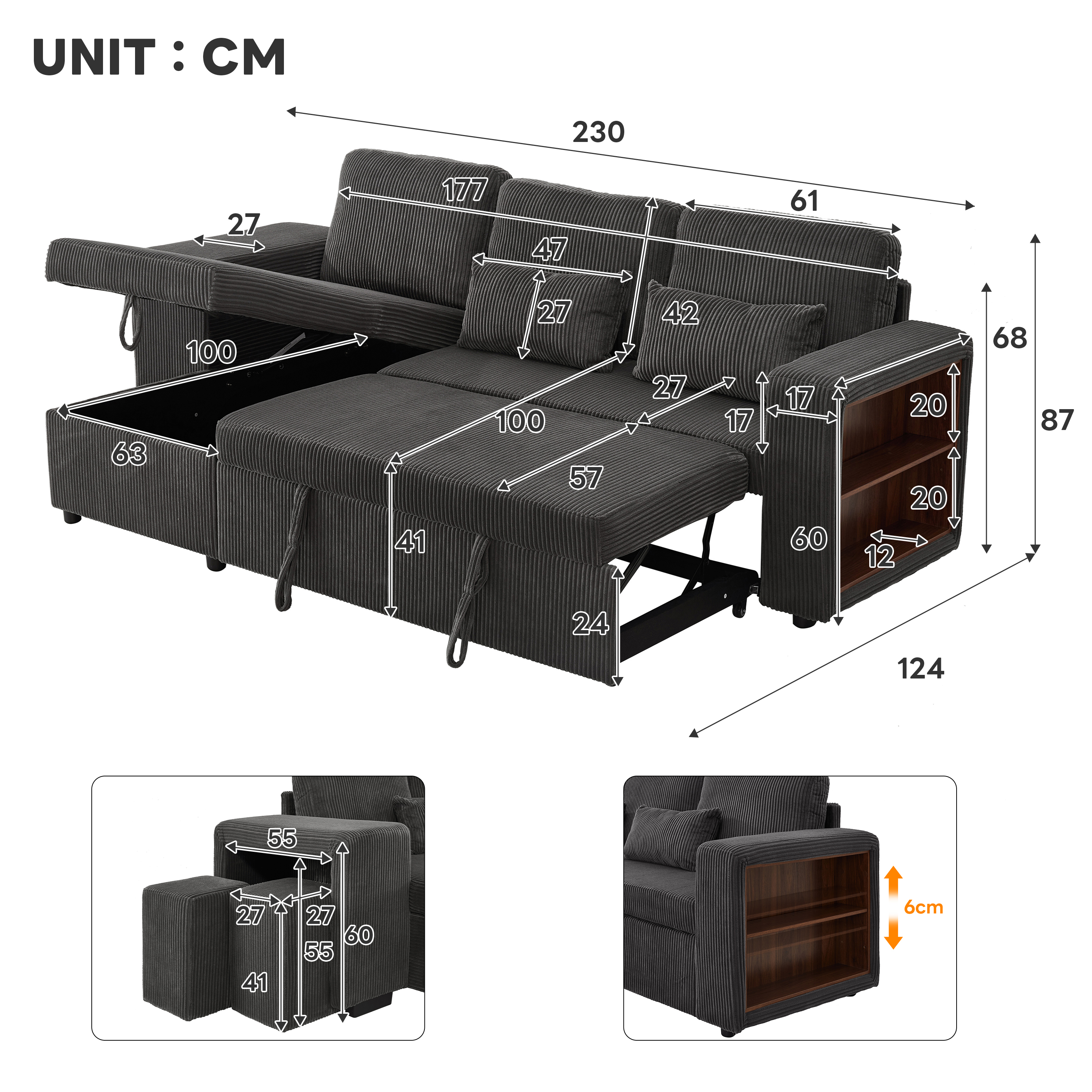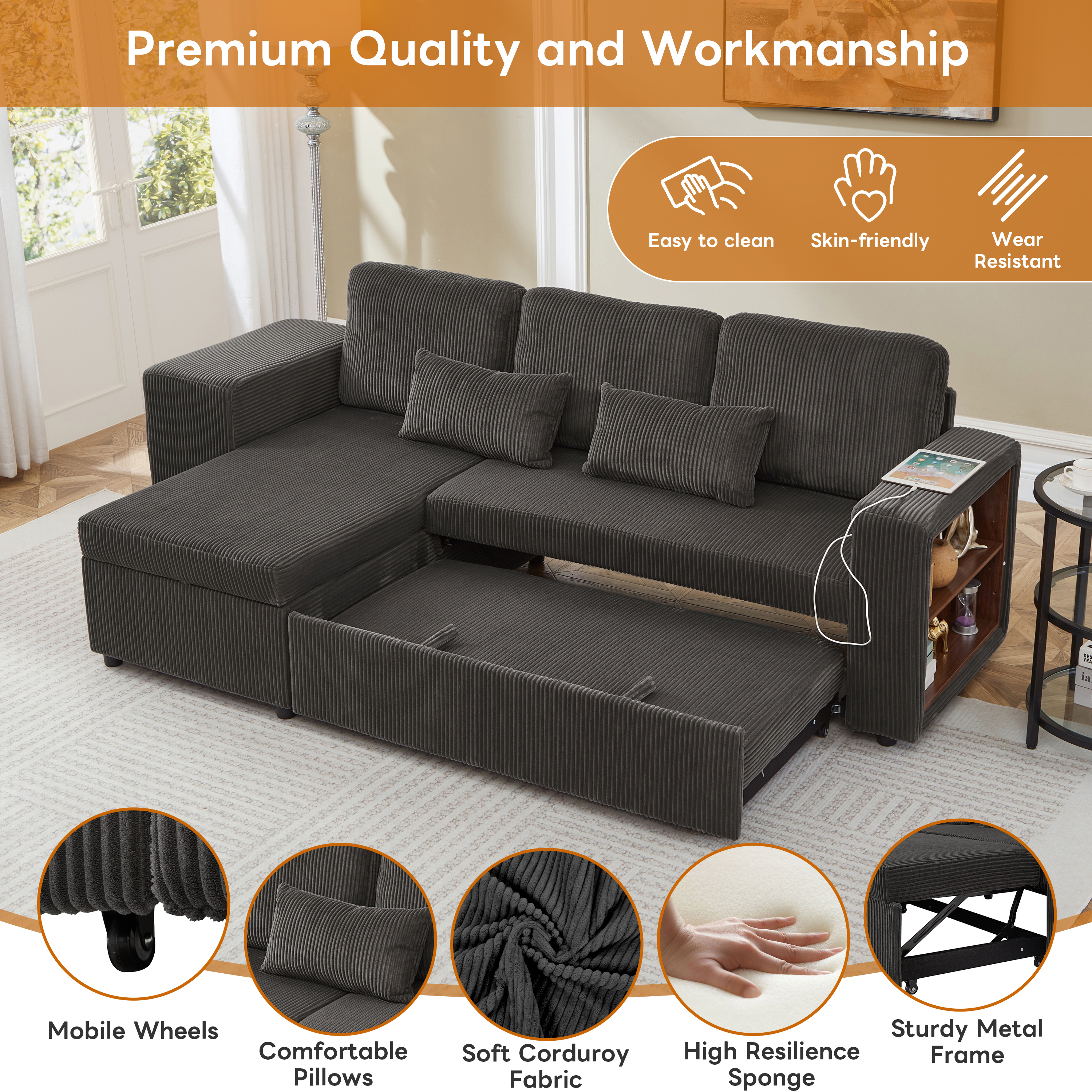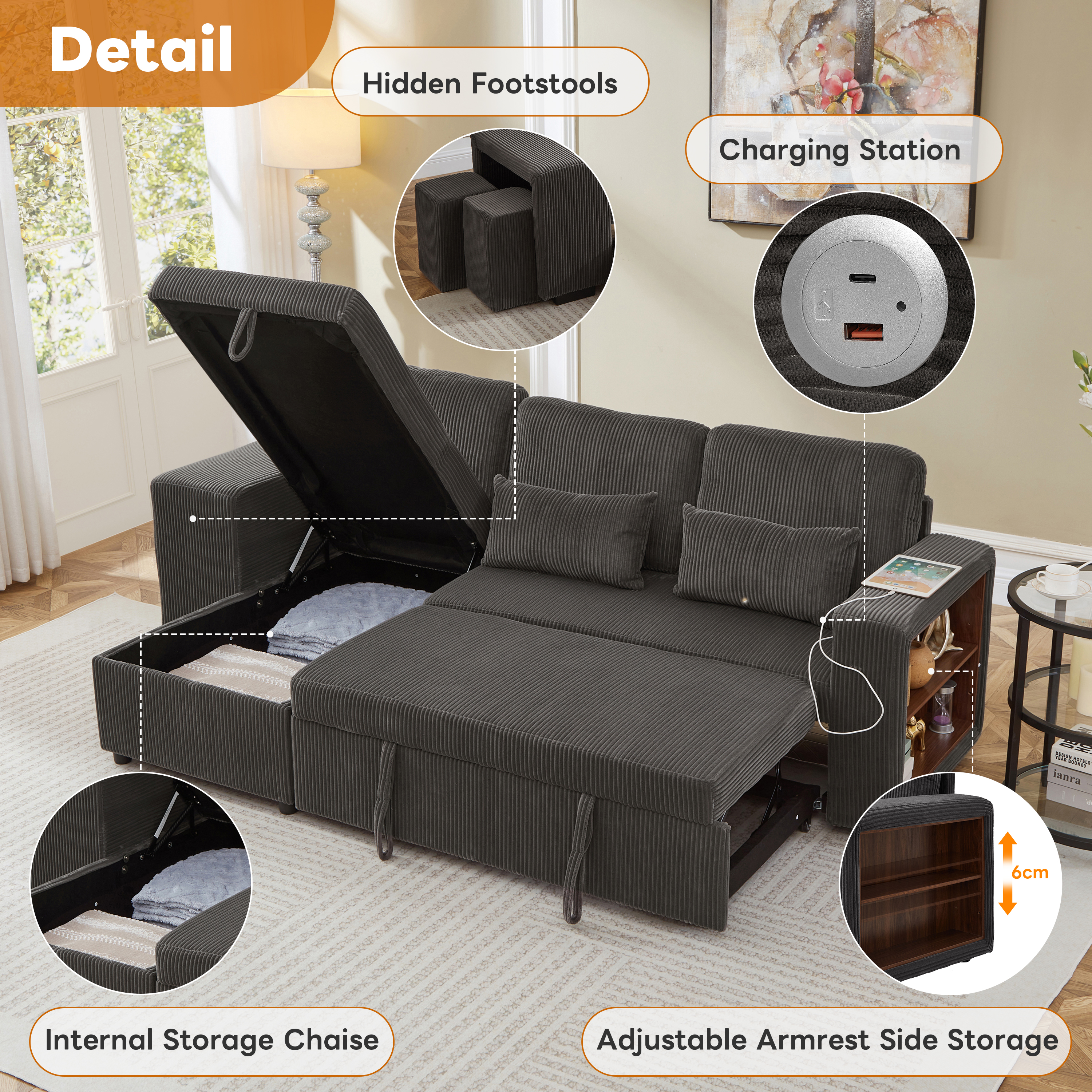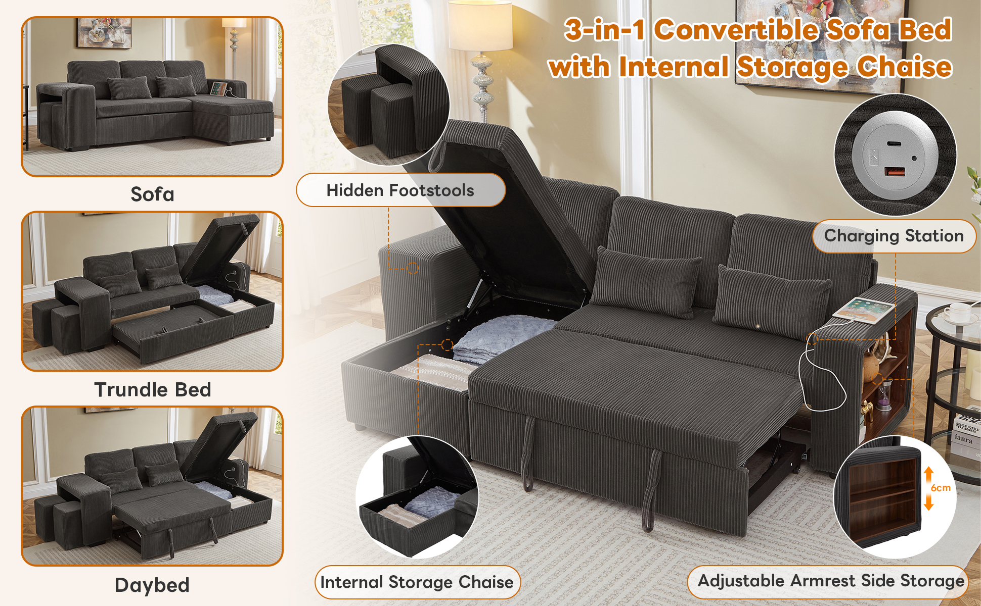 Experience the perfect blend of luxury and utility with this L-shaped sectional. Wrapped in premium corduroy, this 3-in-1 sofa bed transitions effortlessly from a chic settee to a cosy daybed or guest sleeper. Designed for maximum efficiency, it features a reversible configuration for two installation options and a spacious internal storage chaise to maintain a clutter-free home. With an integrated charging station and side shelving adjustable by 6cm, your essential is within reach. This is more than furniture; it is a complete hub for relaxation and modern convenience. Special Features - Three convertible forms: sofa, trundle bed and daybed - Reversible chaise: two ways installation - Chaise with internal storage - Smart charging station - Space-saving nesting footstools - Adjustable armrest storage - Soft corduroy fabric and high-density foam - Appearance design suitable for various home styles