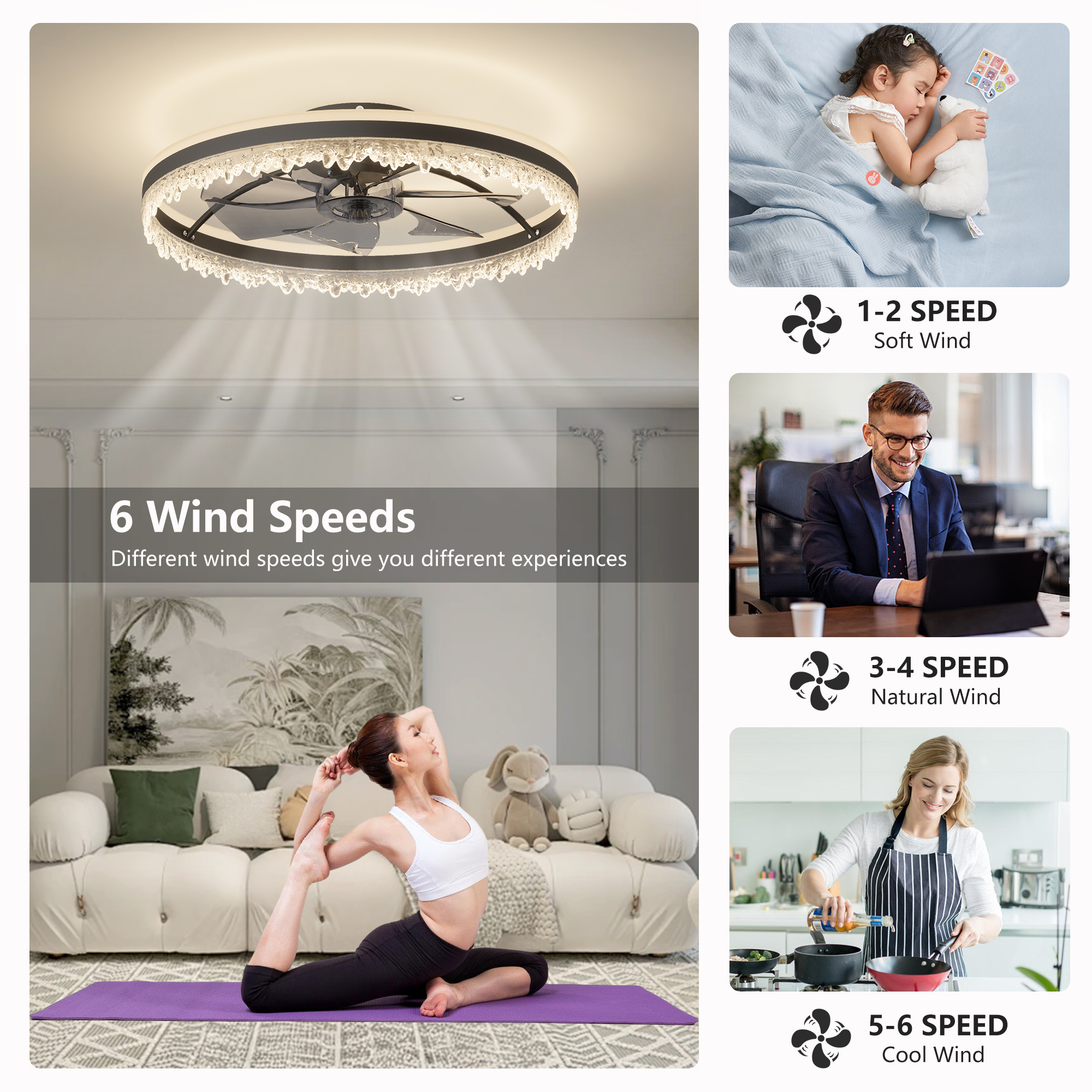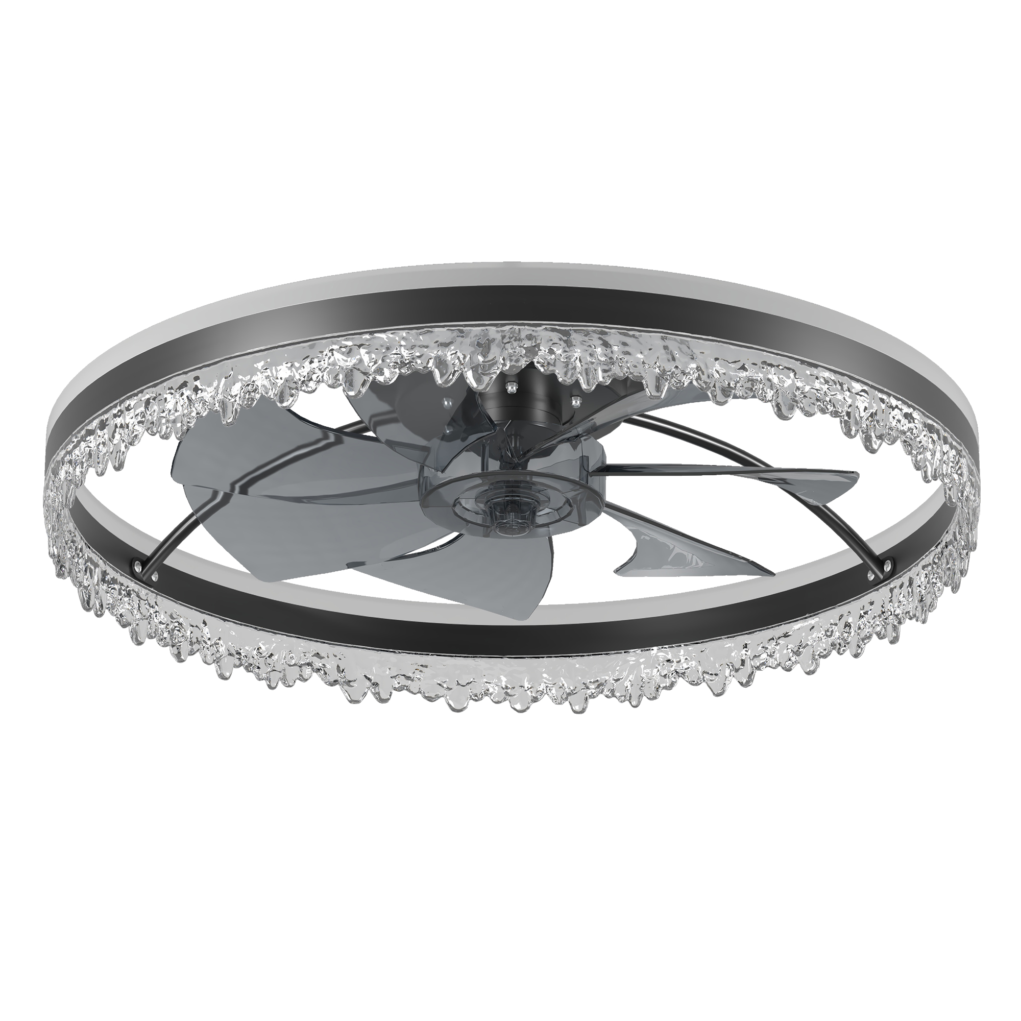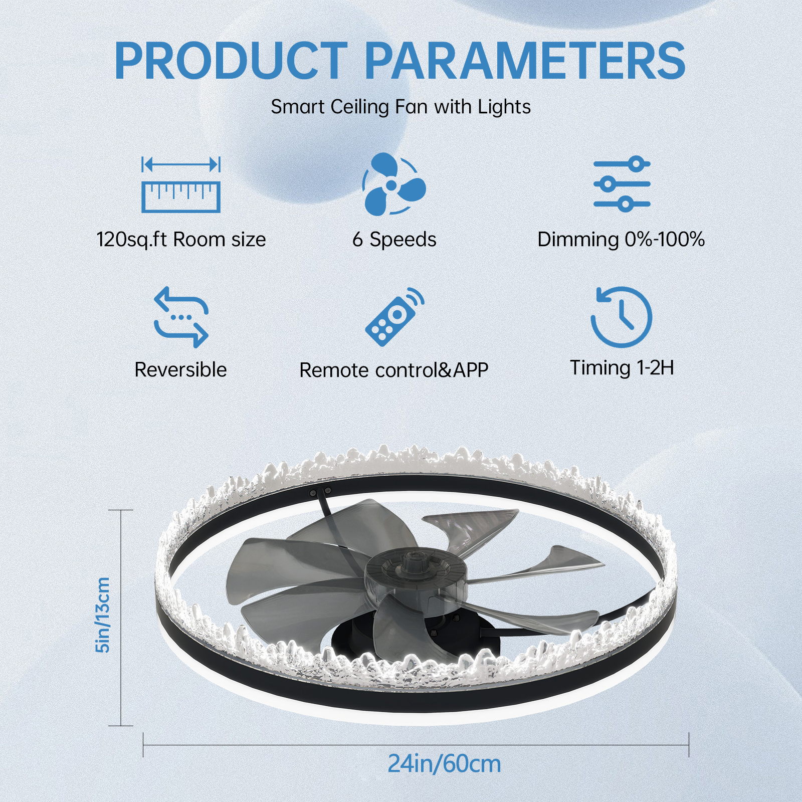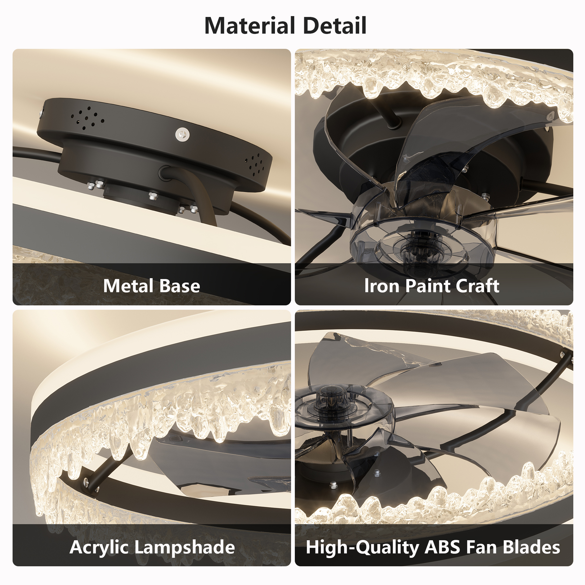2-in-1 Ceiling Fan with Light:This modern ceiling fixture combines a powerful fan and an LED ceiling light in one sleek unit, saving space while enhancing both lighting and airflow. Perfect for rooms where functionality meets style.Crystal-Inspired Decorative Edge: Features a unique ice crystal-like edge design that adds elegance and a luxurious touch to any space-ideal for bedrooms, living rooms, or dining areas looking for a modern upgrade.Dimmable LED & Adjustable Color Temperature: Easily adjust brightness and color temperature (warm, neutral, and cool white) with the included remote. Create the perfect ambiance for relaxation, work, or entertainment.Quiet & Efficient Fan with Hidden Blades: Equipped with a low-noise motor and invisible blades that provide powerful airflow without compromising on style or peace. Ideal for quiet environments like bedrooms or nurseries.Easy to Remote Control and APP Control & Timer Function: Comes with a user-friendly remote that allows you to control fan speed, light brightness, and set a timer-all from the comfort of your couch or bed.