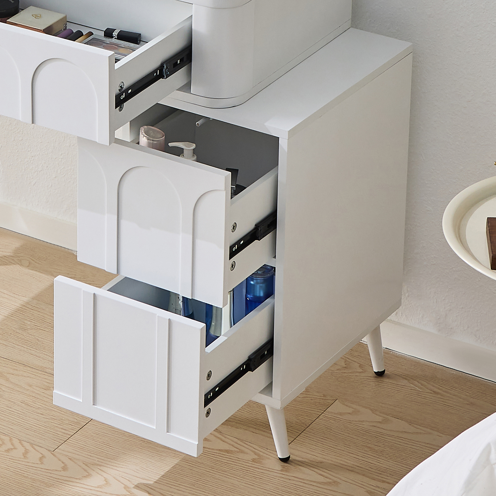 - Elegant Design with Unique Fluted Waveform Panels: The vanity table features distinctive fluted waveform panels, adding a touch of elegance and sophistication. The glossy finish tabletop and rounded corners ensure comfort and easy cleaning. The drawers are equipped with an upgraded magnetic rebound mechanism and a push-to-pop design, ensuring effortless opening and closing. This thoughtful design combines style and functionality, making it a perfect addition to any bedroom or bathroom.