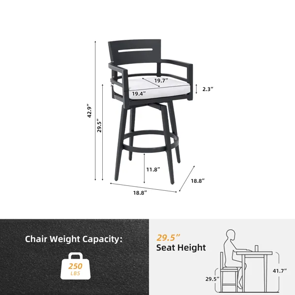 Premium Aluminum Frame – Crafted from high-quality aluminum, this modern outdoor swivel bar chair is rust-resistant, easy to clean, and built for durability. The Ember Black powder-coated finish enhances weather resistance and longevity.