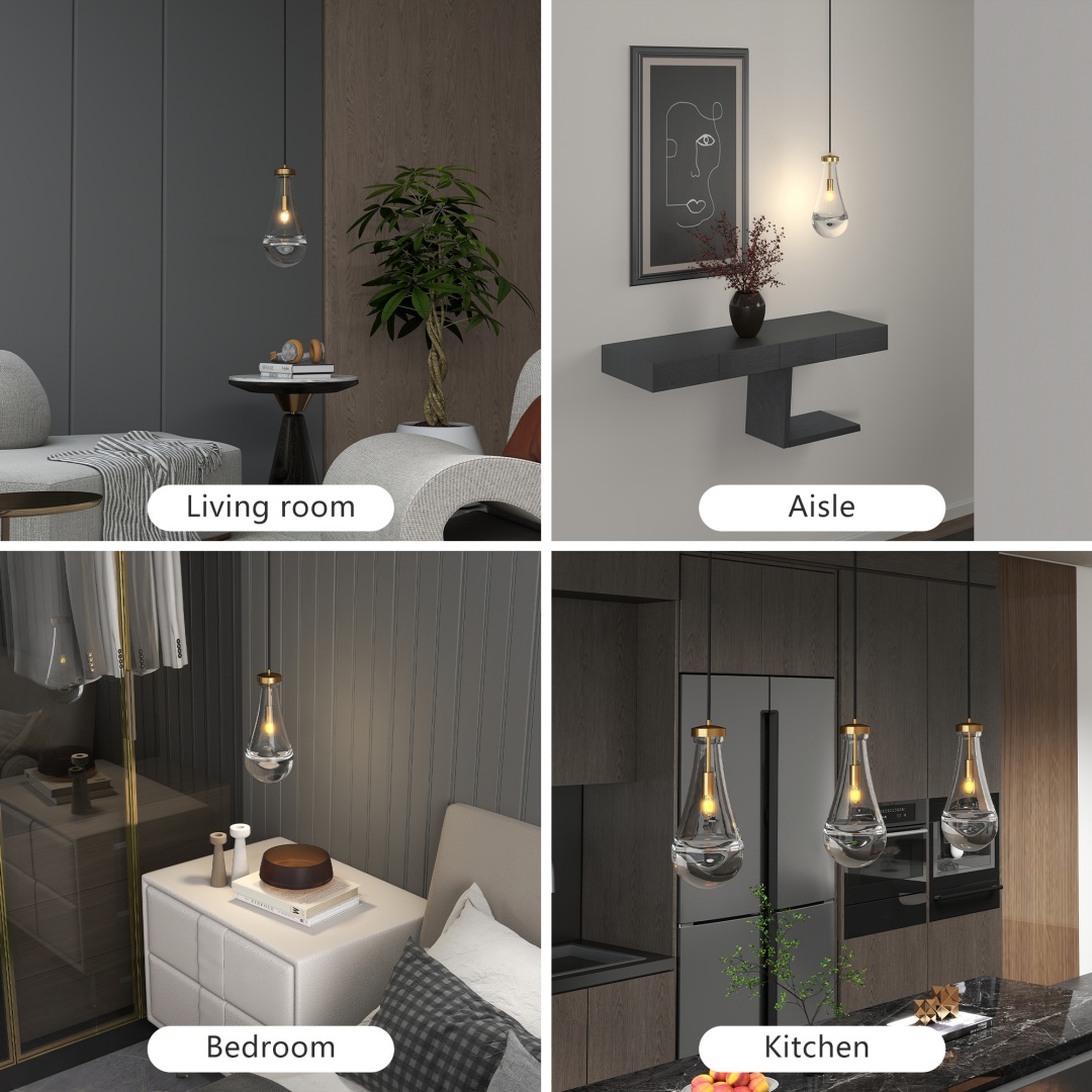[Handmade Raindrop Glass Lampshade]The unique and beautiful raindrop glass shade can not only light up the darkness better but also decorate your house well. Whether it's a modern style decoration or a vintage farmhouse style, these brass pendant lights can fit in perfectly.[Thickened Material]All the external metal parts of this pendant lights kitchen island are made of copper, which makes this kitchen light fixtures more textured. The hand-blown glass shade makes each island lights for kitchen a unique presence. The bottom of the raindrop glass shade is thicker, making the light softer.[Bigger Size]The chandeliers for foyer all-brass base has a diameter of 5"; the raindrop glass measures 5"x11"; the bigger size of the dining room light allows you to get a better light effect.[Widely Applicable]The luxurious design of the entryway chandelier is not only suitable for home use, but also commercial use. For example, it can be used in a kitchen island, kitchen sink, Breakfast Area, dining room, bedroom, indoor, ceiling, living room, doorway entryway, corridor, foyer, bar, counters Desk, Reception Desk, restaurants, galleries, exhibition room, hotel, coffee shop, office.