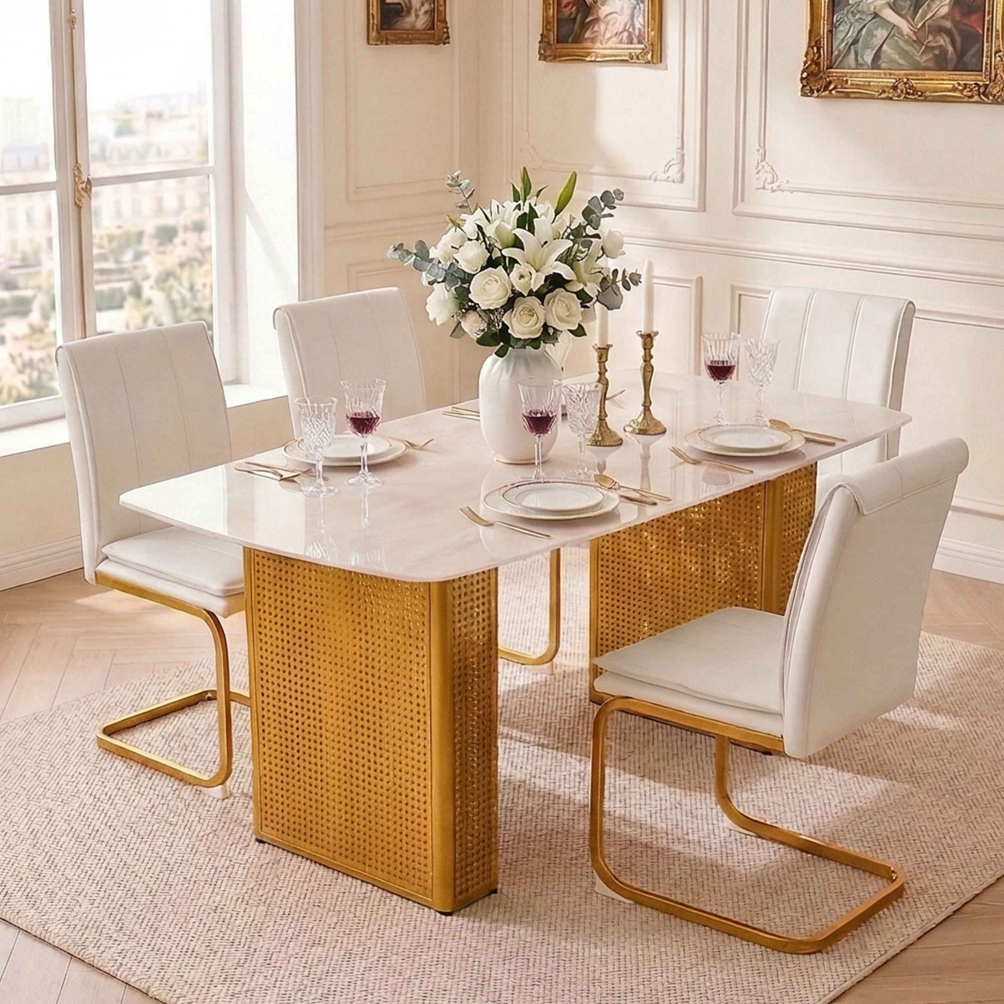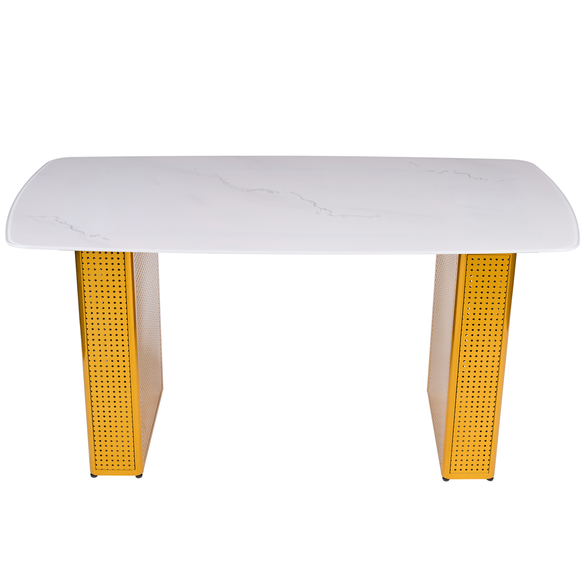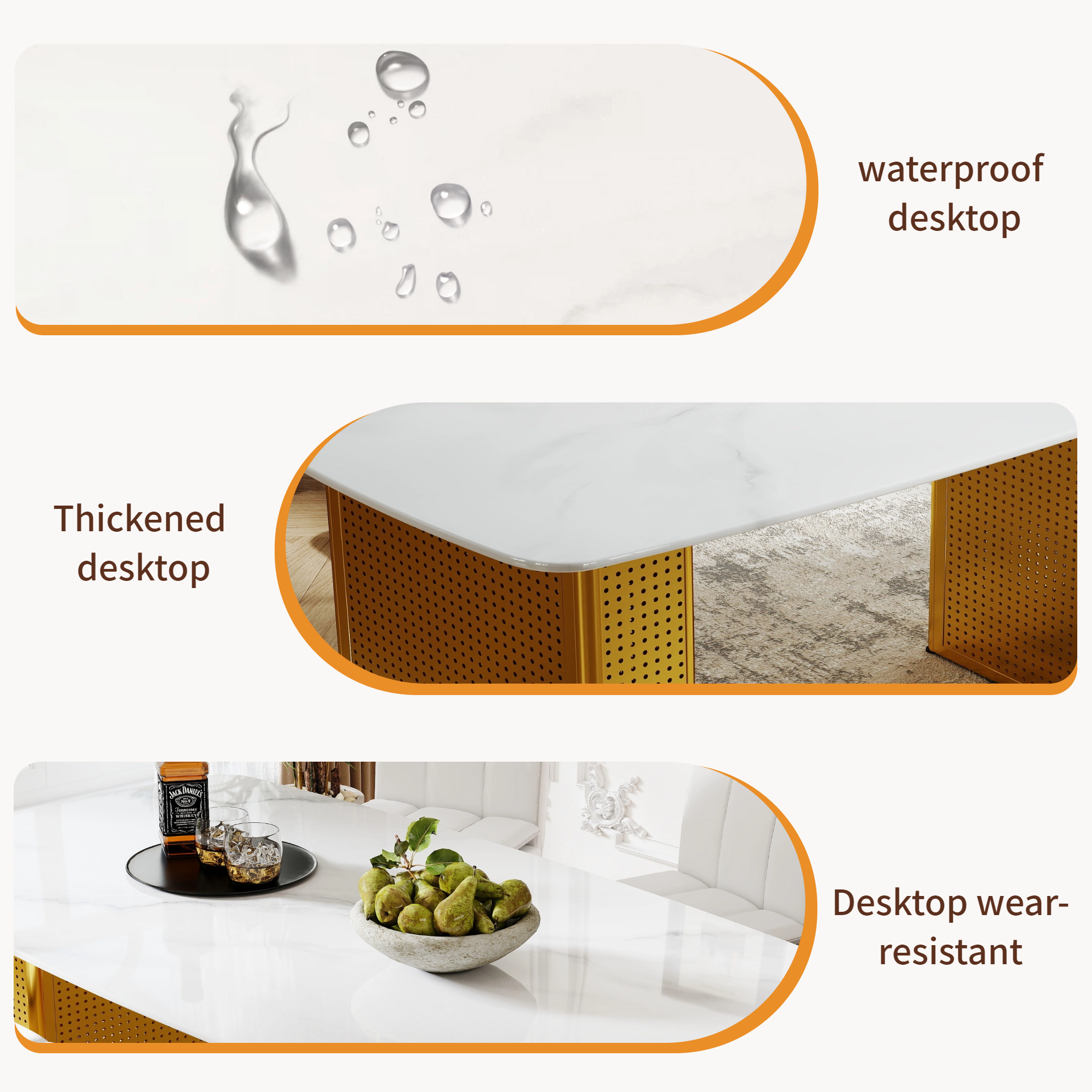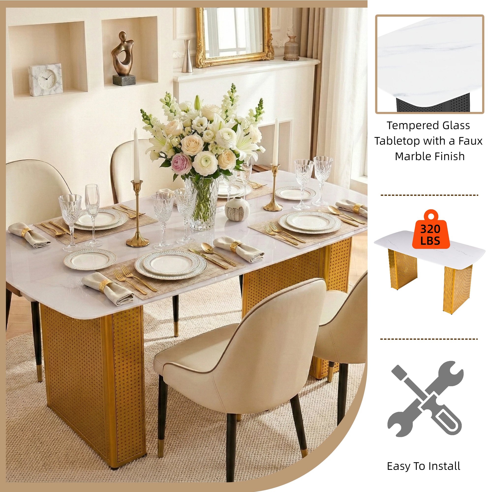 Product Name:Modern Rectangular Tempered Glass Dining Table, Marble-Patterned Design with Gold Dual-Pedestal Metal Base, Ideal for Dining Room & Home Office