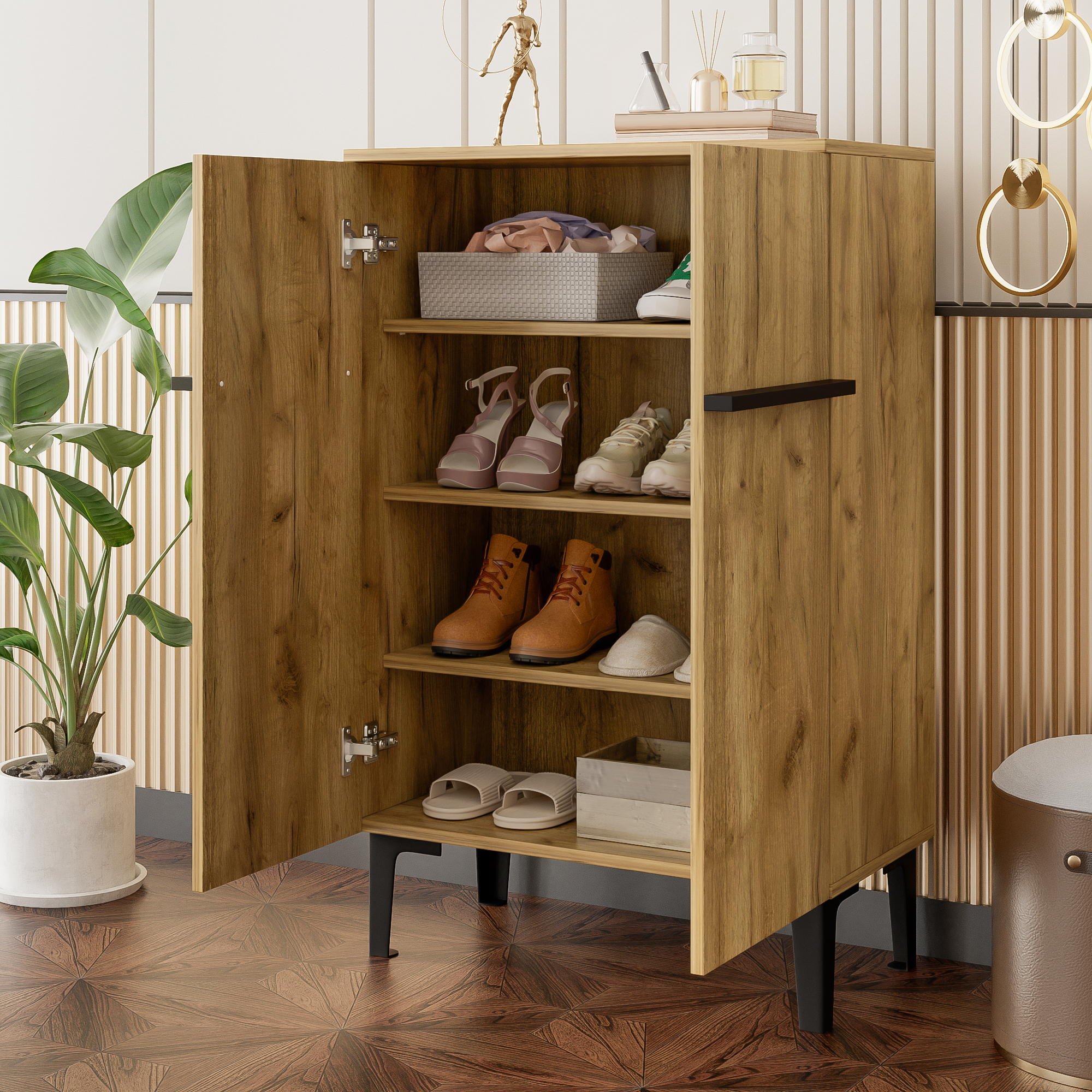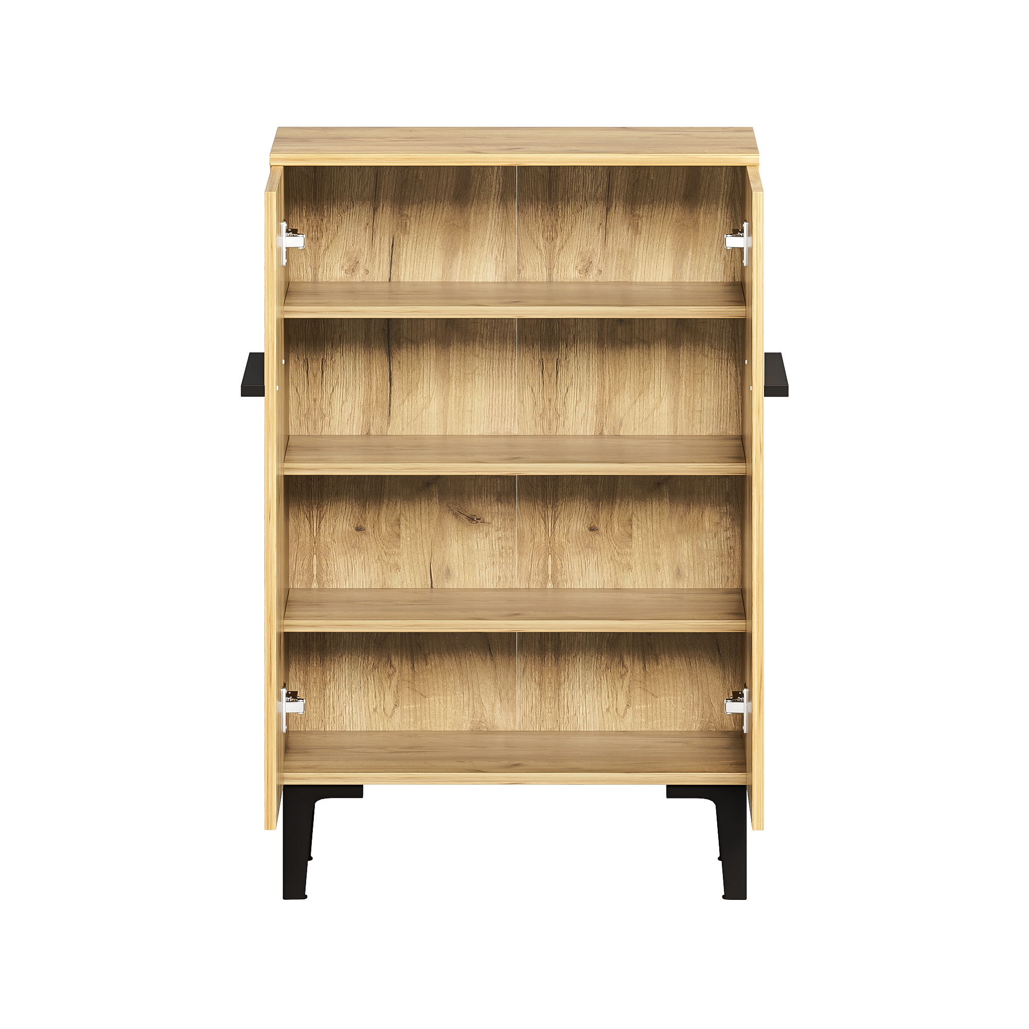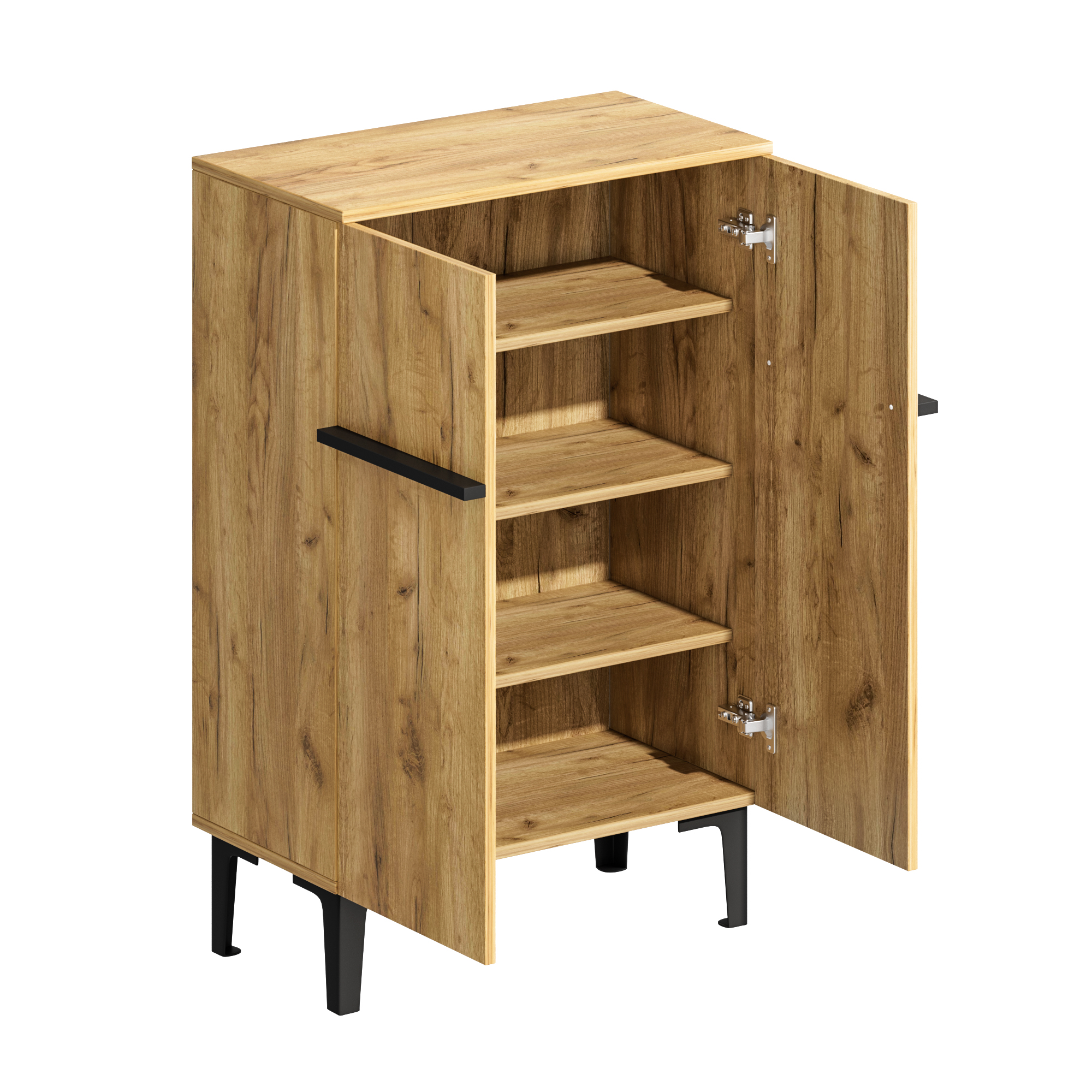 This modern shoe cabinet combines functionality with a clean, minimalist design, making it an excellent solution for maintaining an organized entryway. The overall look features a natural wood texture that blends seamlessly into a wide range of interior styles. The double-door structure ensures a neat appearance, while the long black handles add a contemporary touch and make opening and closing the doors especially convenient. With a height of 95 cm, a width of 60 cm, and a depth of 34.5 cm, this shoe cabinet offers generous storage capacity despite its compact footprint. Inside, multiple shelves provide flexible organization. The spacing between the shelves is carefully designed to accommodate various types of footwear.The usable internal height of 78 cm allows you to fully utilize the space and makes this cabinet suitable for households of different sizes. The black PVC legs enhance the modern design and elevate the cabinet slightly, giving it a light, floating appearance. This raised design also makes cleaning the floor underneath effortless—a practical benefit especially appreciated in busy entryway areas. Ideal for hallways, foyers, and narrower spaces, this shoe cabinet provides essential storage while occupying minimal floor space. Its carefully crafted structure keeps footwear organized, protected, and easy to access. With its modern styling, flexible interior, and everyday convenience, this cabinet is a functional and stylish addition to any home seeking order and practicality in the entryway.