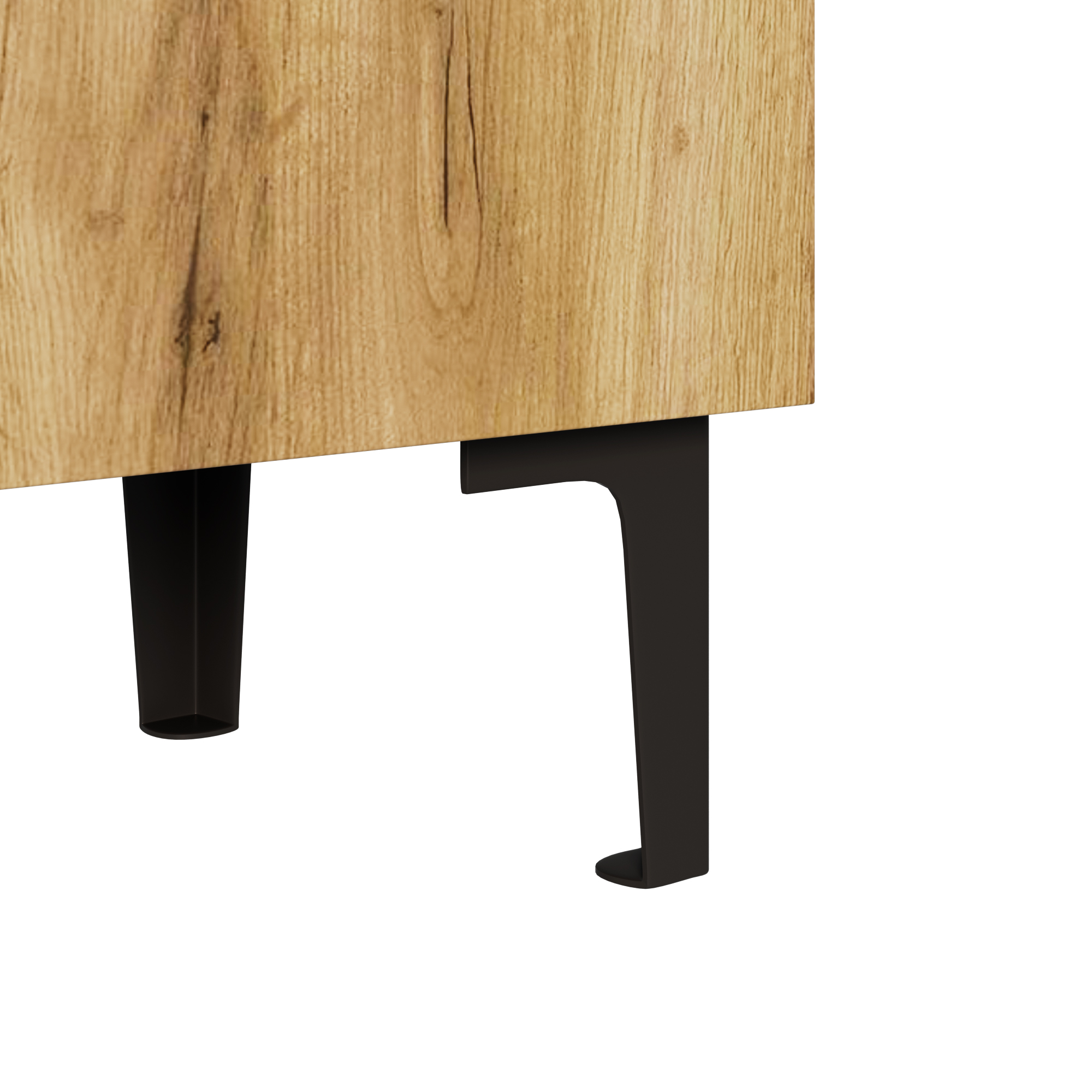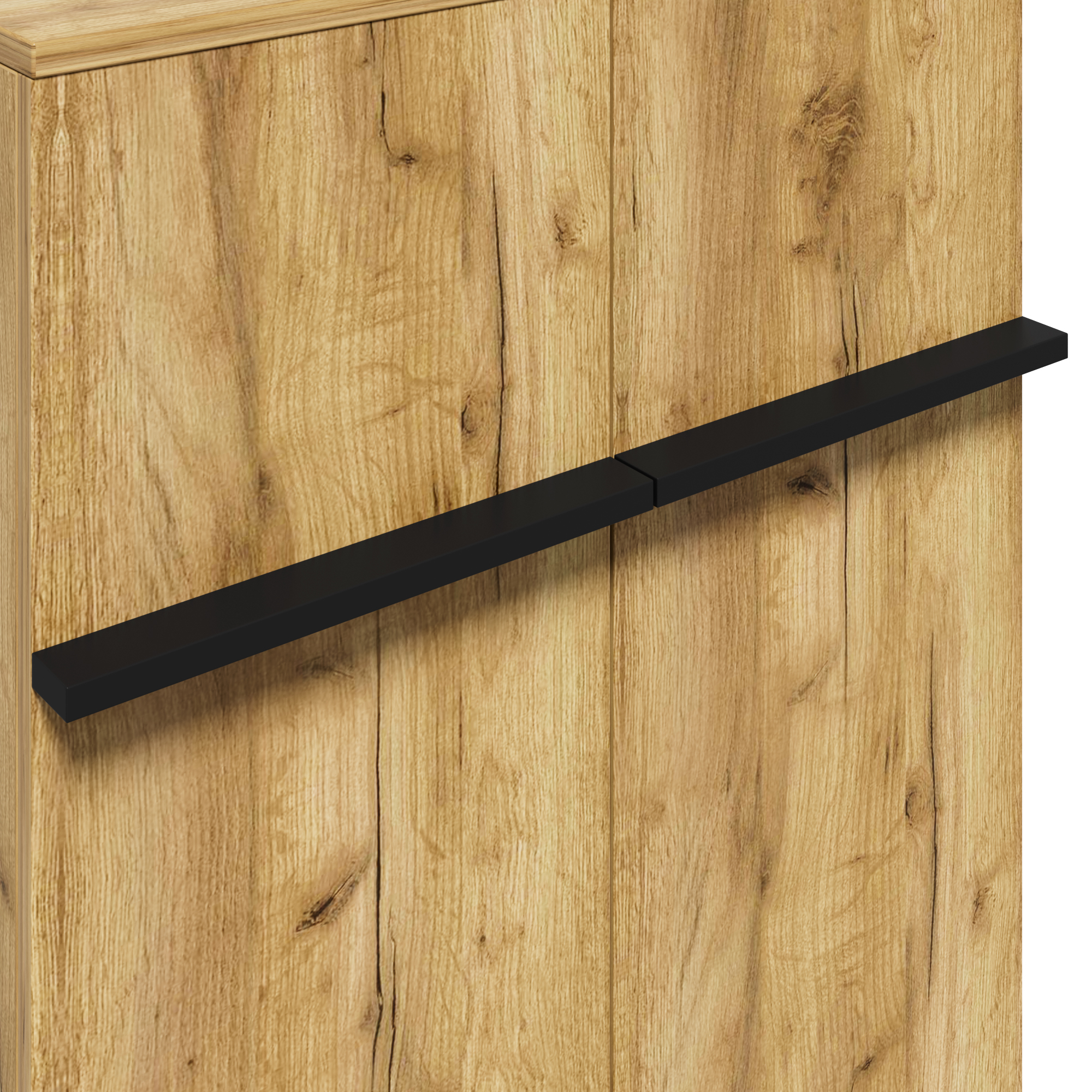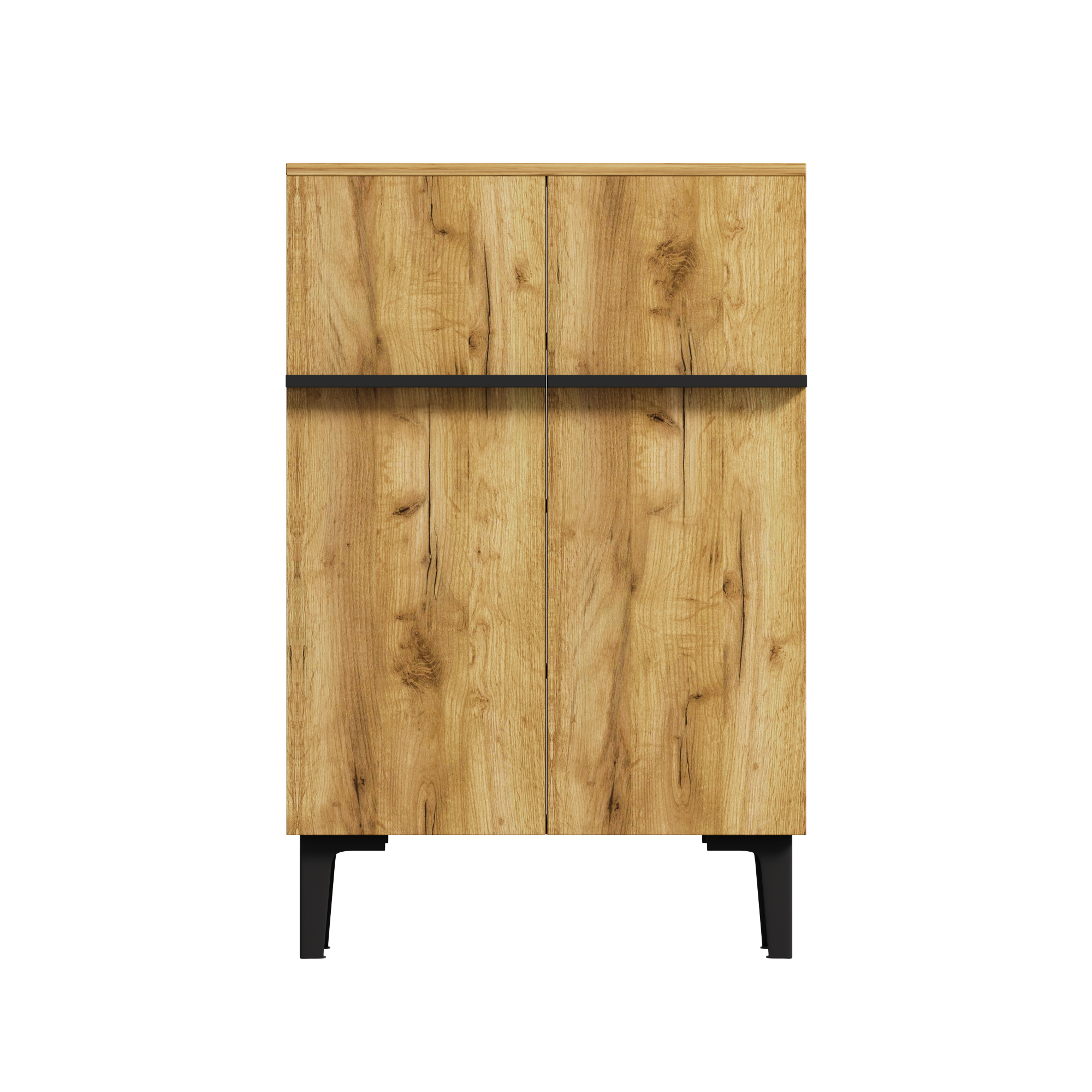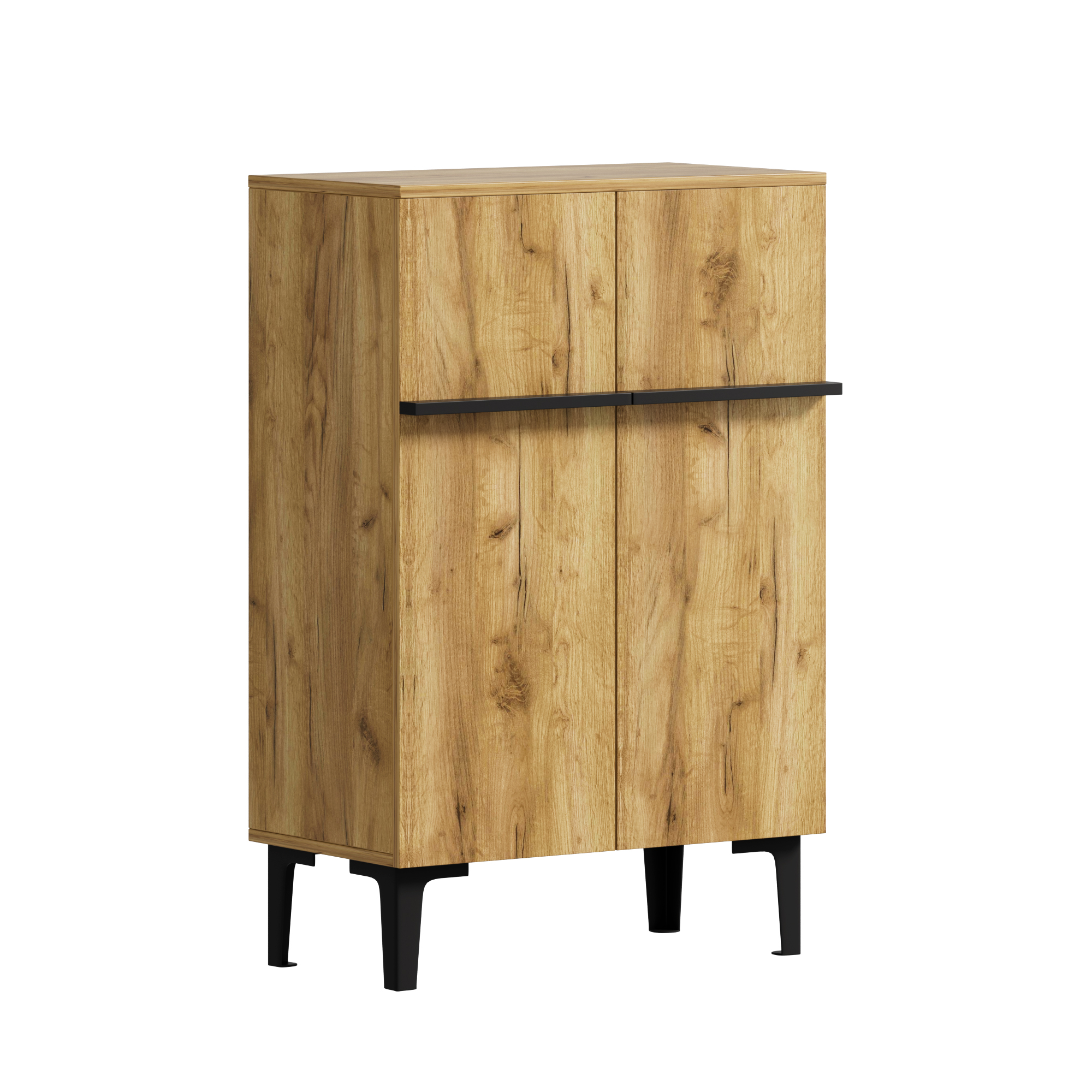 This modern shoe cabinet combines functionality with a clean, minimalist design, making it an excellent solution for maintaining an organized entryway. The overall look features a natural wood texture that blends seamlessly into a wide range of interior styles. The double-door structure ensures a neat appearance, while the long black handles add a contemporary touch and make opening and closing the doors especially convenient. With a height of 95 cm, a width of 60 cm, and a depth of 34.5 cm, this shoe cabinet offers generous storage capacity despite its compact footprint. Inside, multiple shelves provide flexible organization. The spacing between the shelves is carefully designed to accommodate various types of footwear.The usable internal height of 78 cm allows you to fully utilize the space and makes this cabinet suitable for households of different sizes. The black PVC legs enhance the modern design and elevate the cabinet slightly, giving it a light, floating appearance. This raised design also makes cleaning the floor underneath effortless—a practical benefit especially appreciated in busy entryway areas. Ideal for hallways, foyers, and narrower spaces, this shoe cabinet provides essential storage while occupying minimal floor space. Its carefully crafted structure keeps footwear organized, protected, and easy to access. With its modern styling, flexible interior, and everyday convenience, this cabinet is a functional and stylish addition to any home seeking order and practicality in the entryway.